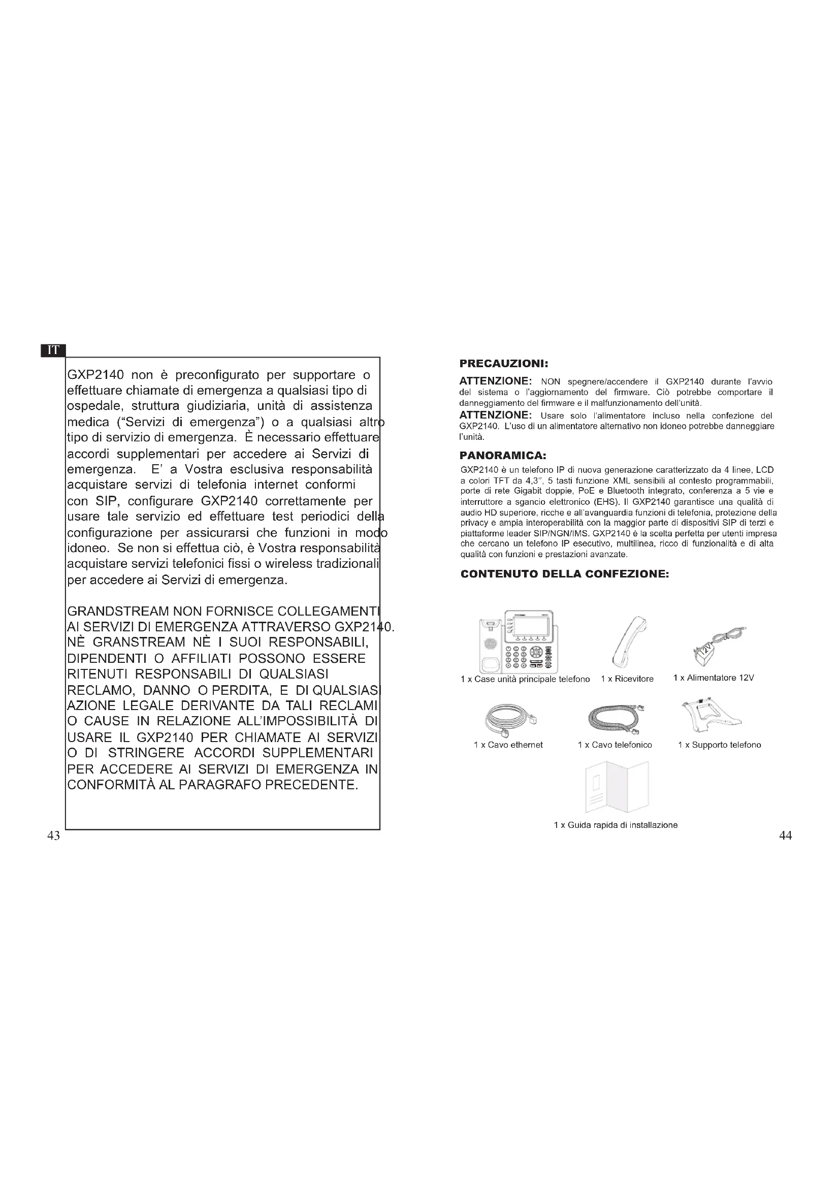 GXP2140 è un telefono IP di nuova generazione caratterizzato da 4 linee, LCD a colori TFT da 4,3’’, 5 tasti funzione XML sensibili al contesto programmabili, porte di rete Gigabit doppie, PoE e Bluetooth integrato, conferenza a 5 vie e interruttore a sgancio elettronico (EHS). Il GXP2140 garantisce una qualità di audio HD superiore, ricche e all’avanguardia funzioni di telefonia, protezione della privacy e ampia interoperabilità con la maggior parte di dispositivi SIP di terzi e piattaforme leader SIP/NGN/IMS. GXP2140 è la scelta perfetta per utenti impresa che cercano un telefono IP esecutivo, multilinea, ricco di funzionalità e di alta qualità con funzioni e prestazioni avanzate. CONTENUTO DELLA CONFEZIONE: PANORAMICA: ATTENZIONE: NON spegnere/accendere il GXP2140 durante l’avvio del sistema o l’aggiornamento del rmware. Ciò potrebbe comportare il danneggiamento del rmware e il malfunzionamento dell’unità. ATTENZIONE: Usare solo l’alimentatore incluso nella confezione del GXP2140. L’uso di un alimentatore alternativo non idoneo potrebbe danneggiare l’unità. 1 x Case unità principale telefono 1 x Cavo telefonico1 x Cavo ethernet 1 x Supporto telefono 1 x Alimentatore 12V 1 x Guida rapida di installazione PRECAUZIONI: 1 x Ricevitore 12V GRANDSTREAM GXP214045 MONTAGGIO TELEFONO: Installazione del telefono (montaggio a parete* venduto separatamente):