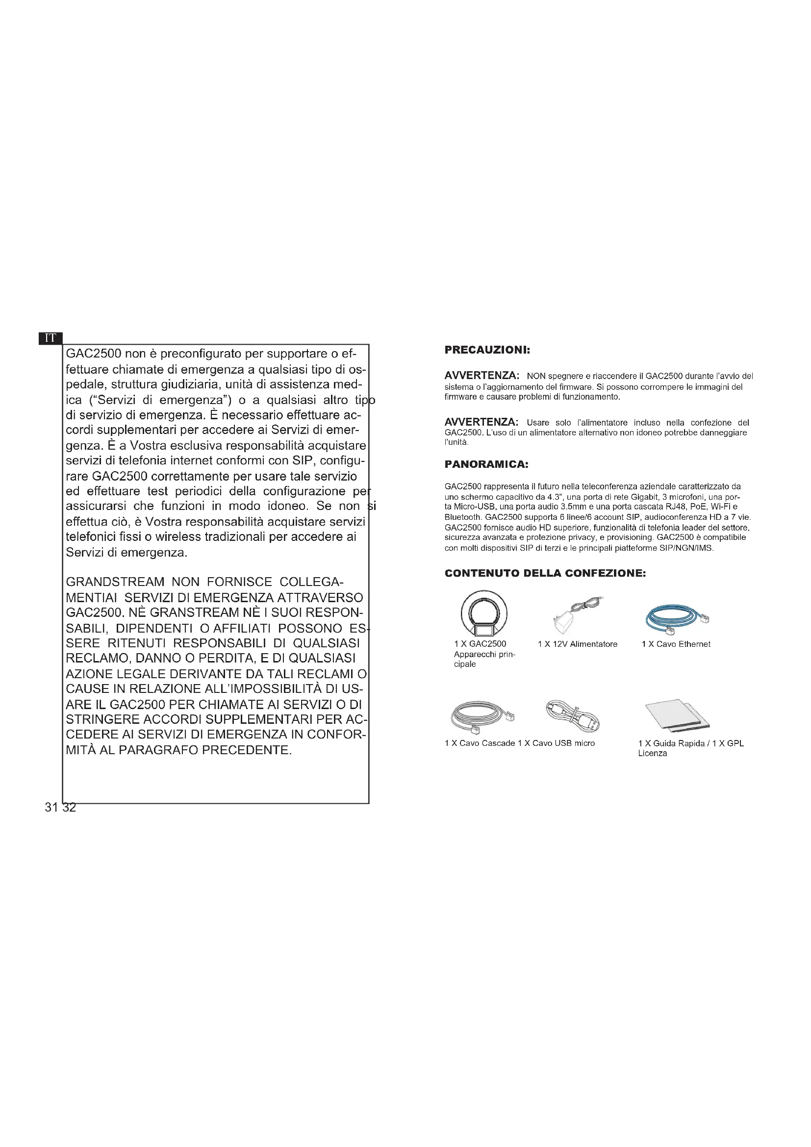 kontaktieren Sie Ihren ITSP (Internet Telephony Service Provider) für weitere mögliche Informationen die Sie zur Installation benötigen. GERÄTEKONFIGURATION: Kongurieren Sie das GAC2500 über einen Webbrowser: Konguration des GAC2500 über den Touch-Screen:31 32 GAC2500 non è precongurato per supportare o ef- fettuare chiamate di emergenza a qualsiasi tipo di os- pedale, struttura giudiziaria, unità di assistenza med- ica (“Servizi di emergenza”) o a qualsiasi altro tipo di servizio di emergenza. È necessario eettuare ac- cordi supplementari per accedere ai Servizi di emer- genza. È a Vostra esclusiva responsabilità acquistare servizi di telefonia internet conformi con SIP, congu- rare GAC2500 correttamente per usare tale servizio ed eettuare test periodici della congurazione per assicurarsi che funzioni in modo idoneo. Se non si eettua ciò, è Vostra responsabilità acquistare servizi telefonici ssi o wireless tradizionali per accedere ai Servizi di emergenza.