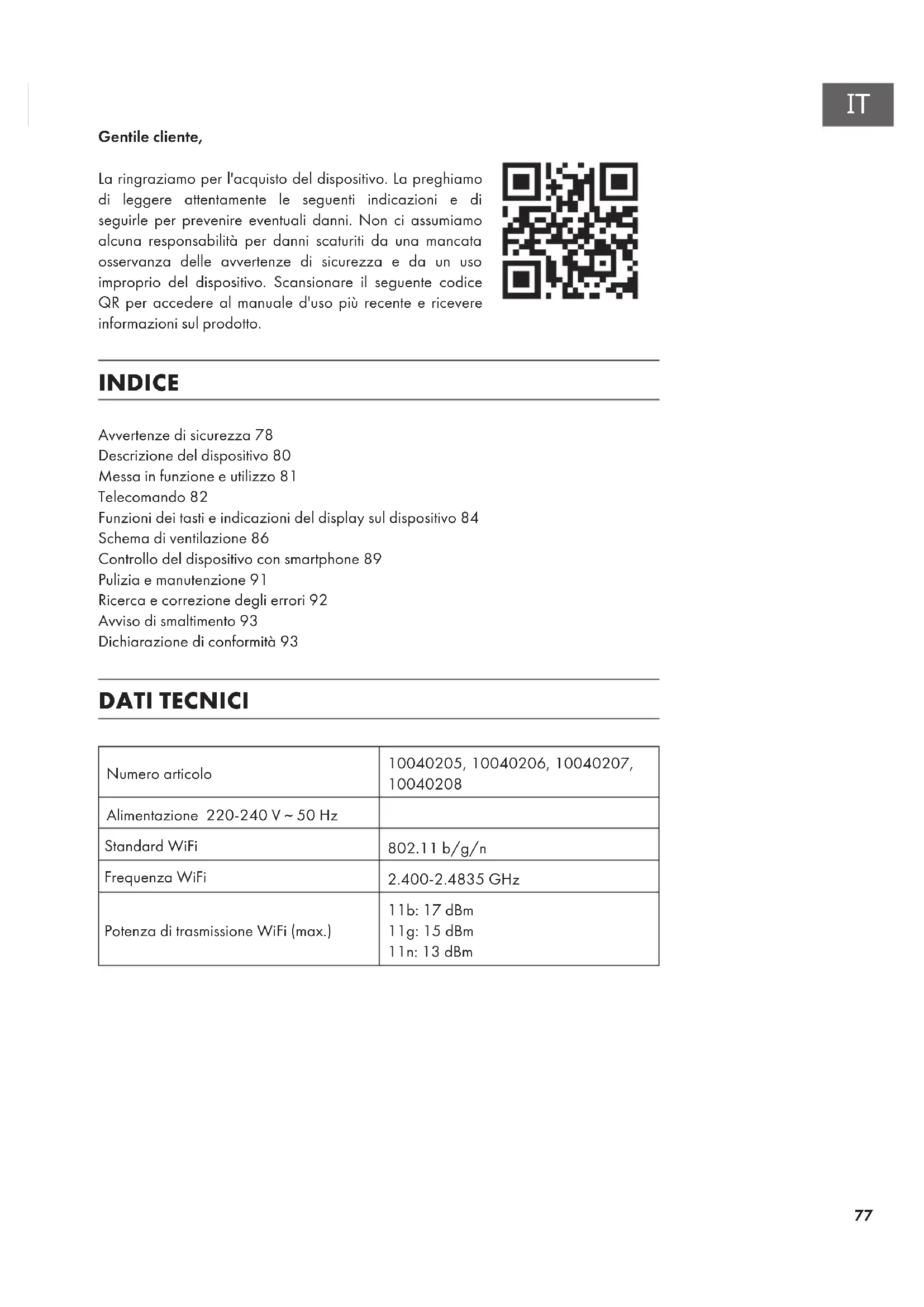 Gentile cliente, La ringraziamo per l'acquisto del dispositivo. La preghiamo di leggere attentamente le seguenti indicazioni e di seguirle per prevenire eventuali danni. Non ci assumiamo alcuna responsabilità per danni scaturiti da una mancata osservanza delle avvertenze di sicurezza e da un uso improprio del dispositivo. Scansionare il seguente codice QR per accedere al manuale d'uso più recente e ricevere informazioni sul prodotto. INDICE Avvertenze di sicurezza 78 Descrizione del dispositivo 80 Messa in funzione e utilizzo 81 Telecomando 82 Funzioni dei tasti e indicazioni del display sul dispositivo 84 Schema di ventilazione 86 Controllo del dispositivo con smartphone 89 Pulizia e manutenzione 91 Ricerca e correzione degli errori 92 Avviso di smaltimento 93 Dichiarazione di conformità 93 DATI TECNICI Numero articolo 10040205, 10040206, 10040207,