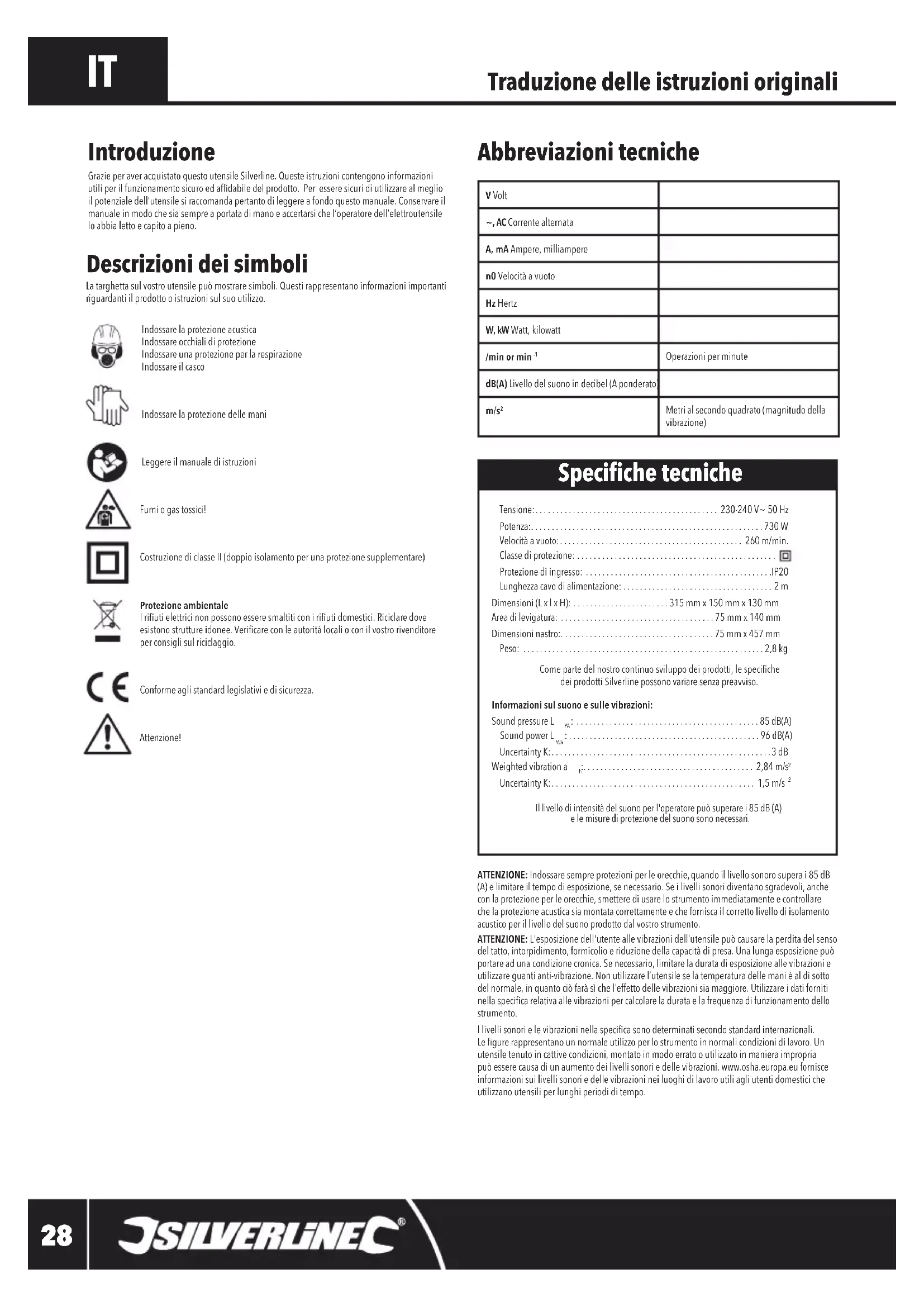 ATTENZIONE:Indossaresempreprotezioniperleorecchie,quandoillivellosonorosuperai85dB (A) e limitare il tempo di esposizione, se necessario. Se i livelli sonori diventano sgradevoli, anche con la protezione per le orecchie, smettere di usare lo strumento immediatamente e controllare che la protezione acustica sia montata correttamente e che fornisca il corretto livello di isolamento acustico per il livello del suono prodotto dal vostro strumento. ATTENZIONE: L'esposizionedell'utenteallevibrazionidell’utensilepuòcausarelaperditadelsenso deltatto,intorpidimento,formicolioeriduzionedellacapacitàdipresa.Unalungaesposizionepuòportare ad una condizione cronica. Se necessario, limitare la durata di esposizione alle vibrazioni e utilizzareguantianti-vibrazione.Nonutilizzarel’utensileselatemperaturadellemanièaldisottodelnormale,inquantociòfaràsìchel’effettodellevibrazionisiamaggiore.Utilizzareidatifornitinellaspecicarelativaallevibrazionipercalcolareladurataelafrequenzadifunzionamentodellostrumento.Ilivellisonorielevibrazioninellaspecicasonodeterminatisecondostandardinternazionali.Legurerappresentanounnormaleutilizzoperlostrumentoinnormalicondizionidilavoro.Unutensile tenuto in cattive condizioni, montato in modo errato o utilizzato in maniera impropria puòesserecausadiunaumentodeilivellisonoriedellevibrazioni.www.osha.europa.eufornisceinformazioni sui livelli sonori e delle vibrazioni nei luoghi di lavoro utili agli utenti domestici che utilizzano utensili per lunghi periodi di tempo. Traduzione delle istruzioni originali Abbreviazioni tecniche Descrizioni dei simboli Latarghettasulvostroutensilepuòmostraresimboli.Questirappresentanoinformazioniimportantiriguardanti il prodotto o istruzioni sul suo utilizzo.Indossare la protezione acusticaIndossare occhiali di protezioneIndossare una protezione per la respirazioneIndossare il cascoIndossare la protezione delle maniLeggere il manuale di istruzioniFumiogastossici!Costruzione di classe II (doppio isolamento per una protezione supplementare)Protezione ambientale Iriutielettricinonpossonoesseresmaltiticoniriutidomestici.Riciclaredoveesistonostruttureidonee.Vericareconleautoritàlocalioconilvostrorivenditoreper consigli sul riciclaggio.Conforme agli standard legislativi e di sicurezza.Attenzione! Introduzione GrazieperaveracquistatoquestoutensileSilverline.Questeistruzionicontengonoinformazioniutiliperilfunzionamentosicuroedafdabiledelprodotto.Peresseresicuridiutilizzarealmeglioilpotenzialedell’utensilesiraccomandapertantodileggereafondoquestomanuale.Conservareilmanualeinmodochesiasempreaportatadimanoeaccertarsichel’operatoredell’elettroutensilelo abbia letto e capito a pieno.