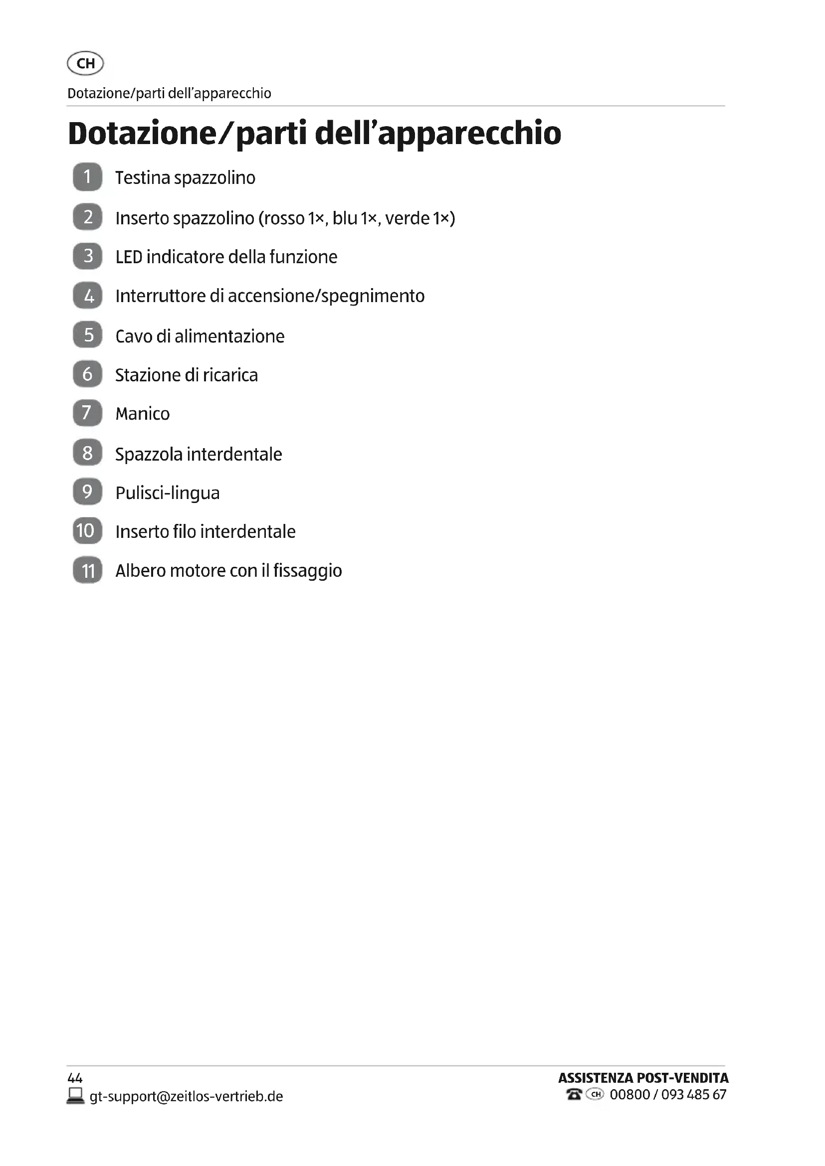 00800 / 093 485 67 La pulizia e la manutenzione da parte dell’utente non devono essere eseguite dai bambini, a meno che non siano sorvegliati. − Tenere lontano i bambini minori di otto anni dallo spazzolino da denti e dal cavo di collegamento. − Evitare che i bambini giochino con la pellicola d’imballaggio. Potrebbero restarvi intrappolati e soffocare. − Supervisionare i bambini per essere sicuri che non giochino con lo spazzolino da denti. AVVERTENZA! Pericolo di esplosione! Se vengono surriscaldate, batterie ricaricabili possono esplodere. − Non surriscaldare le batterie ricaricabili e non gettarle nel fuoco. ATTENZIONE! Pericolo di ferimento! Un utilizzo non conforme alla destinazione d’uso dello spazzolino da denti potrebbe provocare ferimenti. − Posare il cavo di alimentazione in modo tale che non vi si possa inciampare. − Sostituire immediatamente gli inserti dello spazzolino usurati o danneggiati per evitare lesioni alla bocca e ai denti. − Osservare le norme di pulizia dei denti. AVVISO! Pericolo di danneggiamento! L’uso improprio può danneggiare lo spazzolino da denti. − Non lasciar cadere il manico. Se ciò accade, non utilizzare più lo spazzolino da denti. Farlo controllare in un centro assistenza autorizzato.Preliminari