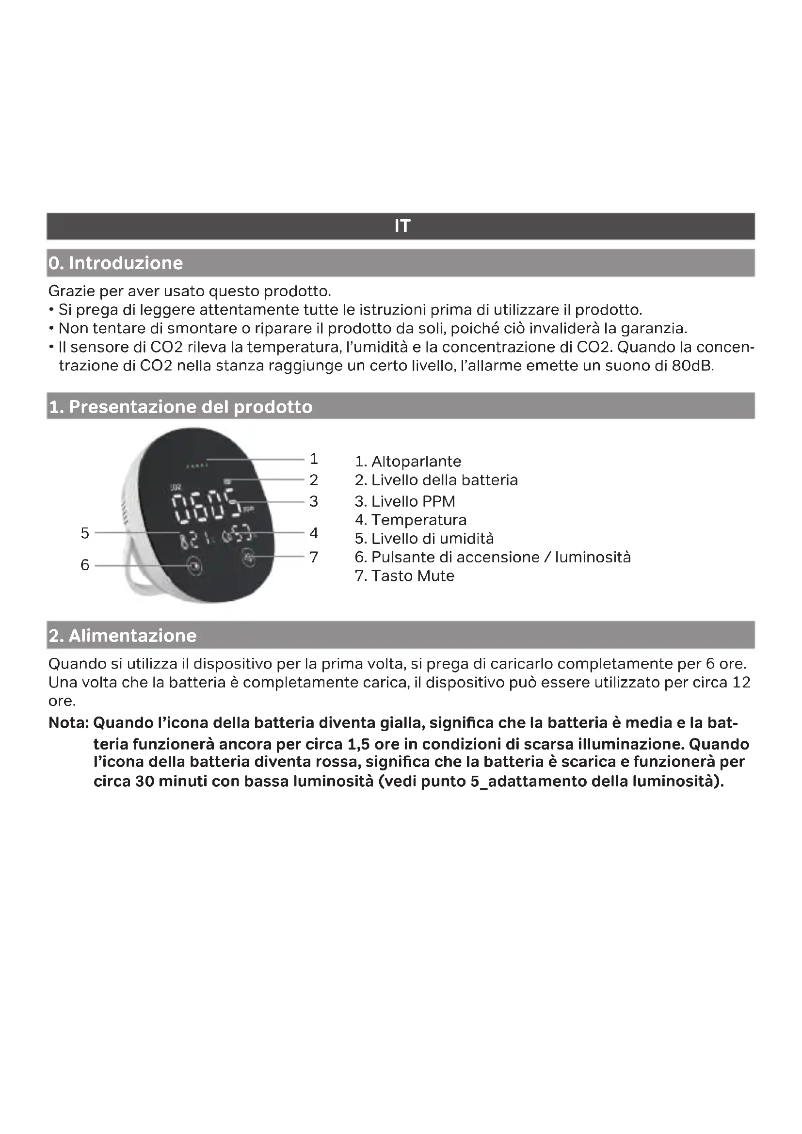 - Il sensore di CO2 rileva la temperatura, l’umidità e la concentrazione di CO2. Quando la concen- trazione di CO2 nella stanza raggiunge un certo livello, l’allarme emette un suono di 80dB. Quando si utilizza il dispositivo per la prima volta, si prega di caricarlo completamente per 6 ore. Una volta che la batteria è completamente carica, il dispositivo può essere utilizzato per circa 12 ore.