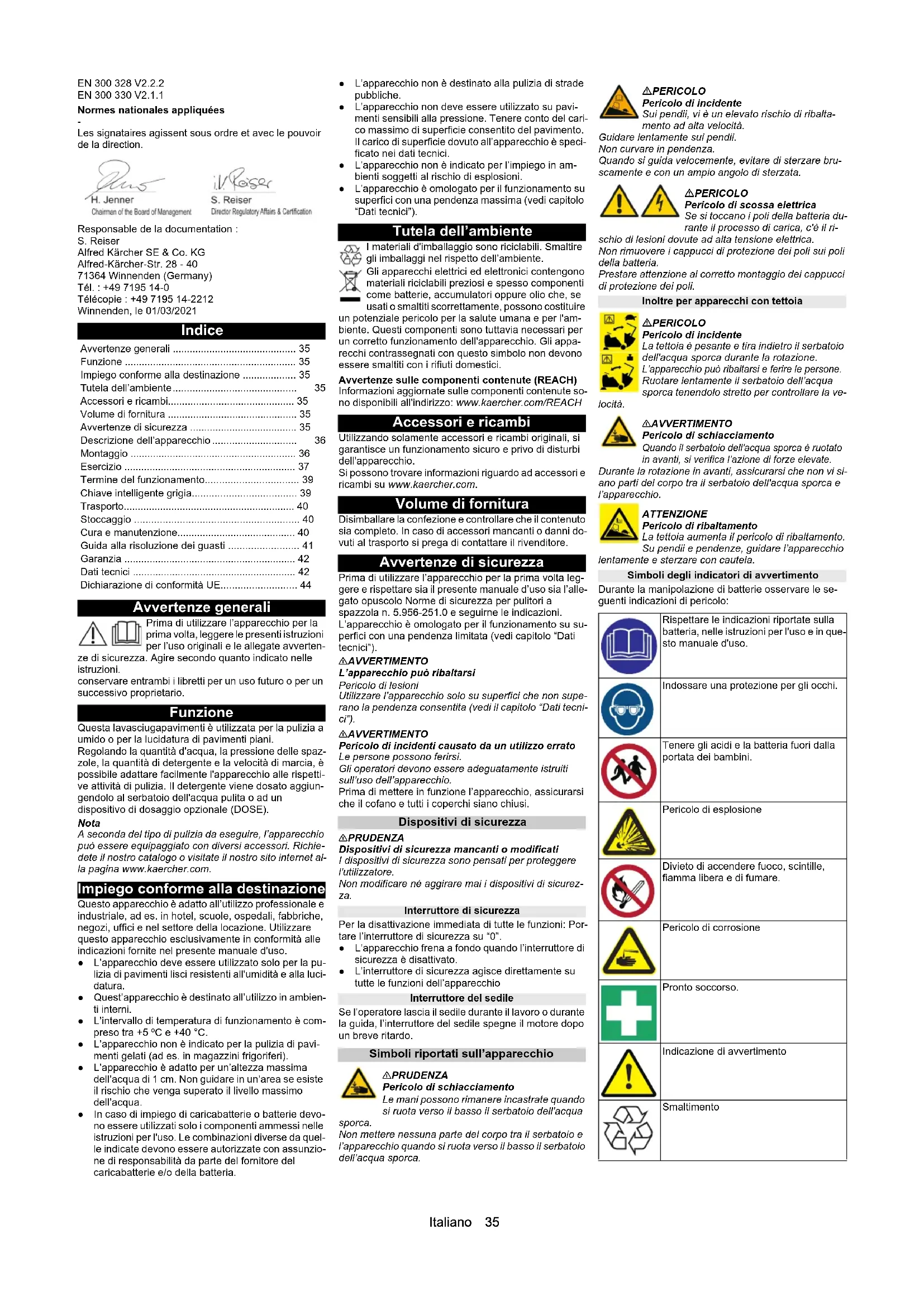 - Les signataires agissent sous ordre et avec le pouvoir de la direction. Responsable de la documentation : S. Reiser Alfred Kärcher SE & Co. KG Alfred-Kärcher-Str. 28 - 40 71364 Winnenden (Germany) Tél. : +49 7195 14-0 Télécopie : +49 7195 14-2212 Winnenden, le 01/03/2021 Indice Avvertenze generali Prima di utilizzare l’apparecchio per la prima volta, leggere le presenti istruzioni per l’uso originali e le allegate avverten- ze di sicurezza. Agire secondo quanto indicato nelle istruzioni. conservare entrambi i libretti per un uso futuro o per un successivo proprietario. Funzione Questa lavasciugapavimenti è utilizzata per la pulizia a umido o per la lucidatura di pavimenti piani. Regolando la quantità d'acqua, la pressione delle spaz- zole, la quantità di detergente e la velocità di marcia, è possibile adattare facilmente l'apparecchio alle rispetti- ve attività di pulizia. Il detergente viene dosato aggiun- gendolo al serbatoio dell'acqua pulita o ad un dispositivo di dosaggio opzionale (DOSE). Nota A seconda del tipo di pulizia da eseguire, l’apparecchio può essere equipaggiato con diversi accessori. Richie- dete il nostro catalogo o visitate il nostro sito internet al- la pagina www.kaercher.com. Impiego conforme alla destinazione Questo apparecchio è adatto all’utilizzo professionale e industriale, ad es. in hotel, scuole, ospedali, fabbriche, negozi, uffici e nel settore della locazione. Utilizzare questo apparecchio esclusivamente in conformità alle indicazioni fornite nel presente manuale d'uso. ● L’apparecchio deve essere utilizzato solo per la pu- lizia di pavimenti lisci resistenti all'umidità e alla luci- datura. ● Quest’apparecchio è destinato all’utilizzo in ambien- ti interni. ● L’intervallo di temperatura di funzionamento è com- preso tra +5 ºC e +40 °C. ● L’apparecchio non è indicato per la pulizia di pavi- menti gelati (ad es. in magazzini frigoriferi). ● L’apparecchio è adatto per un’altezza massima dell’acqua di 1 cm. Non guidare in un’area se esiste il rischio che venga superato il livello massimo dell’acqua. ● In caso di impiego di caricabatterie o batterie devo- no essere utilizzati solo i componenti ammessi nelle istruzioni per l'uso. Le combinazioni diverse da quel- le indicate devono essere autorizzate con assunzio- ne di responsabilità da parte del fornitore del caricabatterie e/o della batteria. ● L’apparecchio non è destinato alla pulizia di strade pubbliche. ● L’apparecchio non deve essere utilizzato su pavi- menti sensibili alla pressione. Tenere conto del cari- co massimo di superficie consentito del pavimento. Il carico di superficie dovuto all’apparecchio è speci- ficato nei dati tecnici. ● L’apparecchio non è indicato per l’impiego in am- bienti soggetti al rischio di esplosioni. ● L’apparecchio è omologato per il funzionamento su superfici con una pendenza massima (vedi capitolo “Dati tecnici”). Tutela dell’ambiente I materiali d'imballaggio sono riciclabili. Smaltire gli imballaggi nel rispetto dell’ambiente. Gli apparecchi elettrici ed elettronici contengono materiali riciclabili preziosi e spesso componenti come batterie, accumulatori oppure olio che, se usati o smaltiti scorrettamente, possono costituire un potenziale pericolo per la salute umana e per l'am- biente. Questi componenti sono tuttavia necessari per un corretto funzionamento dell'apparecchio. Gli appa- recchi contrassegnati con questo simbolo non devono essere smaltiti con i rifiuti domestici. Avvertenze sulle componenti contenute (REACH) Informazioni aggiornate sulle componenti contenute so- no disponibili all'indirizzo: www.kaercher.com/REACH Accessori e ricambi Utilizzando solamente accessori e ricambi originali, si garantisce un funzionamento sicuro e privo di disturbi dell'apparecchio. Si possono trovare informazioni riguardo ad accessori e ricambi su www.kaercher.com. Volume di fornitura Disimballare la confezione e controllare che il contenuto sia completo. In caso di accessori mancanti o danni do- vuti al trasporto si prega di contattare il rivenditore. Avvertenze di sicurezza Prima di utilizzare l’apparecchio per la prima volta leg- gere e rispettare sia il presente manuale d’uso sia l’alle- gato opuscolo Norme di sicurezza per pulitori a spazzola n. 5.956-251.0 e seguirne le indicazioni. L’apparecchio è omologato per il funzionamento su su- perfici con una pendenza limitata (vedi capitolo “Dati tecnici”). 몇 AVVERTIMENTO L’apparecchio può ribaltarsi Pericolo di lesioni Utilizzare l’apparecchio solo su superfici che non supe- rano la pendenza consentita (vedi il capitolo “Dati tecni- ci”). 몇 AVVERTIMENTO Pericolo di incidenti causato da un utilizzo errato Le persone possono ferirsi. Gli operatori devono essere adeguatamente istruiti sull’uso dell’apparecchio. Prima di mettere in funzione l’apparecchio, assicurarsi che il cofano e tutti i coperchi siano chiusi. Dispositivi di sicurezza 몇 PRUDENZA Dispositivi di sicurezza mancanti o modificati I dispositivi di sicurezza sono pensati per proteggere l'utilizzatore. Non modificare né aggirare mai i dispositivi di sicurez- za. Interruttore di sicurezza Per la disattivazione immediata di tutte le funzioni: Por- tare l’interruttore di sicurezza su “0”. ● L’apparecchio frena a fondo quando l’interruttore di sicurezza è disattivato. ● L’interruttore di sicurezza agisce direttamente su tutte le funzioni dell’apparecchio Interruttore del sedile Se l’operatore lascia il sedile durante il lavoro o durante la guida, l’interruttore del sedile spegne il motore dopo un breve ritardo. Simboli riportati sull’apparecchio 몇PRUDENZA Pericolo di schiacciamento Le mani possono rimanere incastrate quando si ruota verso il basso il serbatoio dell'acqua sporca. Non mettere nessuna parte del corpo tra il serbatoio e l’apparecchio quando si ruota verso il basso il serbatoio dell’acqua sporca. PERICOLO