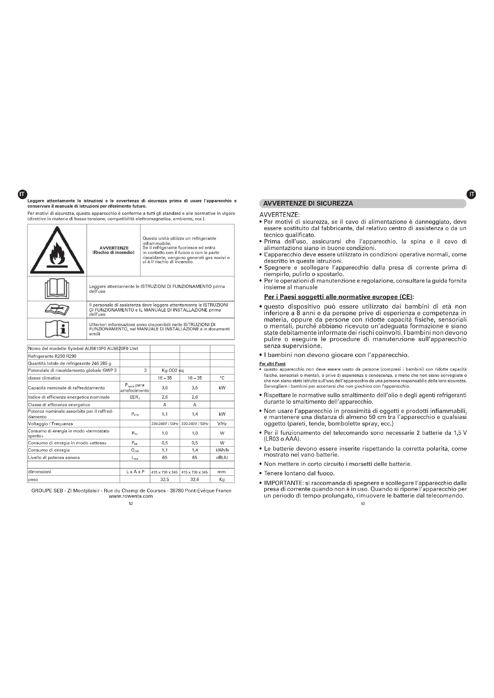 Leggere attentamente le istruzioni e le avvertenze di sicurezza prima di usare l’apparecchio e conservare il manuale di istruzioni per riferimento futuro. Per motivi di sicurezza, questo apparecchio è conforme a tutti gli standard e alle normative in vigore (direttive in materia di bassa tensione, compatibilità elettromagnetica, ambiente, ecc.). AVVERTENZE (Rischio di incendio) Questa unità utilizza un refrigerante infiammabile. Se il refrigerante fuoriesce ed entra in contatto con il fuoco o con la parte riscaldante, vengono generati gas nocivi e vi è il rischio di incendio. Leggere attentamente le ISTRUZIONI DI FUNZIONAMENTO prima dell’uso Il personale di assistenza deve leggere attentamente le ISTRUZIONI DI FUNZIONAMENTO e IL MANUALE DI INSTALLAZIONE prima dell’uso Ulteriori informazioni sono disponibili nelle ISTRUZIONI DI FUNZIONAMENTO, nel MANUALE DI INSTALLAZIONE e in documenti simili Nome del modello Symbol AU5610F0 AU5620F0 Unit Refrigerante R290 R290 Quantità totale de refrigerante 246 285 g Potenziale di riscaldamento globale GWP 3 3 Kg CO2 eq classe climatica 16 – 35 16 – 35 °C Capacità nominale di raffreddamento