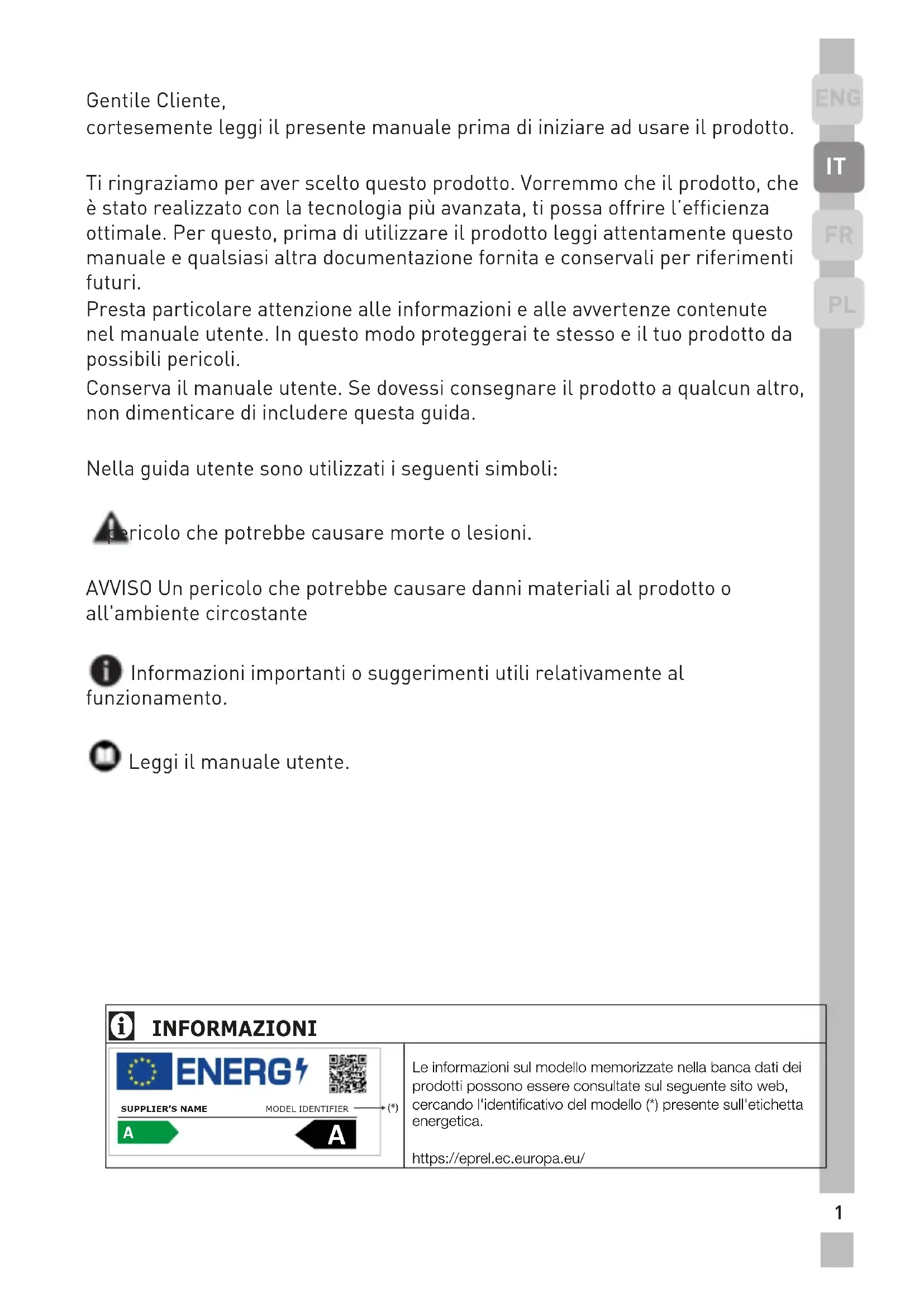 - Gentile Cliente, cortesemente leggi il presente manuale prima di iniziare ad usare il prodotto. Ti ringraziamo per aver scelto questo prodotto. Vorremmo che il prodotto, che è stato realizzato con la tecnologia più avanzata, ti possa offrire l’efficienza ottimale. Per questo, prima di utilizzare il prodotto leggi attentamente questo manuale e qualsiasi altra documentazione fornita e conservali per riferimenti futuri. Presta particolare attenzione alle informazioni e alle avvertenze contenute nel manuale utente. In questo modo proteggerai te stesso e il tuo prodotto da possibili pericoli. Conserva il manuale utente. Se dovessi consegnare il prodotto a qualcun altro, non dimenticare di includere questa guida. Nella guida utente sono utilizzati i seguenti simboli: pericolo che potrebbe causare morte o lesioni. AVVISO Un pericolo che potrebbe causare danni materiali al prodotto o all'ambiente circostante Informazioni importanti o suggerimenti utili relativamente al funzionamento. Leggi il manuale utente.2 1.Istruzioni di sicurezza 3 A 1.1 Uso preposto p. 3