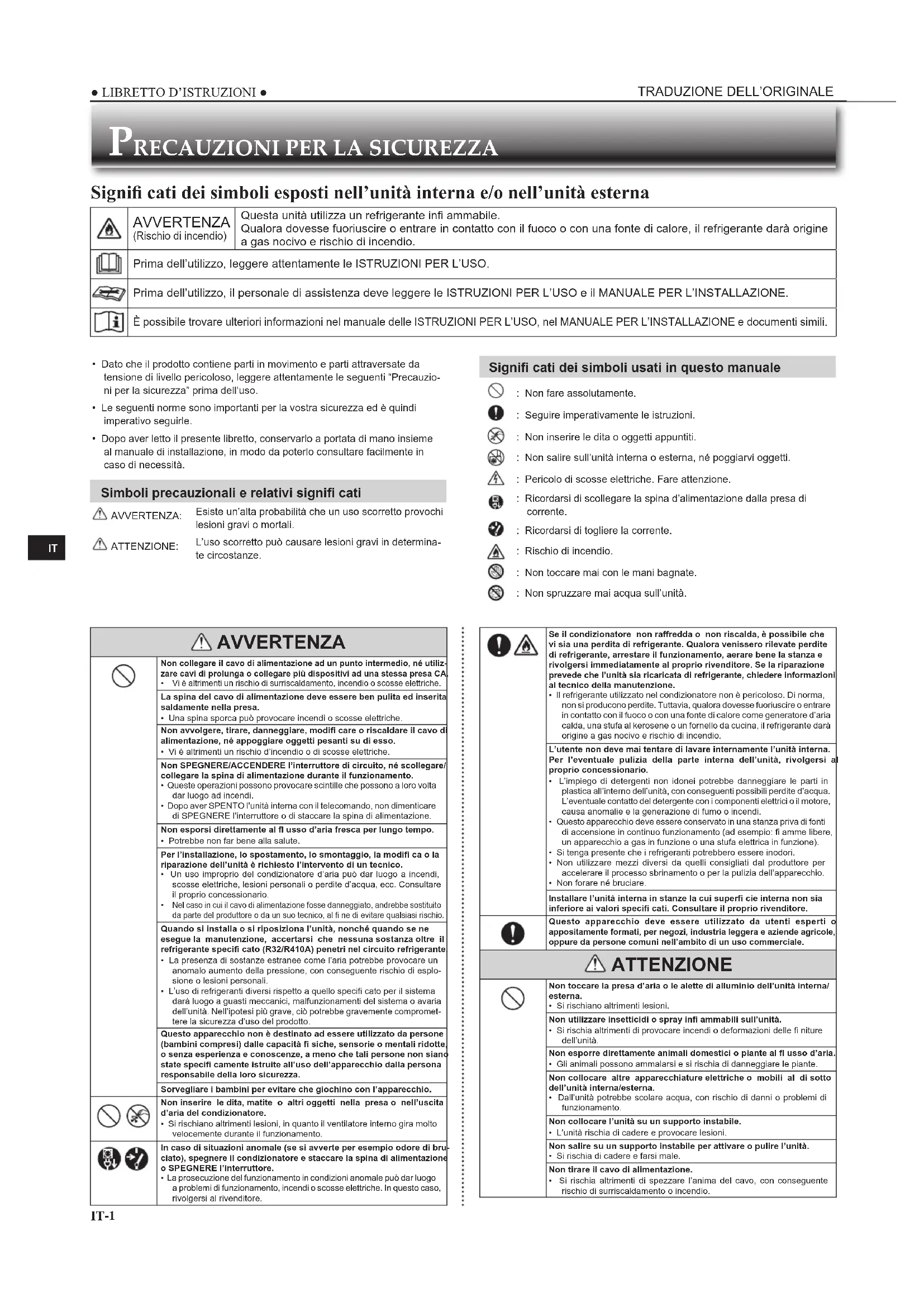 Signifi cati dei simboli esposti nell’unità interna e/o nell’unità esterna AVVERTENZA (Rischio di incendio)Questa unità utilizza un refrigerante infi ammabile.Qualora dovesse fuoriuscire o entrare in contatto con il fuoco o con una fonte di calore, il refrigerante darà origine a gas nocivo e rischio di incendio.Prima dell’utilizzo, leggere attentamente le ISTRUZIONI PER L’USO.Prima dell’utilizzo, il personale di assistenza deve leggere le ISTRUZIONI PER L’USO e il MANUALE PER L’INSTALLAZIONE. È possibile trovare ulteriori informazioni nel manuale delle ISTRUZIONI PER L’USO, nel MANUALE PER L’INSTALLAZIONE e documenti simili. AVVERTENZA Non collegare il cavo di alimentazione ad un punto intermedio, né utiliz-zare cavi di prolunga o collegare più dispositivi ad una stessa presa CA. Vi è altrimenti un rischio di surriscaldamento, incendio o scosse elettriche.La spina del cavo di alimentazione deve essere ben pulita ed inserita saldamente nella presa.• Una spina sporca può provocare incendi o scosse elettriche.Non avvolgere, tirare, danneggiare, modifi care o riscaldare il cavo di alimentazione, né appoggiare oggetti pesanti su di esso.• Vi è altrimenti un rischio d’incendio o di scosse elettriche.Non SPEGNERE/ACCENDERE l’interruttore di circuito, né scollegare/collegare la spina di alimentazione durante il funzionamento.• Queste operazioni possono provocare scintille che possono a loro volta dar luogo ad incendi.• Dopo aver SPENTO l’unità interna con il telecomando, non dimenticare di SPEGNERE l’interruttore o di staccare la spina di alimentazione.Non esporsi direttamente al fl usso d’aria fresca per lungo tempo.• Potrebbe non far bene alla salute.Per l’installazione, lo spostamento, lo smontaggio, la modifi ca o la riparazione dell’unità è richiesto l’intervento di un tecnico.• Un uso improprio del condizionatore d’aria può dar luogo a incendi, scosse elettriche, lesioni personali o perdite d’acqua, ecc. Consultare il proprio concessionario. Nel caso in cui il cavo di alimentazione fosse danneggiato, andrebbe sostituito da parte del produttore o da un suo tecnico, al fi ne di evitare qualsiasi rischio.Quando si installa o si riposiziona l’unità, nonché quando se ne esegue la manutenzione, accertarsi che nessuna sostanza oltre il refrigerante specifi cato (R32/R410A) penetri nel circuito refrigerante.• La presenza di sostanze estranee come l’aria potrebbe provocare un anomalo aumento della pressione, con conseguente rischio di esplo-sione o lesioni personali. • L’uso di refrigeranti diversi rispetto a quello specifi cato per il sistema darà luogo a guasti meccanici, malfunzionamenti del sistema o avaria dell’unità. Nell’ipotesi più grave, ciò potrebbe gravemente compromet-tere la sicurezza d’uso del prodotto.Questo apparecchio non è destinato ad essere utilizzato da persone (bambini compresi) dalle capacità fi siche, sensorie o mentali ridotte, o senza esperienza e conoscenze, a meno che tali persone non siano state specifi camente istruite all’uso dell’apparecchio dalla persona responsabile della loro sicurezza.Sorvegliare i bambini per evitare che giochino con l’apparecchio. Non inserire le dita, matite o altri oggetti nella presa o nell’uscita d’aria del condizionatore.• Si rischiano altrimenti lesioni, in quanto il ventilatore interno gira molto velocemente durante il funzionamento. In caso di situazioni anomale (se si avverte per esempio odore di bru-ciato), spegnere il condizionatore e staccare la spina di alimentazione o SPEGNERE l’interruttore.• La prosecuzione del funzionamento in condizioni anomale può dar luogo a problemi di funzionamento, incendi o scosse elettriche. In questo caso, rivolgersi al rivenditore. Se il condizionatore non raffredda o non riscalda, è possibile che vi sia una perdita di refrigerante. Qualora venissero rilevate perdite di refrigerante, arrestare il funzionamento, aerare bene la stanza e rivolgersi immediatamente al proprio rivenditore. Se la riparazione prevede che l’unità sia ricaricata di refrigerante, chiedere informazioni al tecnico della manutenzione.• Il refrigerante utilizzato nel condizionatore non è pericoloso. Di norma, non si producono perdite. Tuttavia, qualora dovesse fuoriuscire o entrare in contatto con il fuoco o con una fonte di calore come generatore d’aria calda, una stufa al kerosene o un fornello da cucina, il refrigerante darà origine a gas nocivo e rischio di incendio.L’utente non deve mai tentare di lavare internamente l’unità interna. Per l’eventuale pulizia della parte interna dell’unità, rivolgersi al proprio concessionario.• L’impiego di detergenti non idonei potrebbe danneggiare le parti in plastica all’interno dell’unità, con conseguenti possibili perdite d’acqua. L’eventuale contatto del detergente con i componenti elettrici o il motore, causa anomalie e la generazione di fumo o incendi.• Questo apparecchio deve essere conservato in una stanza priva di fonti di accensione in continuo funzionamento (ad esempio: fi amme libere, un apparecchio a gas in funzione o una stufa elettrica in funzione).• Si tenga presente che i refrigeranti potrebbero essere inodori.• Non utilizzare mezzi diversi da quelli consigliati dal produttore per accelerare il processo sbrinamento o per la pulizia dell’apparecchio.• Non forare né bruciare.Installare l’unità interna in stanze la cui superfi cie interna non sia inferiore ai valori specifi cati. Consultare il proprio rivenditore.Questo apparecchio deve essere utilizzato da utenti esperti o appositamente formati, per negozi, industria leggera e aziende agricole, oppure da persone comuni nell’ambito di un uso commerciale. ATTENZIONE Non toccare la presa d’aria o le alette di alluminio dell’unità interna/esterna.• Si rischiano altrimenti lesioni.Non utilizzare insetticidi o spray infi ammabili sull’unità.• Si rischia altrimenti di pr