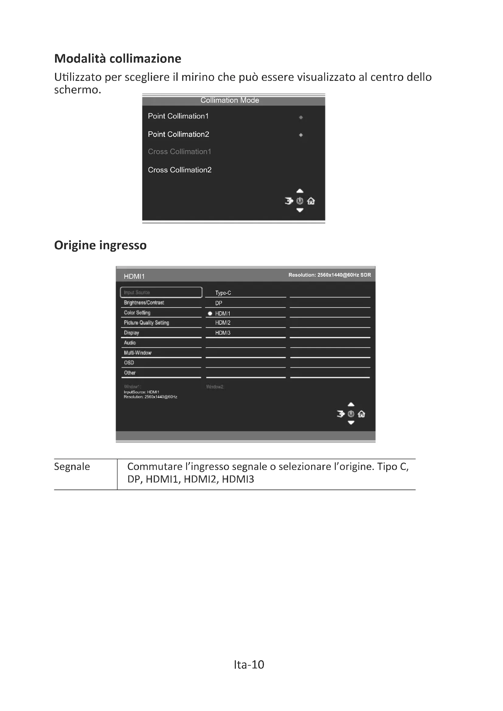 Ulizzato per scegliere il mirino che può essere visualizzato al centro dello schermo. Ita-10 Collimation ModePoint Collimation1Point Collimation2Cross Collimation1Cross Collimation2