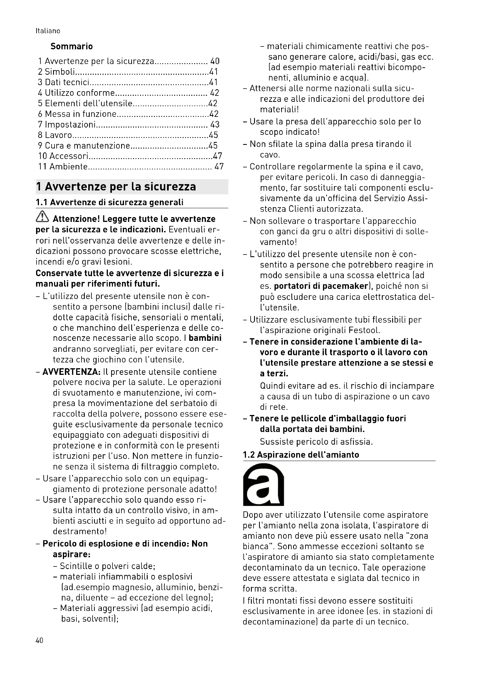 Attenzione! Leggere tutte le avvertenze per la sicurezza e le indicazioni. Eventuali er rori nell'osservanza delle avvertenze e delle in dicazioni possono provocare scosse elettriche, incendi e/o gravi lesioni. Conservate tutte le avvertenze di sicurezza e i manuali per riferimenti futuri. – L'utilizzo del presente utensile non è con sentito a persone (bambini inclusi) dalle ri dotte capacità fisiche, sensoriali o mentali, o che manchino dell'esperienza e delle co noscenze necessarie allo scopo. I bambini andranno sorvegliati, per evitare con cer tezza che giochino con l'utensile. – AVVERTENZA: Il presente utensile contiene polvere nociva per la salute. Le operazioni di svuotamento e manutenzione, ivi com presa la movimentazione del serbatoio di raccolta della polvere, possono essere ese guite esclusivamente da personale tecnico equipaggiato con adeguati dispositivi di protezione e in conformità con le presenti istruzioni per l'uso. Non mettere in funzio ne senza il sistema di filtraggio completo. – Usare l'apparecchio solo con un equipag giamento di protezione personale adatto! – Usare l'apparecchio solo quando esso ri sulta intatto da un controllo visivo, in am bienti asciutti e in seguito ad opportuno ad destramento! – Pericolo di esplosione e di incendio: Non aspirare: – Scintille o polveri calde; – materiali infiammabili o esplosivi (ad.esempio magnesio, alluminio, benzi na, diluente – ad eccezione del legno); – Materiali aggressivi (ad esempio acidi, basi, solventi); – materiali chimicamente reattivi che pos sano generare calore, acidi/basi, gas ecc. (ad esempio materiali reattivi bicompo nenti, alluminio e acqua). – Attenersi alle norme nazionali sulla sicu rezza e alle indicazioni del produttore dei materiali! – Usare la presa dell'apparecchio solo per lo scopo indicato! – Non sfilate la spina dalla presa tirando il cavo. – Controllare regolarmente la spina e il cavo, per evitare pericoli. In caso di danneggia mento, far sostituire tali componenti esclu sivamente da un'officina del Servizio Assi stenza Clienti autorizzata. – Non sollevare o trasportare l'apparecchio con ganci da gru o altri dispositivi di solle vamento! – L'utilizzo del presente utensile non è con sentito a persone che potrebbero reagire in modo sensibile a una scossa elettrica (ad es. portatori di pacemaker), poiché non si può escludere una carica elettrostatica del l'utensile. – Utilizzare esclusivamente tubi flessibili per l'aspirazione originali Festool. – Tenere in considerazione l'ambiente di la voro e durante il trasporto o il lavoro con l'utensile prestare attenzione a se stessi e a terzi. Quindi evitare ad es. il rischio di inciampare a causa di un tubo di aspirazione o un cavo di rete. – Tenere le pellicole d'imballaggio fuori dalla portata dei bambini. Sussiste pericolo di asfissia.