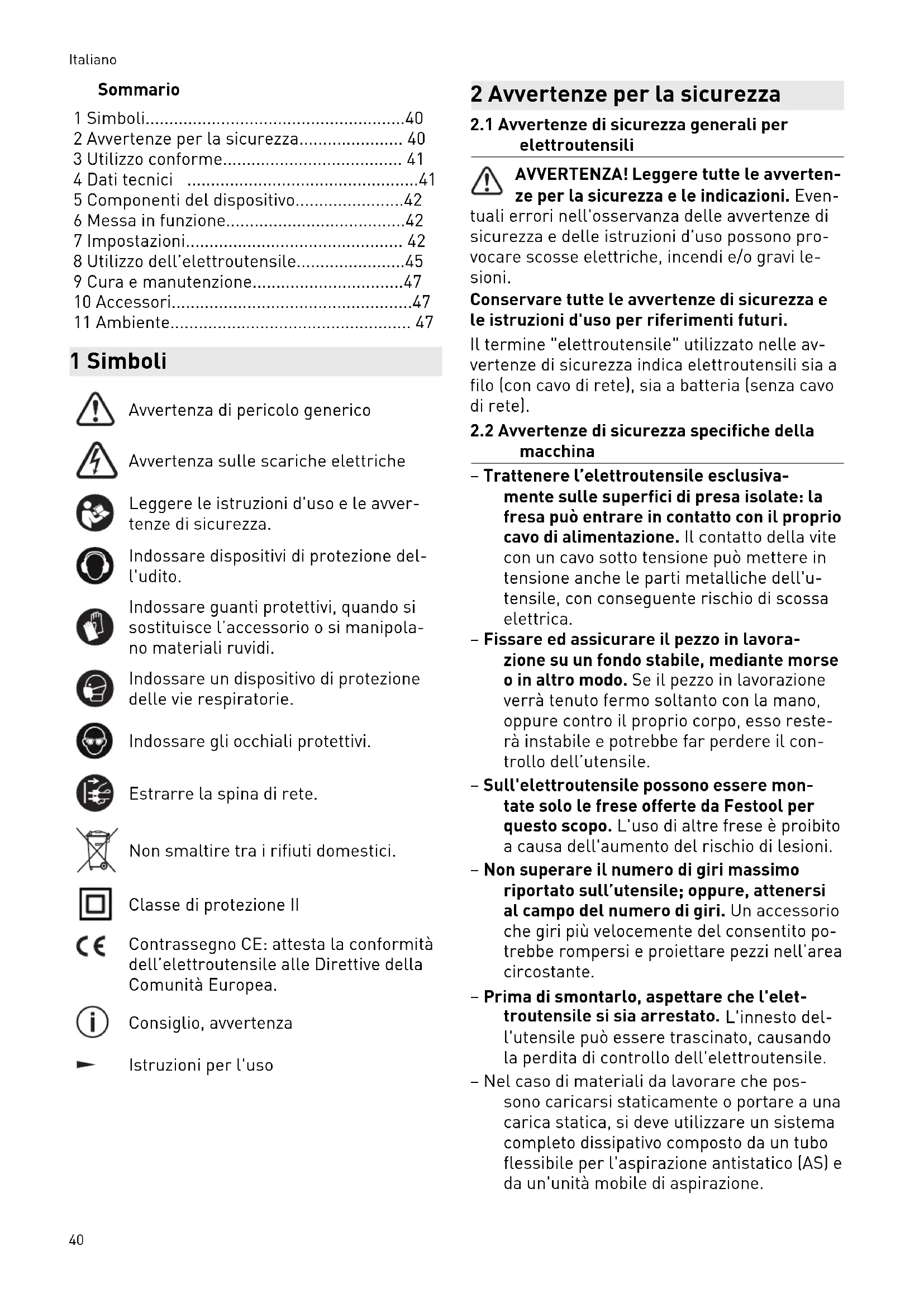 - 11 Ambiente 1 Simboli Avvertenza di pericolo generico Avvertenza sulle scariche elettriche Leggere le istruzioni d'uso e le avver tenze di sicurezza. Indossare dispositivi di protezione del l'udito. Indossare guanti protettivi, quando si sostituisce l’accessorio o si manipola no materiali ruvidi. Indossare un dispositivo di protezione delle vie respiratorie. Indossare gli occhiali protettivi. Estrarre la spina di rete. Non smaltire tra i rifiuti domestici. Classe di protezione II Contrassegno CE: attesta la conformità dell’elettroutensile alle Direttive della Comunità Europea. Consiglio, avvertenza Istruzioni per l'uso 2 Avvertenze per la sicurezza p. 47