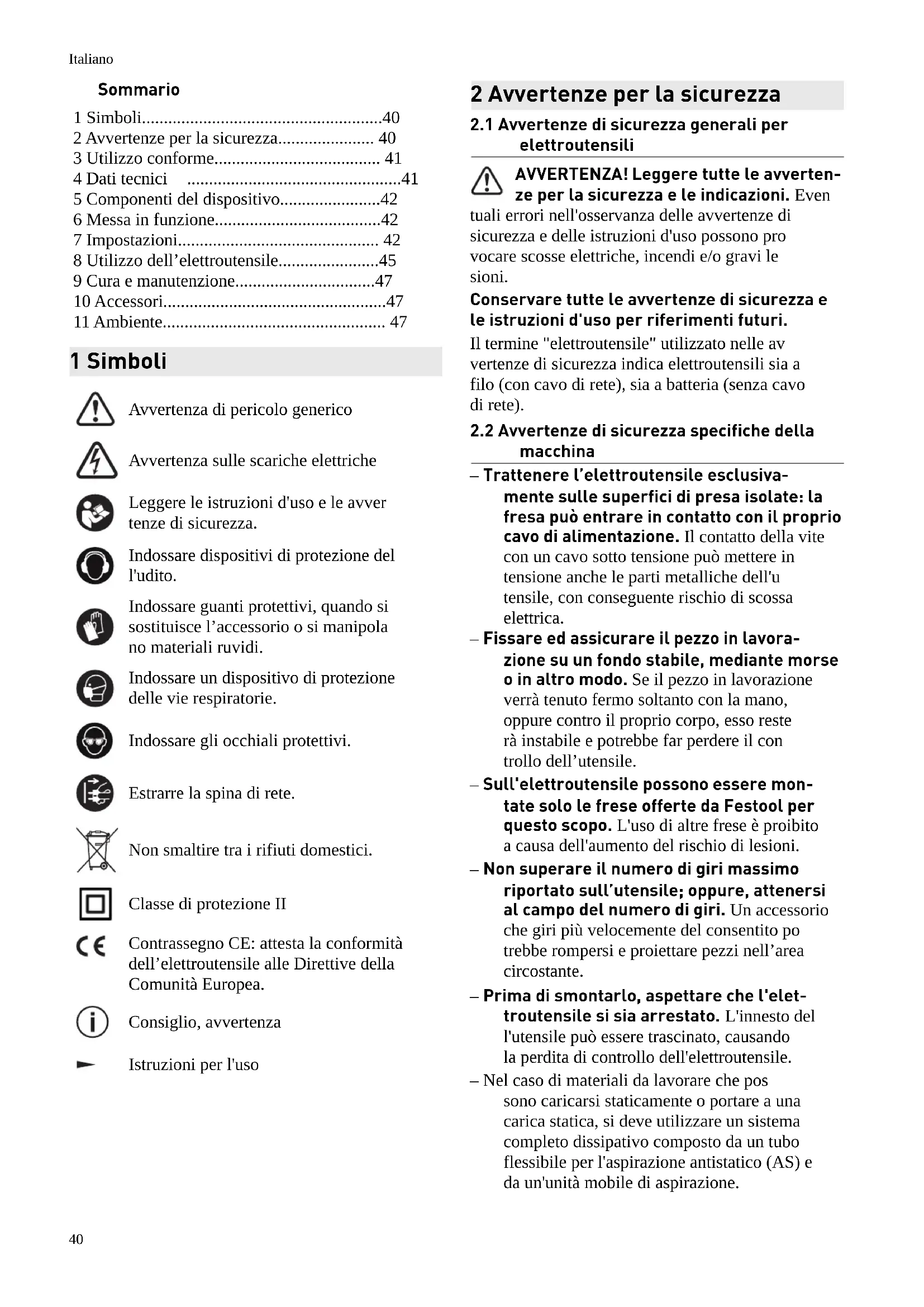 - 11 Ambiente 1 Simboli Avvertenza di pericolo generico Avvertenza sulle scariche elettriche Leggere le istruzioni d'uso e le avver tenze di sicurezza. Indossare dispositivi di protezione del l'udito. Indossare guanti protettivi, quando si sostituisce l’accessorio o si manipola no materiali ruvidi. Indossare un dispositivo di protezione delle vie respiratorie. Indossare gli occhiali protettivi. Estrarre la spina di rete. Non smaltire tra i rifiuti domestici. Classe di protezione II Contrassegno CE: attesta la conformità dell’elettroutensile alle Direttive della Comunità Europea. Consiglio, avvertenza Istruzioni per l'uso 2 Avvertenze per la sicurezza p. 47