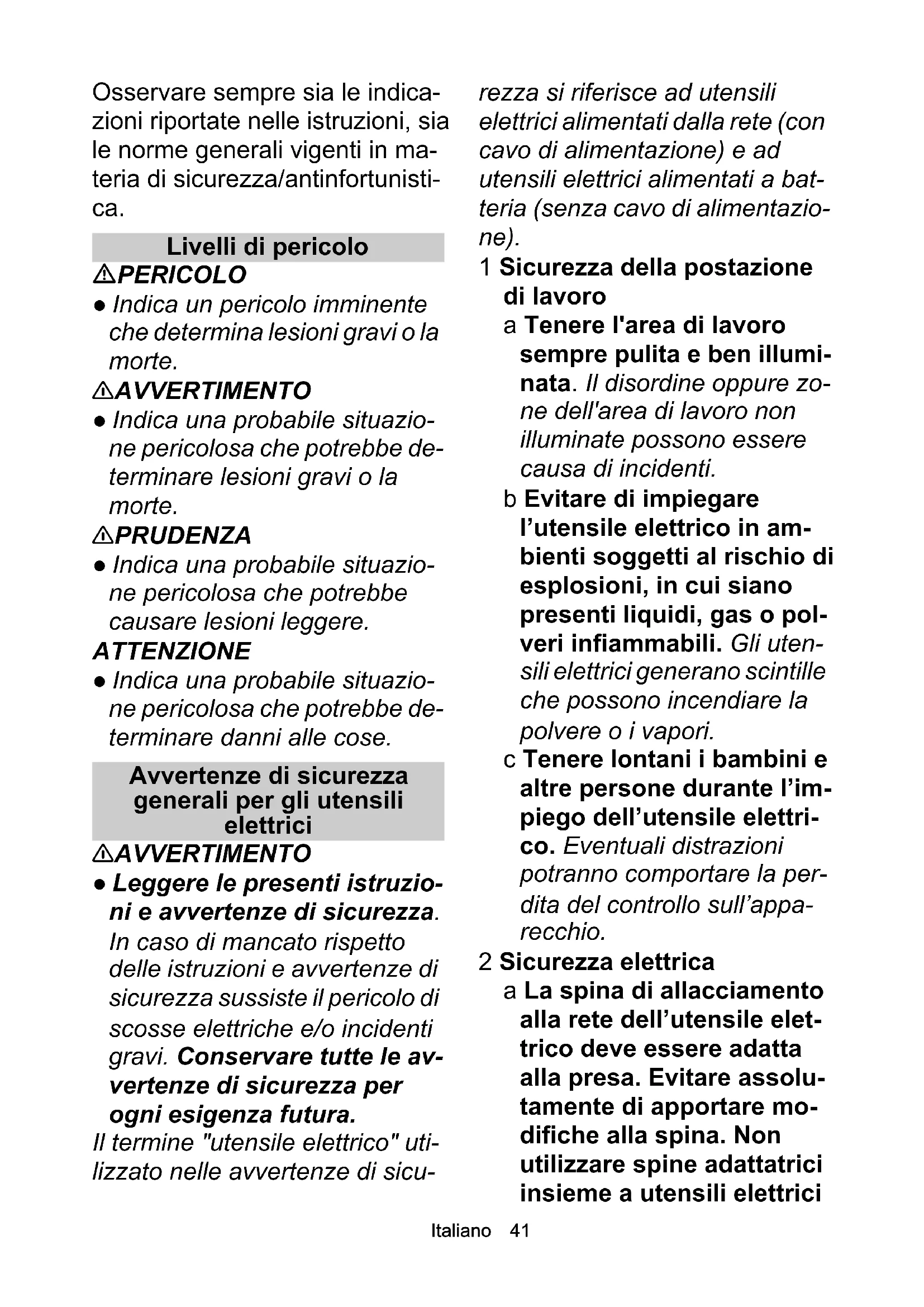- Dichiarazione di conformità UE Chairman of the Board of ManagementDirector Regulatory Affairs & Certification H. Jenner S. ReiserItaliano 41 Osservare sempre sia le indica- zioni riportate nelle istruzioni, sia le norme generali vigenti in ma- teria di sicurezza/antinfortunisti- ca. Livelli di pericolo PERICOLO ● Indica un pericolo imminente che determina lesioni gravi o la morte. 몇 AVVERTIMENTO ● Indica una probabile situazio- ne pericolosa che potrebbe de- terminare lesioni gravi o la morte. 몇 PRUDENZA ● Indica una probabile situazio- ne pericolosa che potrebbe causare lesioni leggere. ATTENZIONE ● Indica una probabile situazio- ne pericolosa che potrebbe de- terminare danni alle cose. Avvertenze di sicurezza generali per gli utensili elettrici 몇 AVVERTIMENTO ● Leggere le presenti istruzio- ni e avvertenze di sicurezza. In caso di mancato rispetto delle istruzioni e avvertenze di sicurezza sussiste il pericolo di scosse elettriche e/o incidenti gravi. Conservare tutte le av- vertenze di sicurezza per ogni esigenza futura. Il termine "utensile elettrico" uti- lizzato nelle avvertenze di sicu- rezza si riferisce ad utensili elettrici alimentati dalla rete (con cavo di alimentazione) e ad utensili elettrici alimentati a bat- teria (senza cavo di alimentazio- ne). 1 Sicurezza della postazione di lavoro a Tenere l'area di lavoro sempre pulita e ben illumi- nata. Il disordine oppure zo- ne dell'area di lavoro non illuminate possono essere causa di incidenti. b Evitare di impiegare l’utensile elettrico in am- bienti soggetti al rischio di esplosioni, in cui siano presenti liquidi, gas o pol- veri infiammabili. Gli uten- sili elettrici generano scintille che possono incendiare la polvere o i vapori. c Tenere lontani i bambini e altre persone durante l’im- piego dell’utensile elettri- co. Eventuali distrazioni potranno comportare la per- dita del controllo sull’appa- recchio. 2 Sicurezza elettrica a La spina di allacciamento alla rete dell’utensile elet- trico deve essere adatta alla presa. Evitare assolu- tamente di apportare mo- difiche alla spina. Non utilizzare spine adattatrici insieme a utensili elettrici42 Italiano con collegamento a terra. Spine non modificate e pre- se adatte allo scopo riduco- no il rischio di scosse elettriche. b Evitare il contatto fisico con superfici collegate a terra, come tubi, riscalda- menti, cucine elettriche e frigoriferi. Sussiste un mag- gior rischio di scosse elettri- che nel momento in cui il corpo è messo a massa. c Custodire l’utensile elettri- co al riparo dalla pioggia o dall’umidità. La penetrazio- ne dell’acqua in un utensile elettrico aumenta il rischio di una scossa elettrica. d Non usare il cavo per sco- pi diversi da quelli previsti e, in particolare, non usar- lo per trasportare o per ap- pendere l’utensile elettrico oppure per estrarre la spina dalla pre- sa di corrente. Non avvici- nare il cavo a fonti di calore, olio, spigoli ta- glienti e neppure a parti dell'apparecchio che sia- no in movimento. I cavi danneggiati o aggrovigliati aumentano il rischio di scos- se elettriche. e Qualora si voglia usare l’utensile elettrico all’aper- to, impiegare solo ed esclusivamente cavi di prolunga che siano adatti per l’impiego all’esterno. L’uso di un cavo di prolunga omologato per l’impiego all’esterno riduce il rischio d’insorgenza di scosse elet- triche. f Qualora non fosse possi- bile evitare di utilizzare l’utensile elettrico in am- biente umido, utilizzare un interruttore per dispersio- ne di corrente. L’uso di un interruttore per dispersione di corrente riduce il rischio di una scossa elettrica. 3 Sicurezza delle persone a È importante concentrarsi su ciò che si sta facendo e maneggiare con giudizio l’utensile elettrico durante le operazioni di lavoro. Non utilizzare mai l’utensi- le elettrico in caso di stan- chezza oppure quando ci si trovi sotto l’effetto di droghe, bevande alcoliche e medicinali. Un attimo di distrazione durante l’uso dell’utensile elettrico può es- sere causa di gravi lesioni. b Indossare sempre equi- paggiamento di protezio- ne individuale, nonché occhiali di protezione. In- dossando un equipaggia- mento di protezione personale come la masche- ra per polveri, scarpe di sicu-Italiano 43 rezza che non scivolino, elmetto di protezione oppure protezione acustica a secon- da del tipo e dell’applicazio- ne dell’utensile elettrico, si riduce il rischio di lesioni. c Evitare la messa in funzio- ne involontaria dell’utensi- le elettrico. Prima di collegarlo all'alimentazio- ne di corrente e/o alla bat- teria ricaricabile, prima di prenderlo e/o prima di ini- ziare a sollevarlo o tra- sportarlo, assicurarsi che l’utensile elettrico sia spento. Tenendo il dito so- pra l’interruttore mentre si trasporta l’utensile elettrico oppure collegandolo all’ali- mentazione di corrente con l’interruttore inserito, posso- no verificarsi seri incidenti. d Prima di accendere l’uten- sile elettrico togliere gli at- trezzi di regolazione o la chiave. Un utensile o una chiave che si trovi in una parte rotante dell'apparec- chio può provocare lesioni gravi. e Evitare una posizione ano- mala del corpo. Mettersi sempre in posizione sicu- ra e cercare di mantenere l’equilibrio in ogni situa- zione. In questo modo è possibile controllare meglio l’utensile elettrico in caso di situazioni inaspettate. f Indossare indumenti ade- guati. Non indossare ve- stiti ampi, né portare braccialetti o catenine. Te- nere i capelli, gli indumen- ti e i guanti lontano da pezzi in movimento. Indu- menti larghi, guanti, gioielli o capelli lunghi possono impi- gliarsi nelle parti in movi- mento. g In caso fosse previsto il montaggio di dispositivi di aspirazione della polvere e di raccolta, assicurarsi che gli stessi siano colle- gati e che vengano utiliz- zati correttamente. L’utilizzo di un’aspirazione della polvere può ridurre l’in- sorgenza di situazioni peri- colose d