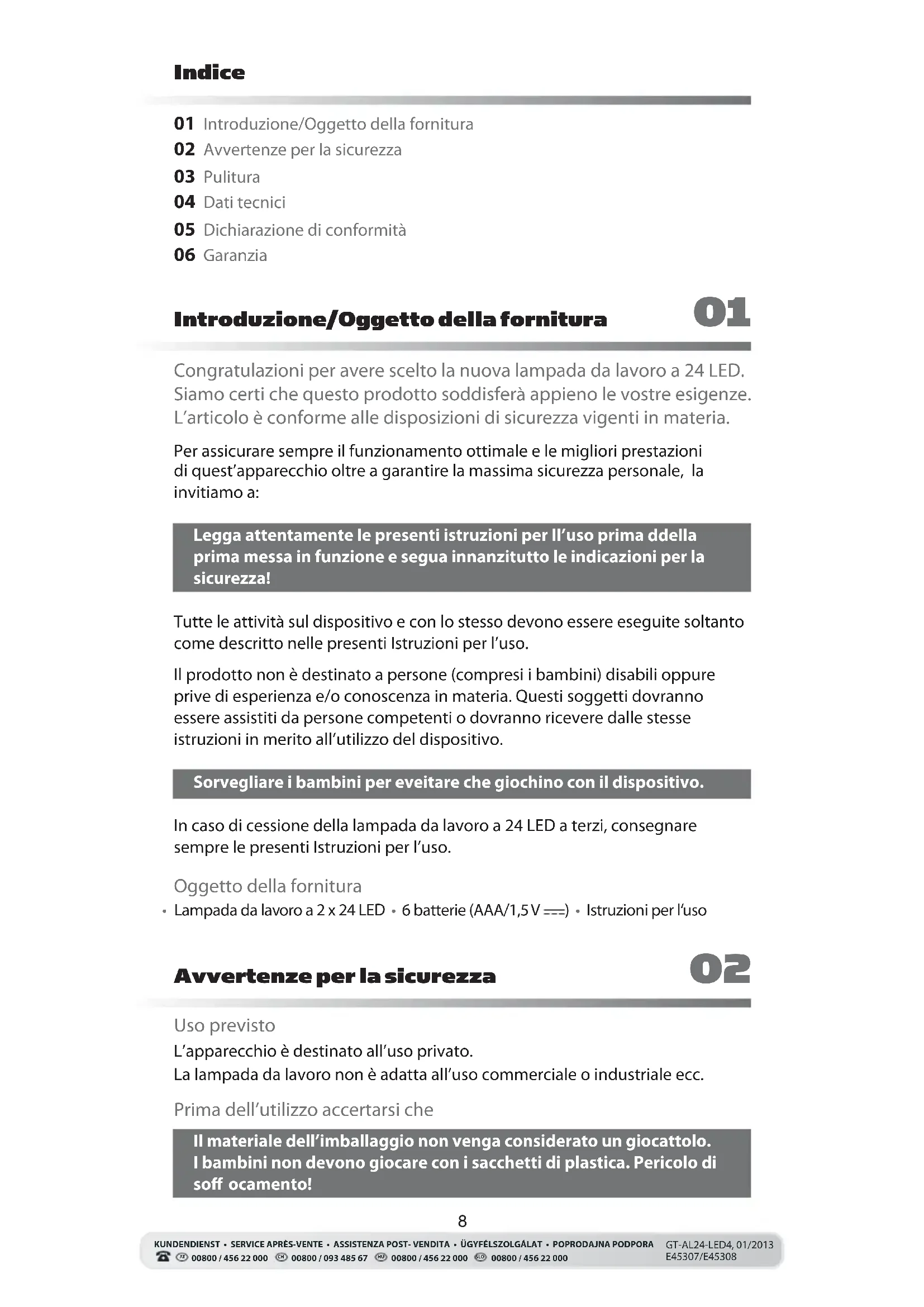 00800 / 456 22 000 SLO 00800 / 456 22 000 GT-AL24-LED4, 01/2013 E45307/E45308 Non lasciare mai utilizzare apparecchi elettrici incustoditi ai bambini. I minori non riconoscono i pericoli legati all’utilizzo del prodotto. Tenere pertanto il dispositivo lontano dalla portata dei bambini! Indicazioni di carattere generale