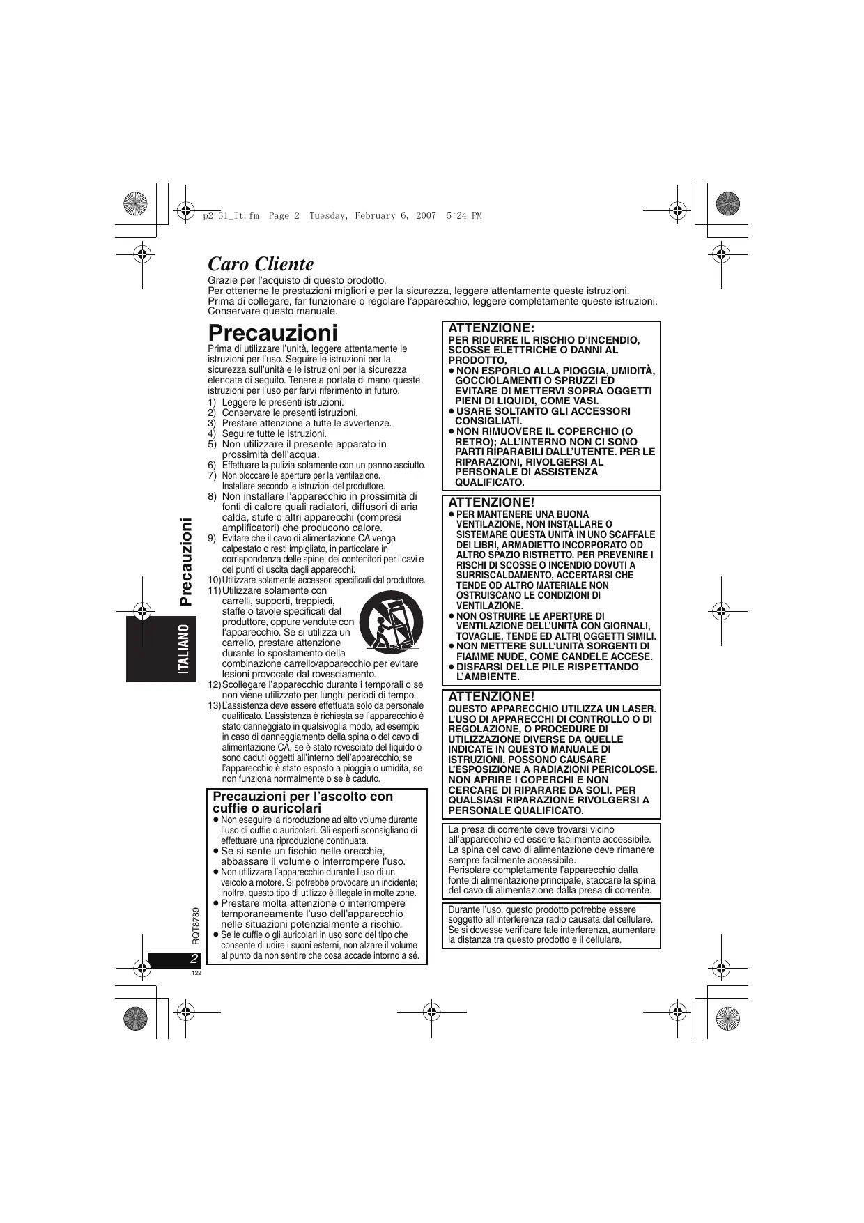 p2-31_It.fm Page 2 Tuesday, February 6, 2007 5:24 PM Caro Cliente Grazie per l’acquisto di questo prodotto. Per ottenerne le prestazioni migliori e per la sicurezza, leggere attentamente queste istruzioni. Prima di collegare, far funzionare o regolare l’apparecchio, leggere completamente queste istruzioni. Conservare questo manuale. Precauzioni Precauzioni Prima di utilizzare l’unità, leggere attentamente le istruzioni per l’uso. Seguire le istruzioni per la sicurezza sull’unità e le istruzioni per la sicurezza elencate di seguito. Tenere a portata di mano queste istruzioni per l’uso per farvi riferimento in futuro.