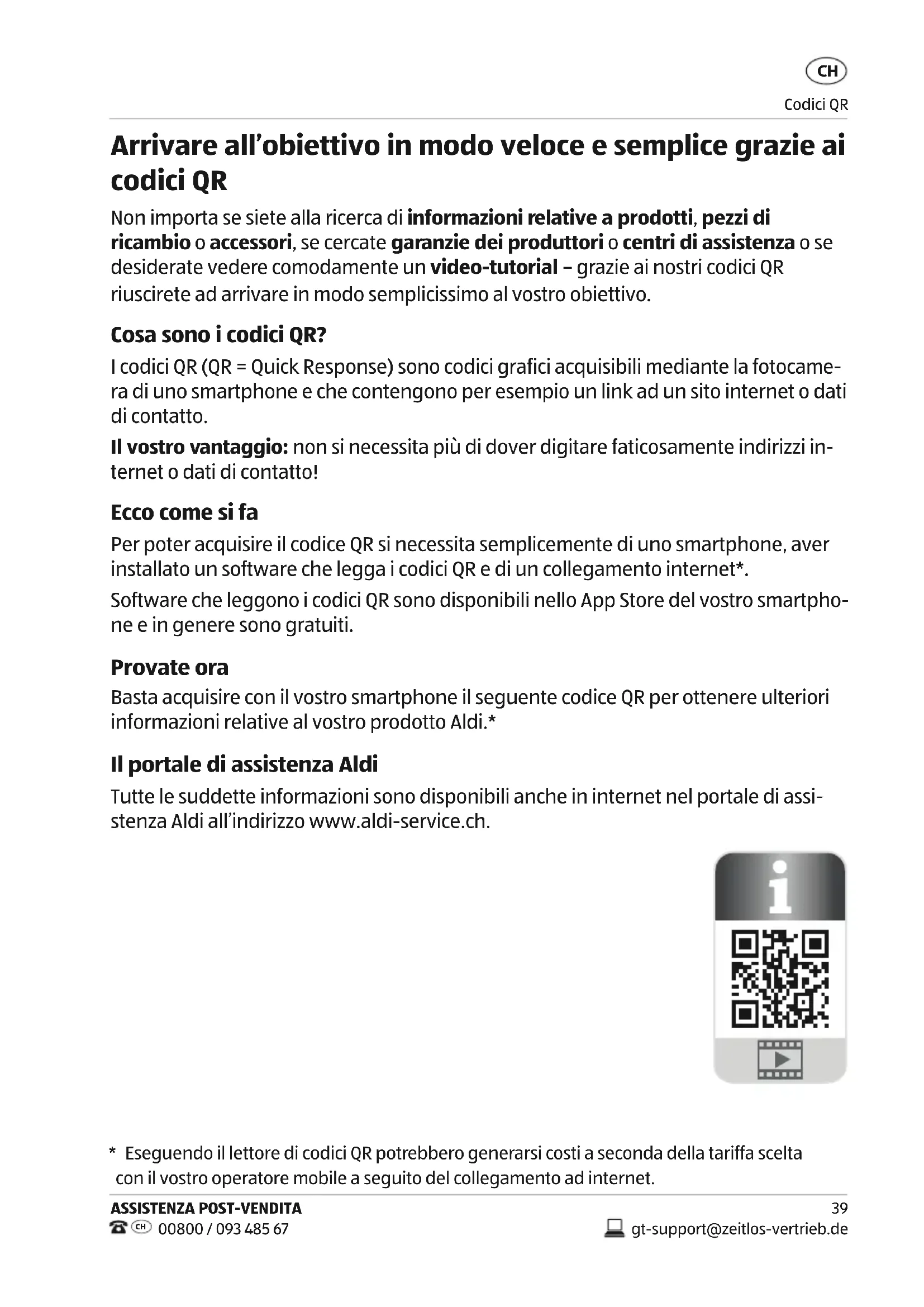 00800 / 093 485 67 ASSISTENZA POST-VENDITA Codici QR Arrivare all’obiettivo in modo veloce e semplice grazie ai codici QR Non importa se siete alla ricerca di informazioni relative a prodotti, pezzi di ricambio o accessori, se cercate garanzie dei produttori o centri di assistenza o se desiderate vedere comodamente un video-tutorial – grazie ai nostri codici QR riuscirete ad arrivare in modo semplicissimo al vostro obiettivo. Cosa sono i codici QR? I codici QR (QR = Quick Response) sono codici grafici acquisibili mediante la fotocame- ra di uno smartphone e che contengono per esempio un link ad un sito internet o dati di contatto. Il vostro vantaggio: non si necessita più di dover digitare faticosamente indirizzi in- ternet o dati di contatto! Ecco come si fa Per poter acquisire il codice QR si necessita semplicemente di uno smartphone, aver installato un software che legga i codici QR e di un collegamento internet*. Software che leggono i codici QR sono disponibili nello App Store del vostro smartpho- ne e in genere sono gratuiti. Provate ora Basta acquisire con il vostro smartphone il seguente codice QR per ottenere ulteriori informazioni relative al vostro prodotto Aldi.* Il portale di assistenza Aldi Tutte le suddette informazioni sono disponibili anche in internet nel portale di assi- stenza Aldi all’indirizzo www.aldi-service.ch.