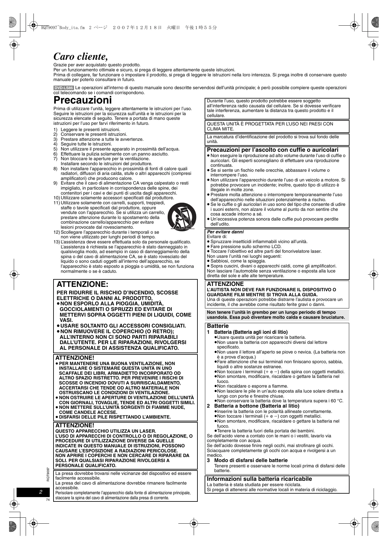 QUESTO APPARECCHIO UTILIZZA UN LASER. L'USO DI APPARECCHI DI CONTROLSLO O DI REGOLAZIONE, O PROCEDURE DI UTILIZAZIONE DIVERSE DA QUELLE INDICATE IN QUESTO MANUALE DI ISTRUZIONI, POSSONO CAUSARE L'ESPOSITIZIONA A RADIAZIONI PERICOLOSE. NON APRIRE I COPERCHI E NON CERCARE DI RIPARARE DA SOLI. PER QUALSIASI RIPARAZIONE RIVOLGERSI A PERSONALE QUALIFICATO.