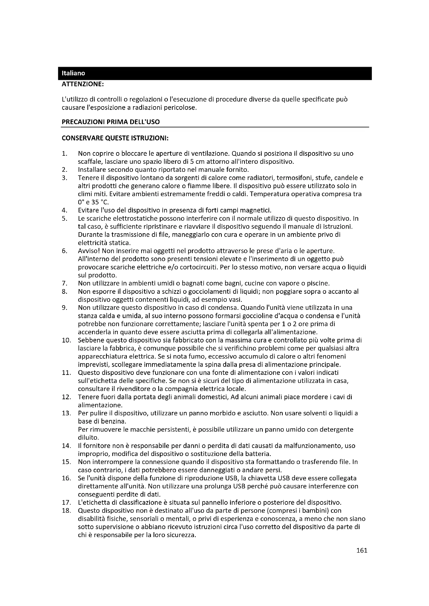 Consente di selezionare da un elenco di podcast in base alla loro origine (Paese), Genere (stile di musica) o lingua. Navigare tra le opzioni di categoria; una volta effettuata la selezione, una schermata conferma la categoria selezionata e il numero di podcast all'interno di quella categoria. Per vedere l'elenco, selezionare l'opzione che mostra il numero di podcast.189 Specifiche Tecniche Rete WIFI Crittografia 802.11b/g/n (WLAN): WEP, WPA, WPA 2(PSK), WPS Frequenza Wi-Fi