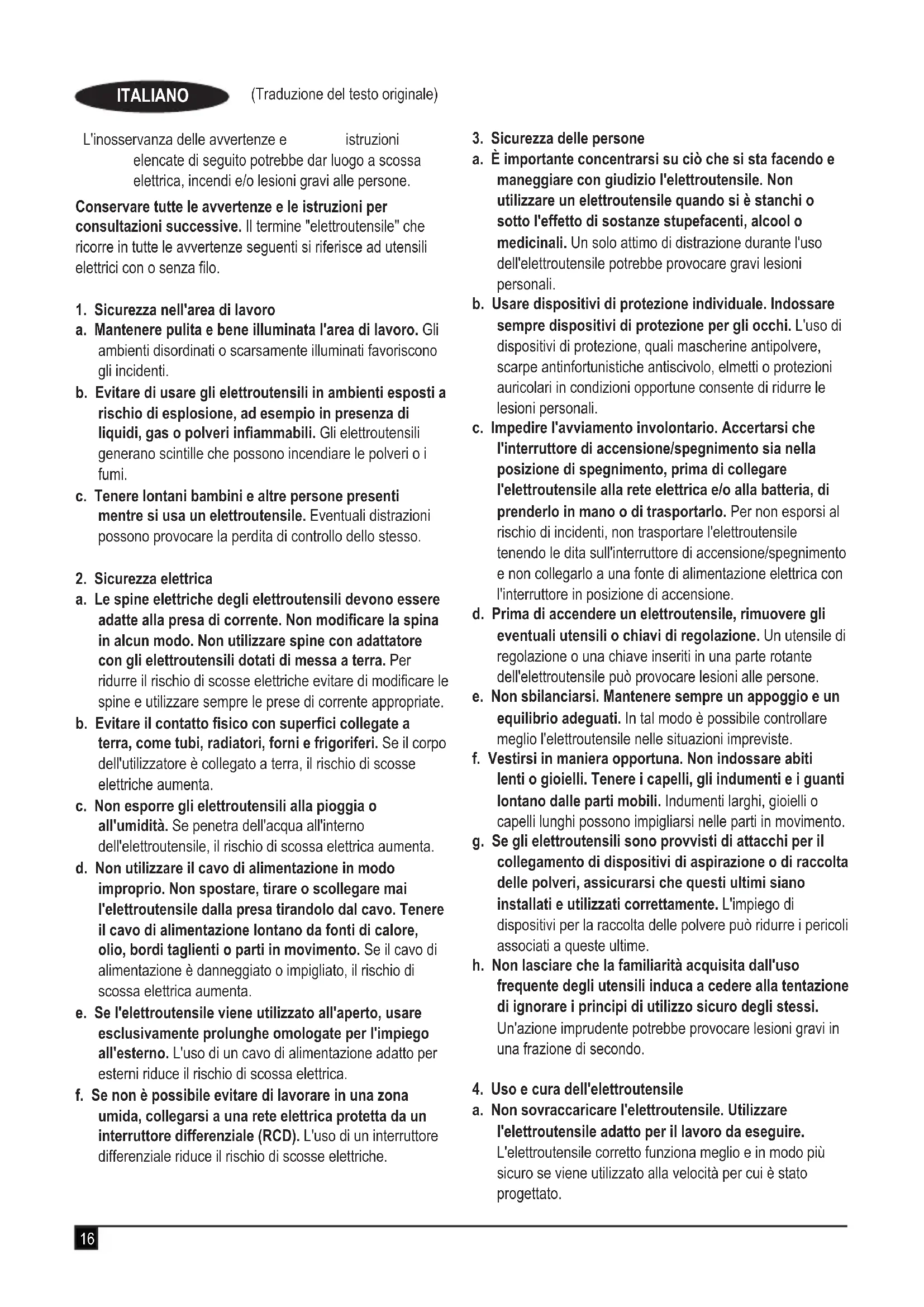 Avvertenza! Leggere attentamente tutte le avvertenze, istruzioni, illustrazioni e speciche fornite con l'elettroutensile.16 (Traduzione del testo originale) ITALIANO L'inosservanza delle avvertenze e istruzioni elencate di seguito potrebbe dar luogo a scossa