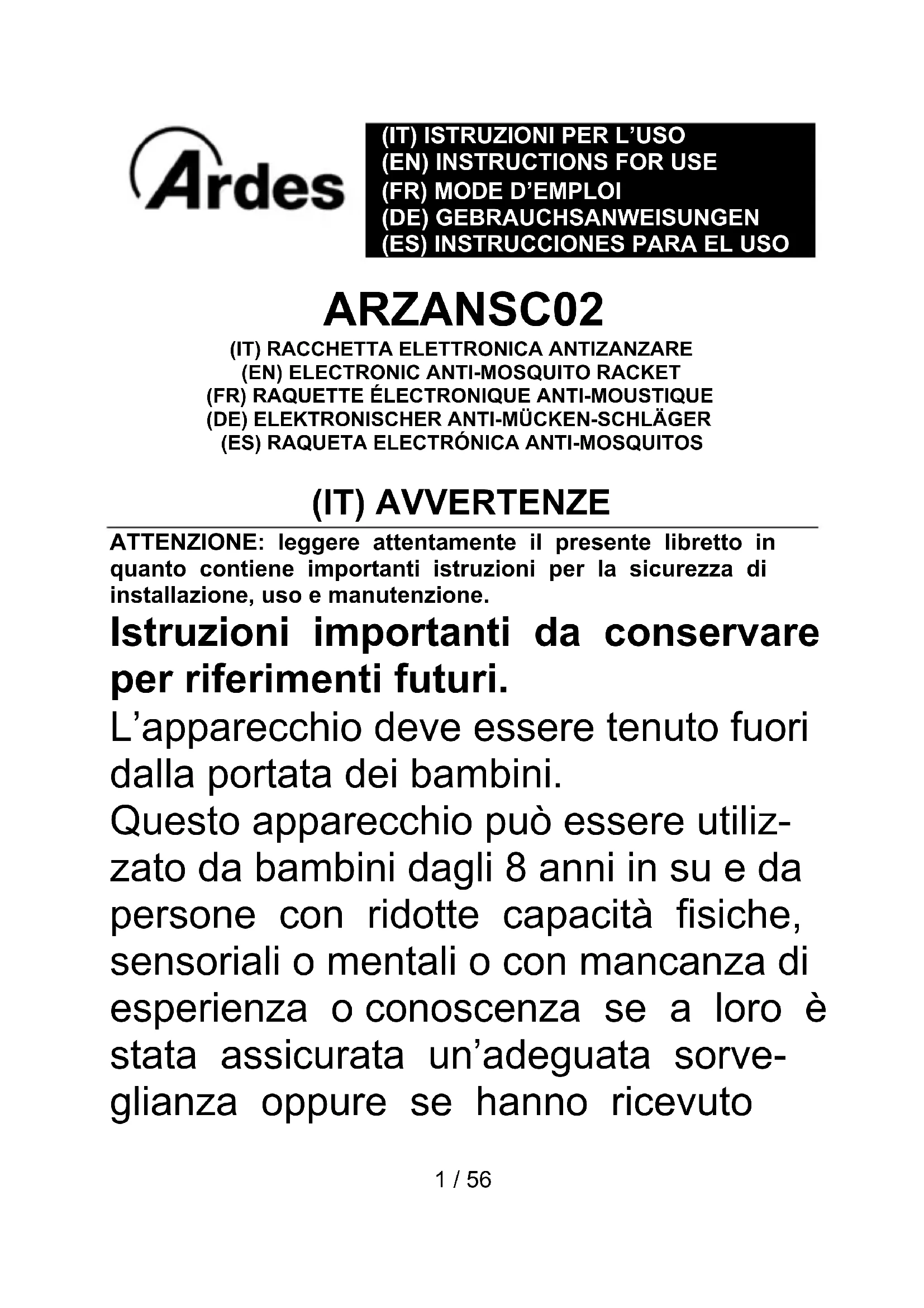 ARZANSC02 (IT) RACCHETTA ELETTRONICA ANTIZANZARE (EN) ELECTRONIC ANTI-MOSQUITO RACKET (FR) RAQUETTE ÉLECTRONIQUE ANTI-MOUSTIQUE (DE) ELEKTRONISCHER ANTI-MÜCKEN-SCHLÄGER (ES) RAQUETA ELECTRÓNICA ANTI-MOSQUITOS (IT) AVVERTENZE ATTENZIONE: leggere attentamente il presente libretto in quanto contiene importanti istruzioni per la sicurezza di installazione, uso e manutenzione. Istruzioni importanti da conservare per riferimenti futuri. L’apparecchio deve essere tenuto fuori dalla portata dei bambini. Questo apparecchio può essere utiliz- zato da bambini dagli 8 anni in su e da persone con ridotte capacità fisiche, sensoriali o mentali o con mancanza di esperienza o conoscenza se a loro è stata assicurata un’adeguata sorve- glianza oppure se hanno ricevuto2 / 56 istruzioni circa l’uso in sicurezza dell’apparecchio e hanno compreso i pericoli correlati. I bambini non devono giocare con l’apparecchio. Le operazioni di pulizia e di manutenzione non devono essere effettuate da bambini senza sorveglianza. L’apparecchio è previsto solo per uso interno, in ogni caso protetto da agenti atmosferici come pioggia, irraggiamento diretto del sole o polvere. L’apparecchio non deve essere utilizzato all’interno di fienili, stalle ed ambienti simili. L’apparecchio non deve essere usato in ambienti dove potrebbero essere presenti vapori infiammabili o polveri esplosive.3 / 56 Le lampade di questo apparecchio possono essere sostituite solo presso i centri assistenza autorizzati dal costruttore, in modo da prevenire ogni rischio. ATTENZIONE: questo apparecchio contiene batterie che possono essere sostituite solo da persone esperte. La batteria deve essere rimossa dall’apparecchio prima dello smaltimento (vedere il paragrafo “Batterie“ nella sezione “Istruzioni d’uso“). La batteria deve essere smaltita in modo sicuro (vedi sezione SMALTIMENTO). L’apparecchio deve essere alimentato solo a bassissima tensione di sicurezza corrispondente a quella indicata sull’apparecchio (5V DC). ATTENZIONE: per alimentare l’apparecchio e per ricaricare la4 / 56 batteria, utilizzare solo l’unità di alimentazione separabile fornita con l’apparecchio. Modello dell’unità di alimentazione separabile Non utilizzare l’apparecchio se le batterie dovessero presentare segni di deterioramento (ad esempio, in caso di odore anomalo, deformazione dell‘apparecchio). Rivolgersi ad un centro assistenza autorizzato dal costruttore.