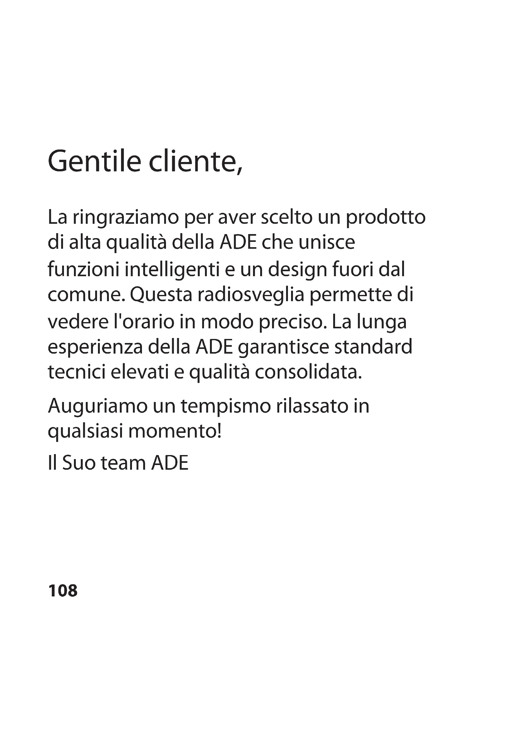 Gentile cliente, La ringraziamo per aver scelto un prodotto di alta qualità della ADE che unisce funzioni intelligenti e un design fuori dal comune. Questa radiosveglia permette di vedere l'orario in modo preciso. La lunga esperienza della ADE garantisce standard tecnici elevati e qualità consolidata. Auguriamo un tempismo rilassato in qualsiasi momento! Il Suo team ADE109