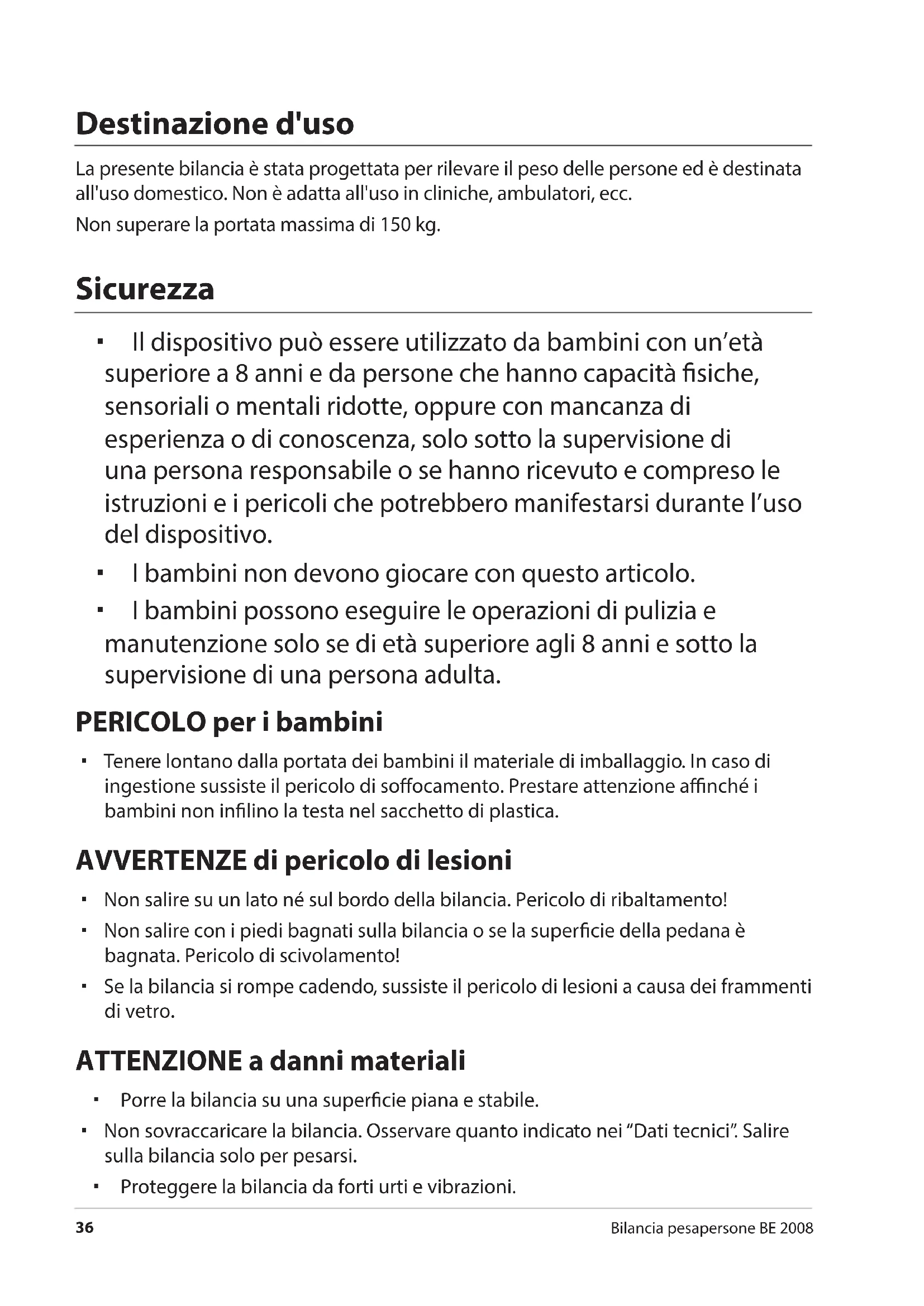 Non sovraccaricare la bilancia. Osservare quanto indicateo nei "Dati tecnici". Salire sulla bilancia solo per pesarsi.