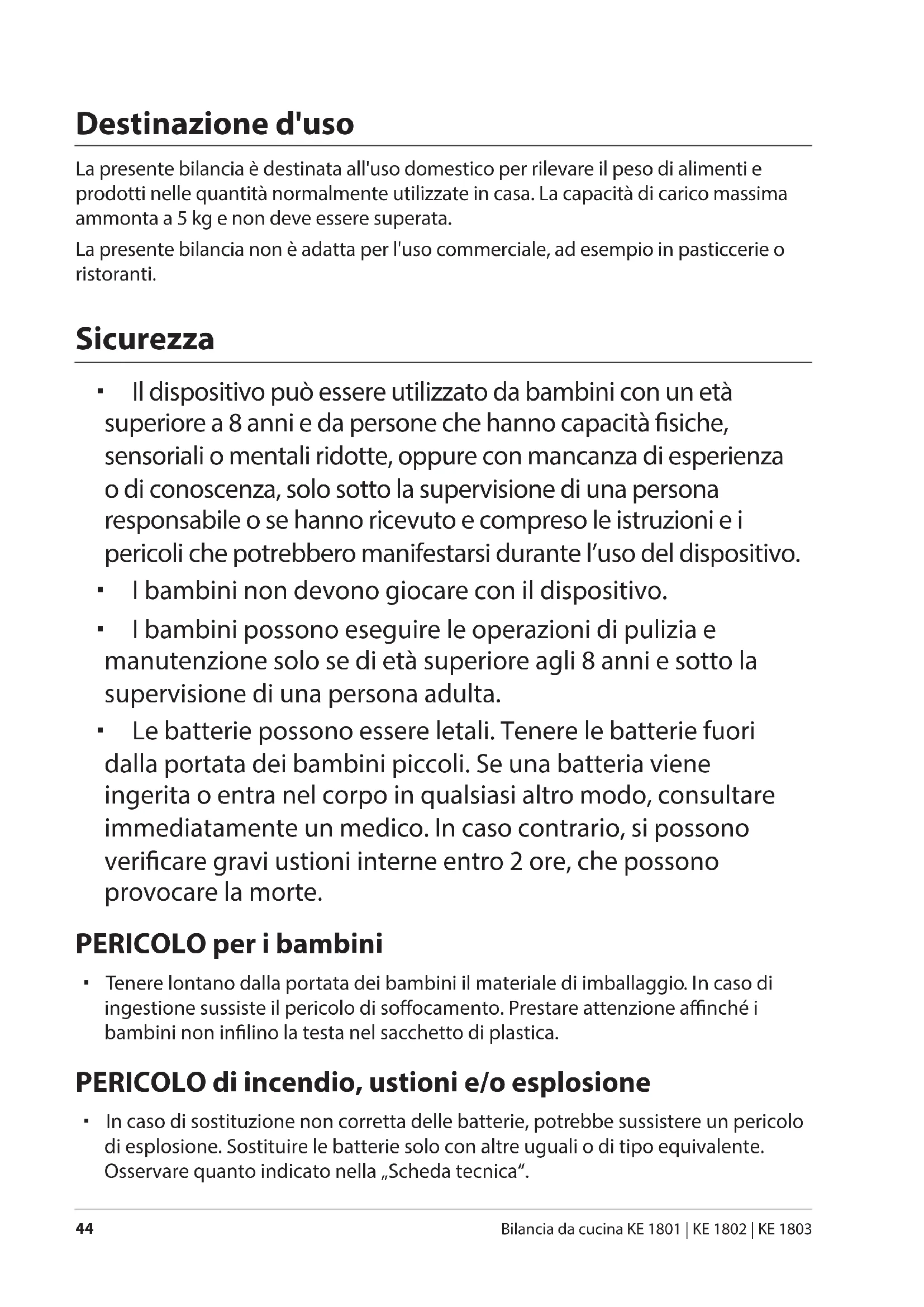 Bilancia da cucina KE 1801 | KE 1802 | KE 1803 Destinazione d'uso La presente bilancia è destinata all'uso domestico per rilevare il peso di alimenti e prodotti nelle quantità normalmente utilizzate in casa. La capacità di carico massima ammonta a 5 kg e non deve essere superata. La presente bilancia non è adatta per l'uso commerciale, ad esempio in pasticcerie o ristoranti. Sicurezza Il dispositivo può essere utilizzato da bambini con un età superiore a 8 anni e da persone che hanno capacità siche, sensoriali o mentali ridotte, oppure con mancanza di esperienza o di conoscenza, solo sotto la supervisione di una persona responsabile o se hanno ricevuto e compreso le istruzioni e i pericoli che potrebbero manifestarsi durante l’uso del dispositivo. I bambini non devono giocare con il dispositivo. I bambini possono eseguire le operazioni di pulizia e manutenzione solo se di età superiore agli 8 anni e sotto la supervisione di una persona adulta. Le batterie possono essere letali. Tenere le batterie fuori dalla portata dei bambini piccoli. Se una batteria viene ingerita o entra nel corpo in qualsiasi altro modo, consultare immediatamente un medico. In caso contrario, si possono vericare gravi ustioni interne entro 2 ore, che possono provocare la morte. PERICOLO per i bambini Tenere lontano dalla portata dei bambini il materiale di imballaggio. In caso di ingestione sussiste il pericolo di soocamento. Prestare attenzione anché i bambini non inlino la testa nel sacchetto di plastica. PERICOLO di incendio, ustioni e/o esplosione In caso di sostituzione non corretta delle batterie, potrebbe sussistere un pericolo di esplosione. Sostituire le batterie solo con altre uguali o di tipo equivalente. Osservare quanto indicato nella „Scheda tecnica“.Sicurezza