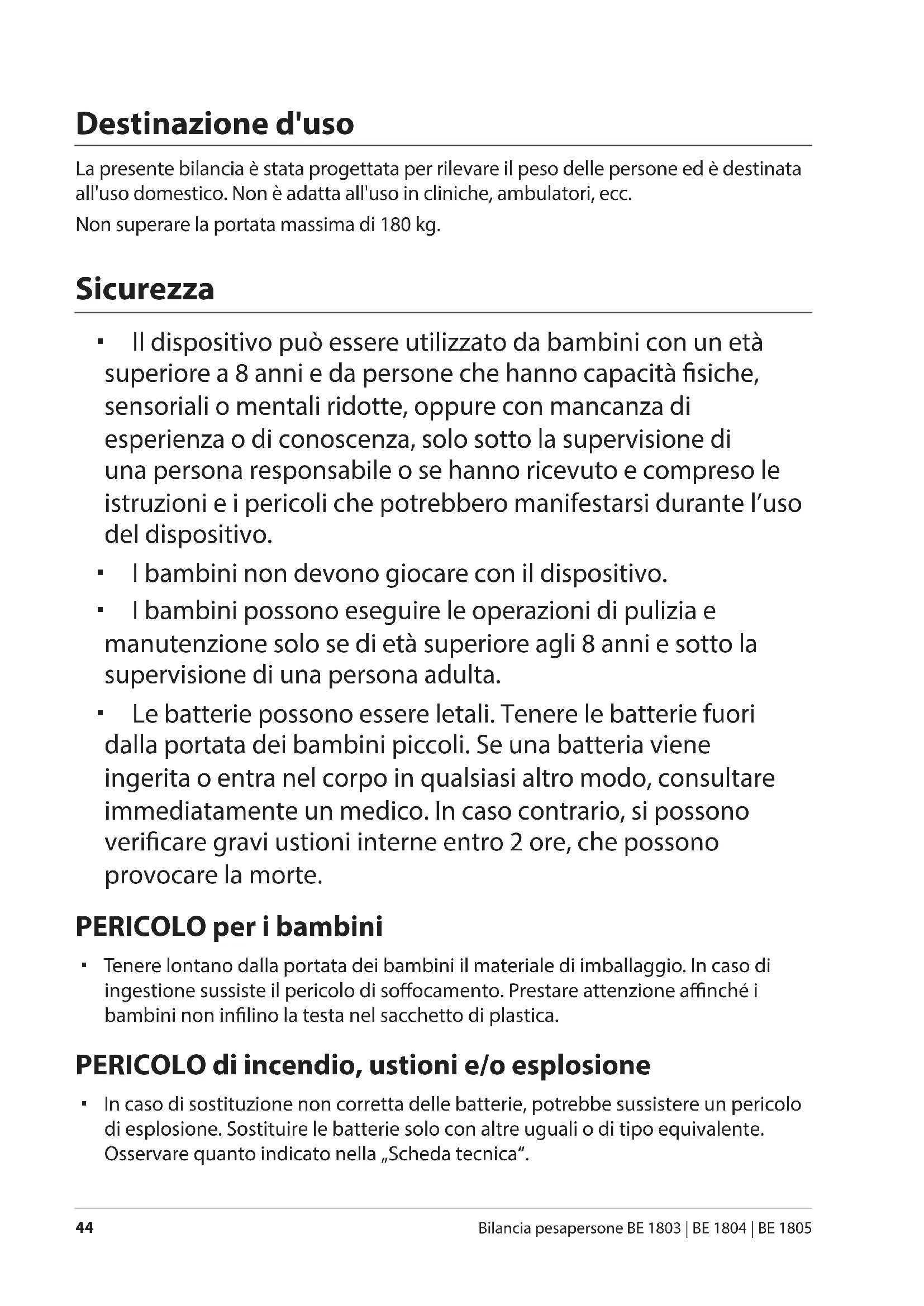 Bilancia pesapersone BE 1803 | BE 1804 | BE 1805 Destinazione d'uso La presente bilancia è stata progettata per rilevare il peso delle persone ed è destinata all'uso domestico. Non è adatta all'uso in cliniche, ambulatori, ecc. Non superare la portata massima di 180 kg. Sicurezza Il dispositivo può essere utilizzato da bambini con un età superiore a 8 anni e da persone che hanno capacità siche, sensoriali o mentali ridotte, oppure con mancanza di esperienza o di conoscenza, solo sotto la supervisione di una persona responsabile o se hanno ricevuto e compreso le istruzioni e i pericoli che potrebbero manifestarsi durante l’uso del dispositivo. I bambini non devono giocare con il dispositivo. I bambini possono eseguire le operazioni di pulizia e manutenzione solo se di età superiore agli 8 anni e sotto la supervisione di una persona adulta. Le batterie possono essere letali. Tenere le batterie fuori dalla portata dei bambini piccoli. Se una batteria viene ingerita o entra nel corpo in qualsiasi altro modo, consultare immediatamente un medico. In caso contrario, si possono vericare gravi ustioni interne entro 2 ore, che possono provocare la morte. PERICOLO per i bambini Tenere lontano dalla portata dei bambini il materiale di imballaggio. In caso di ingestione sussiste il pericolo di soocamento. Prestare attenzione anché i bambini non inlino la testa nel sacchetto di plastica. PERICOLO di incendio, ustioni e/o esplosione In caso di sostituzione non corretta delle batterie, potrebbe sussistere un pericolo di esplosione. Sostituire le batterie solo con altre uguali o di tipo equivalente. Osservare quanto indicato nella „Scheda tecnica“.Sicurezza