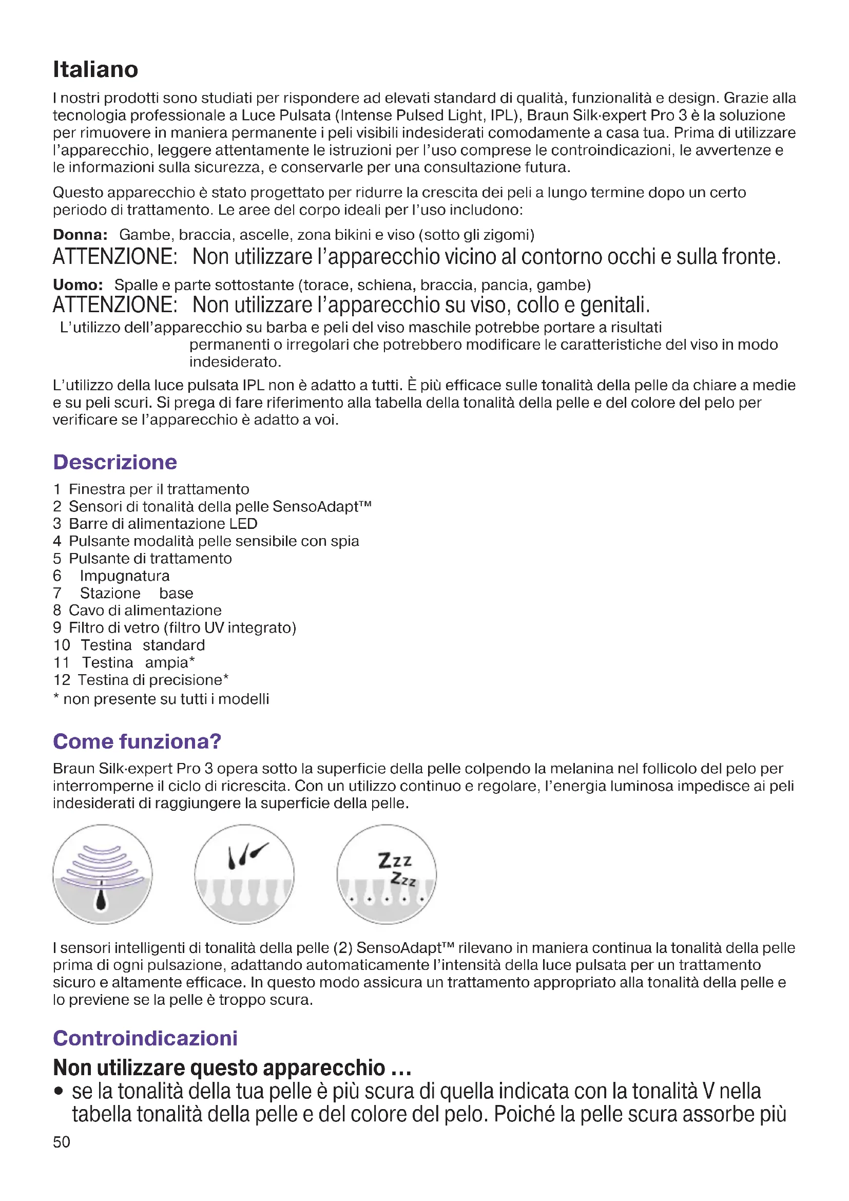 - non presente su tutti i modelli Come funziona? Braun Silk·expert Pro 3 opera sotto la superficie della pelle colpendo la melanina nel follicolo del pelo per interromperne il ciclo di ricrescita. Con un utilizzo continuo e regolare, l’energia luminosa impedisce ai peli indesiderati di raggiungere la superficie della pelle. I sensori intelligenti di tonalità della pelle (2) SensoAdapt™ rilevano in maniera continua la tonalità della pelle prima di ogni pulsazione, adattando automaticamente l’intensità della luce pulsata per un trattamento sicuro e altamente efficace. In questo modo assicura un trattamento appropriato alla tonalità della pelle e lo previene se la pelle è troppo scura. Controindicazioni Non utilizzare questo apparecchio ...