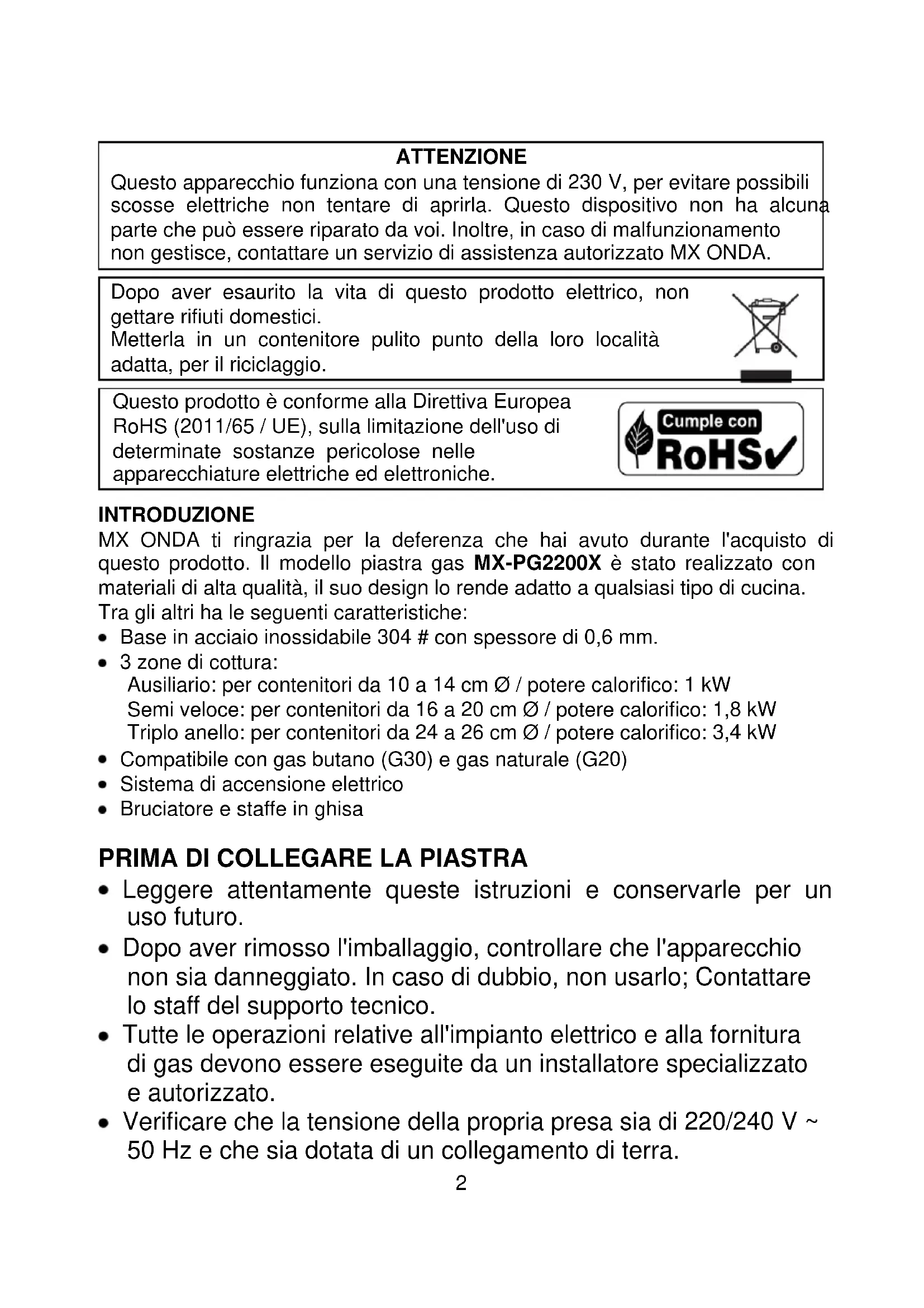 Questo prodotto è conforme alla Direttiva Europea RoHS (2011/65 / UE), sulla limitazione dell'uso di determinate sostanze pericolose nelle apparecchiature elettriche ed elettroniche. INTRODUZIONE MX ONDA ti ringrazia per la deferenza che hai avuto durante l'acquisto di questo prodotto. Il modello piastra gas MX-PG2200X è stato realizzato con materiali di alta qualità, il suo design lo rende adatto a qualsiasi tipo di cucina. Tra gli altri ha le seguenti caratteristiche: Base in acciaio inossidabile 304 # con spessore di 0,6 mm. 3 zone di cottura: Ausiliario: per contenitori da 10 a 14 cm Ø / potere calorifico: 1 kW Semi veloce: per contenitori da 16 a 20 cm Ø / potere calorifico: 1,8 kW Triplo anello: per contenitori da 24 a 26 cm Ø / potere calorifico: 3,4 kW Compatibile con gas butano (G30) e gas naturale (G20) Sistema di accensione elettrico Bruciatore e staffe in ghisa