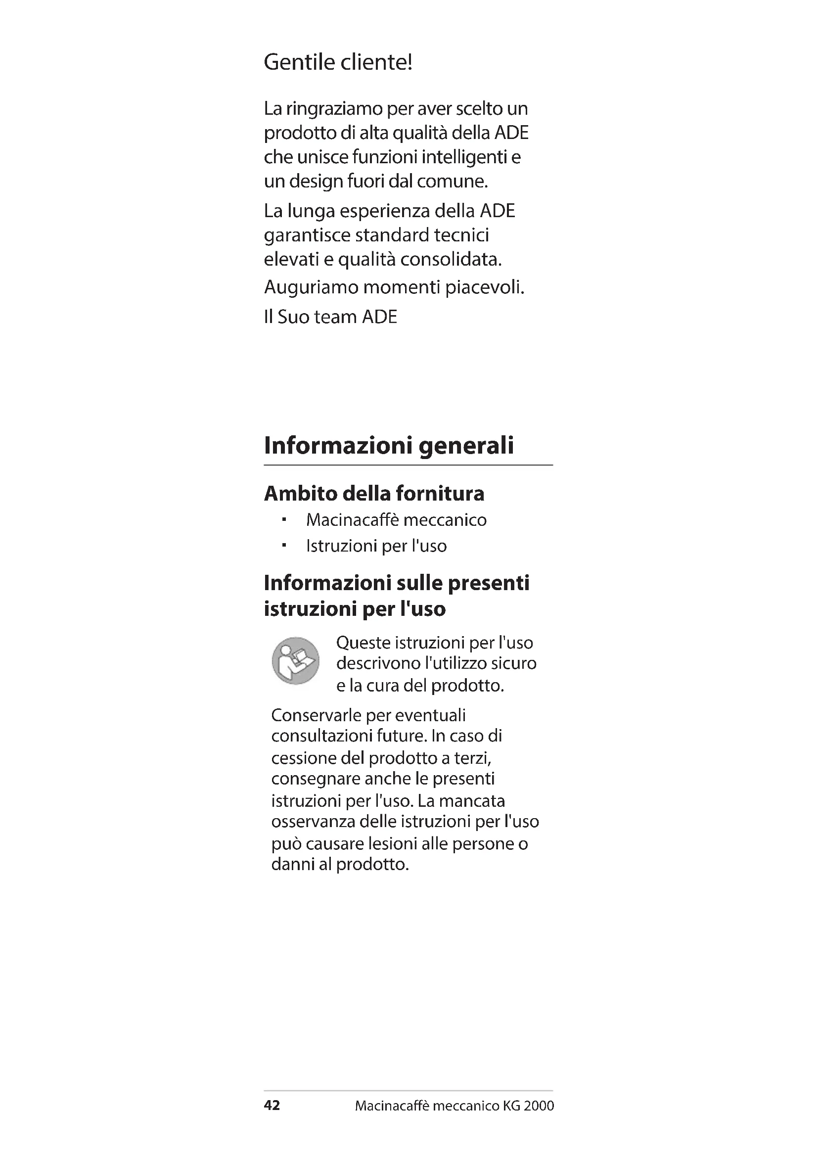 - Garanzia Macinacaffè meccanico KG 2000 Destinazione d'uso L'articolo è progettato per l'uso in abitazioni private e ai livelli indicati. L'apparecchio non è adatto all'uso commerciale o domestico nelle cucine per i dipendenti in negozi, uffici e altre aree commerciali, in proprietà agricole, da parte di clienti in alberghi, motel o altre strutture residenziali o in bed and breakfast. Macinare solo chicchi di caffè con il macinacaffè. Non utilizzare l’articolo come macinino per spezie. Sicurezza Il dispositivo può essere utilizzato da bambini con un’età superiore a 8anni e da persone che hanno capacità siche, sensoriali o mentali ridotte, oppure con mancanza di esperienza o di conoscenza, solo sotto la supervisione di una persona responsabile o se hanno ricevuto e compreso le istruzioni e i pericoli che potrebbero manifestarsi durante l’uso del dispositivo. I bambini non devono giocare con questo articolo.Macinacaffè meccanico KG 2000 p. 5144