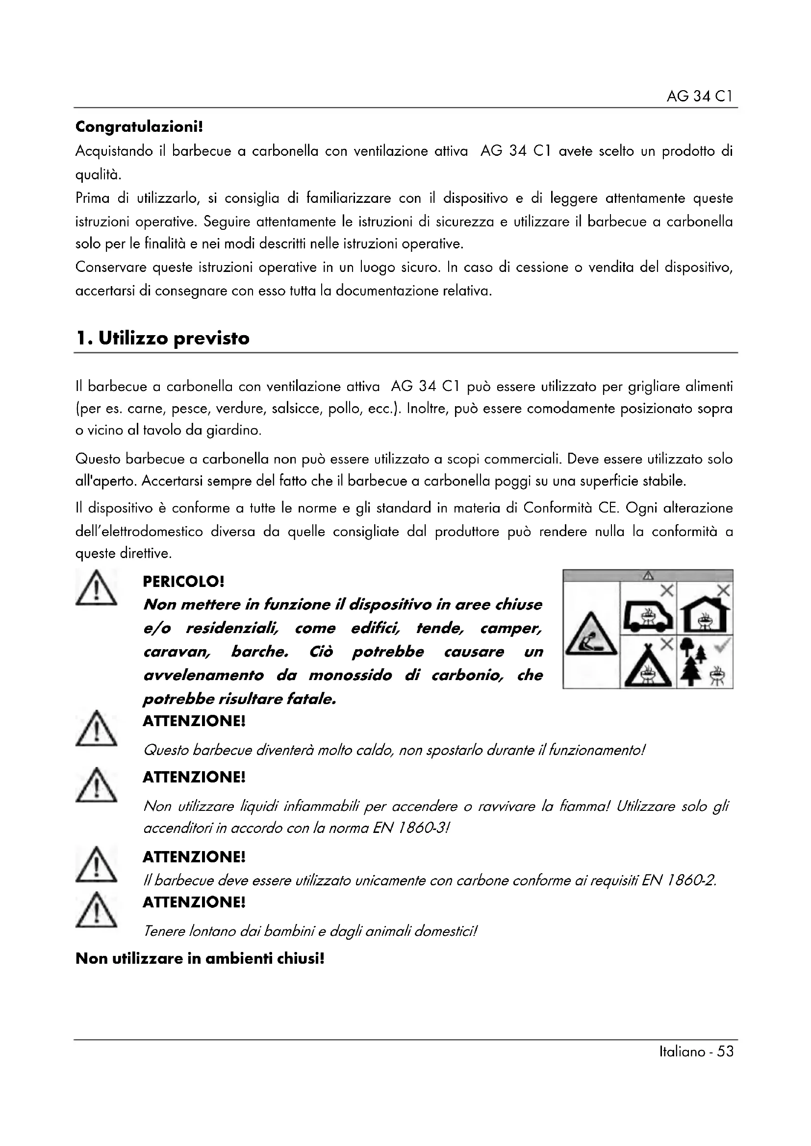11. Conformità ......................................................................................................... 72 12. Informazioni sulla garanzia ................................................................................ 73AG 34 C1 Italiano - 53 Congratulazioni! Acquistando il barbecue a carbonella con ventilazione attiva AG 34 C1 avete scelto un prodotto di qualità. Prima di utilizzarlo, si consiglia di familiarizzare con il dispositivo e di leggere attentamente queste istruzioni operative. Seguire attentamente le istruzioni di sicurezza e utilizzare il barbecue a carbonella solo per le finalità e nei modi descritti nelle istruzioni operative. Conservare queste istruzioni operative in un luogo sicuro. In caso di cessione o vendita del dispositivo, accertarsi di consegnare con esso tutta la documentazione relativa.