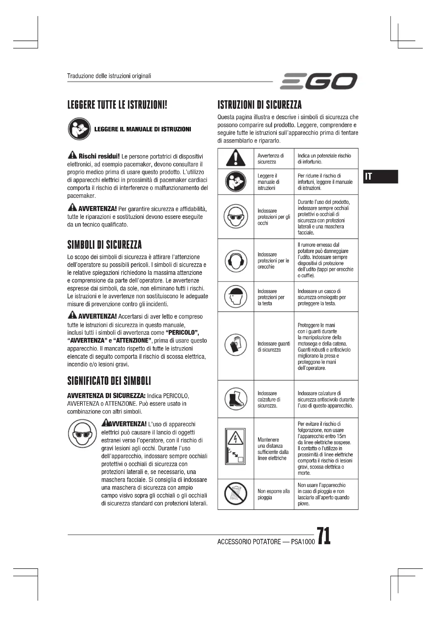 Questa pagina illustra e descrive i simboli di sicurezza che possono comparire sul prodotto. Leggere, comprendere e seguire tutte le istruzioni sull’apparecchio prima di tentare di assemblarlo e ripararlo.Avvertenza di sicurezzaIndica un potenziale rischio di infortunio.Leggere il manuale di istruzioniPer ridurre il rischio di infortuni, leggere il manuale di istruzioni.Indossare protezioni per gli occhiDurante l’uso del prodotto, indossare sempre occhiali protettivi o occhiali di sicurezza con protezioni laterali e una maschera facciale.Indossare protezioni per le orecchieIl rumore emesso dal potatore può danneggiare l’udito. Indossare sempre dispositivi di protezione dell’udito (tappi per orecchie o cuffie).Indossare protezioni per la testaIndossare un casco di sicurezza omologato per proteggere la testa.Indossare guanti di sicurezzaProteggere le mani con i guanti durante la manipolazione della motosega e della catena. Guanti robusti e antiscivolo migliorano la presa e proteggono le mani dell’operatore.Indossare calzature di sicurezza.Indossare calzature di sicurezza antiscivolo durante l’uso di questo apparecchio.Mantenere una distanza sufficiente dalla linee elettrichePer evitare il rischio di folgorazione, non usare l’apparecchio entro 15m da linee elettriche sospese. Il contatto o l’utilizzo in prossimità di linee elettriche comporta il rischio di lesioni gravi, scossa elettrica o morte.Non esporre alla pioggiaNon usare l’apparecchio in caso di pioggia e non lasciarlo all’aperto quando piove.Traduzione delle istruzioni originaliACCESSORIO POTATORE — PSA100072