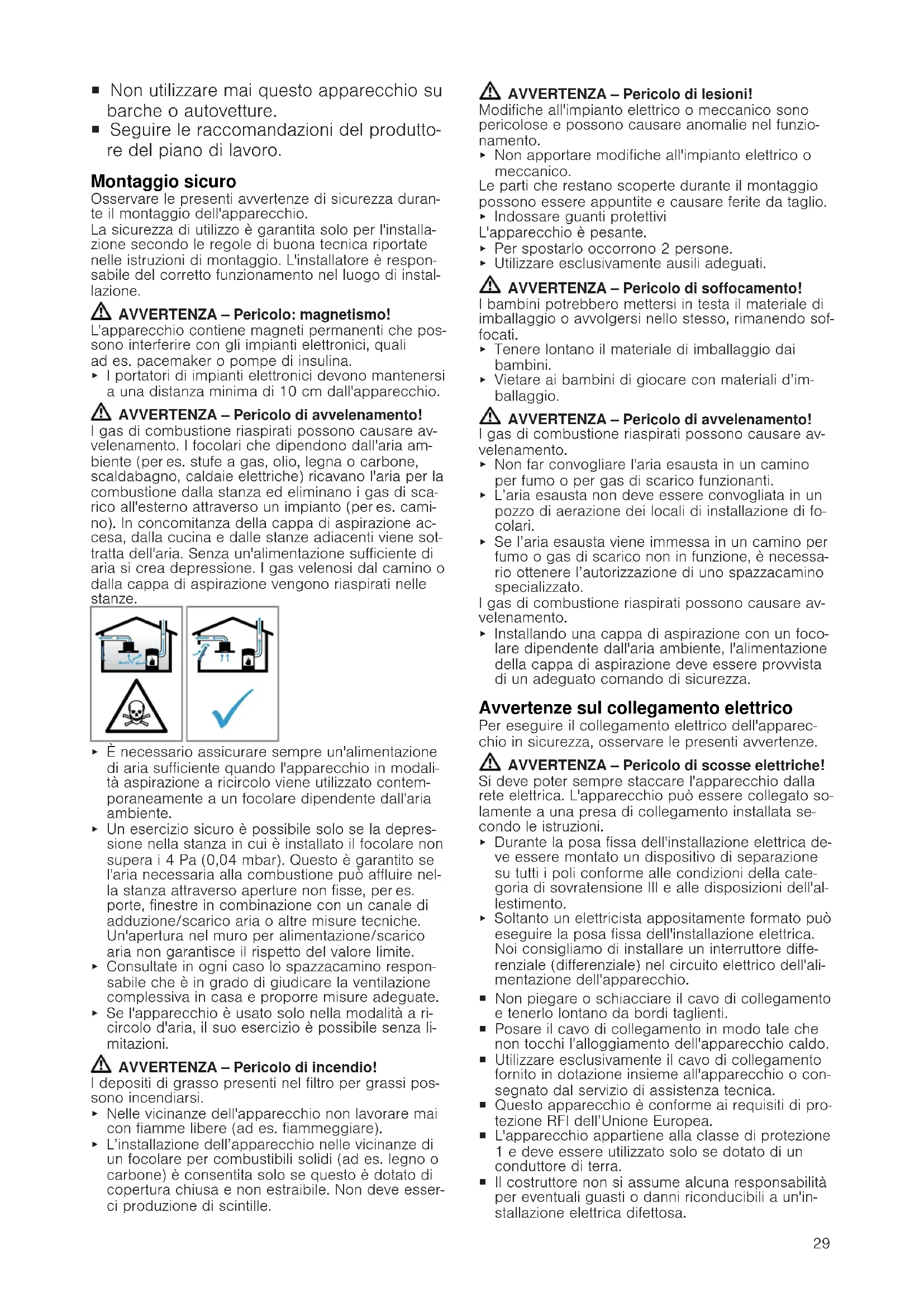 Avvertenze generali ¡ Leggere attentamente le presenti istruzio- ni. ¡ Il collegamento può essere eseguito esclusivamente da un tecnico specializza- to autorizzato. ¡ Prima di eseguire qualsiasi lavoro, stacca- re l'alimentazione della corrente.29 ¡ Non utilizzare mai questo apparecchio su barche o autovetture. ¡ Seguire le raccomandazioni del produtto- re del piano di lavoro. Montaggio sicuro Osservare le presenti avvertenze di sicurezza duran- te il montaggio dell'apparecchio. La sicurezza di utilizzo è garantita solo per l'installa- zione secondo le regole di buona tecnica riportate nelle istruzioni di montaggio. L'installatore è respon- sabile del corretto funzionamento nel luogo di instal- lazione. AVVERTENZA‒Pericolo: magnetismo! L'apparecchio contiene magneti permanenti che pos- sono interferire con gli impianti elettronici, quali ades. pacemaker o pompe di insulina. ▶ I portatori di impianti elettronici devono mantenersi a una distanza minima di 10cm dall'apparecchio. AVVERTENZA‒Pericolo di avvelenamento! I gas di combustione riaspirati possono causare av- velenamento. I focolari che dipendono dall'aria am- biente (per es. stufe a gas, olio, legna o carbone, scaldabagno, caldaie elettriche) ricavano l'aria per la combustione dalla stanza ed eliminano i gas di sca- rico all'esterno attraverso un impianto (per es. cami- no). In concomitanza della cappa di aspirazione ac- cesa, dalla cucina e dalle stanze adiacenti viene sot- tratta dell'aria. Senza un'alimentazione sufficiente di aria si crea depressione. I gas velenosi dal camino o dalla cappa di aspirazione vengono riaspirati nelle stanze. ▶ È necessario assicurare sempre un'alimentazione di aria sufficiente quando l'apparecchio in modali- tà aspirazione a ricircolo viene utilizzato contem- poraneamente a un focolare dipendente dall'aria ambiente. ▶ Un esercizio sicuro è possibile solo se la depres- sione nella stanza in cui è installato il focolare non supera i 4 Pa (0,04 mbar). Questo è garantito se l'aria necessaria alla combustione può affluire nel- la stanza attraverso aperture non fisse, per es. porte, finestre in combinazione con un canale di adduzione/scarico aria o altre misure tecniche. Un'apertura nel muro per alimentazione/scarico aria non garantisce il rispetto del valore limite. ▶ Consultate in ogni caso lo spazzacamino respon- sabile che è in grado di giudicare la ventilazione complessiva in casa e proporre misure adeguate. ▶ Se l'apparecchio è usato solo nella modalità a ri- circolo d'aria, il suo esercizio è possibile senza li- mitazioni. AVVERTENZA‒Pericolo di incendio! I depositi di grasso presenti nel filtro per grassi pos- sono incendiarsi. ▶ Nelle vicinanze dell'apparecchio non lavorare mai con fiamme libere (ad es. fiammeggiare). ▶ L’installazione dell’apparecchio nelle vicinanze di un focolare per combustibili solidi (ad es. legno o carbone) è consentita solo se questo è dotato di copertura chiusa e non estraibile. Non deve esser- ci produzione di scintille. AVVERTENZA‒Pericolo di lesioni! Modifiche all'impianto elettrico o meccanico sono pericolose e possono causare anomalie nel funzio- namento. ▶ Non apportare modifiche all'impianto elettrico o meccanico. Le parti che restano scoperte durante il montaggio possono essere appuntite e causare ferite da taglio. ▶ Indossare guanti protettivi L'apparecchio è pesante. ▶ Per spostarlo occorrono 2 persone. ▶ Utilizzare esclusivamente ausili adeguati. AVVERTENZA‒Pericolo di soffocamento! I bambini potrebbero mettersi in testa il materiale di imballaggio o avvolgersi nello stesso, rimanendo sof- focati. ▶ Tenere lontano il materiale di imballaggio dai bambini. ▶ Vietare ai bambini di giocare con materiali d’im- ballaggio. AVVERTENZA‒Pericolo di avvelenamento! I gas di combustione riaspirati possono causare av- velenamento. ▶ Non far convogliare l'aria esausta in un camino per fumo o per gas di scarico funzionanti. ▶ L’aria esausta non deve essere convogliata in un pozzo di aerazione dei locali di installazione di fo- colari. ▶ Se l’aria esausta viene immessa in un camino per fumo o gas di scarico non in funzione, è necessa- rio ottenere l’autorizzazione di uno spazzacamino specializzato. I gas di combustione riaspirati possono causare av- velenamento. ▶ Installando una cappa di aspirazione con un foco- lare dipendente dall'aria ambiente, l'alimentazione della cappa di aspirazione deve essere provvista di un adeguato comando di sicurezza. Avvertenze sul collegamento elettrico Per eseguire il collegamento elettrico dell'apparec- chio in sicurezza, osservare le presenti avvertenze. AVVERTENZA‒Pericolo di scosse elettriche! Si deve poter sempre staccare l'apparecchio dalla rete elettrica. L'apparecchio può essere collegato so- lamente a una presa di collegamento installata se- condo le istruzioni. ▶ Durante la posa fissa dell'installazione elettrica de- ve essere montato un dispositivo di separazione su tutti i poli conforme alle condizioni della cate- goria di sovratensione III e alle disposizioni dell'al- lestimento. ▶ Soltanto un elettricista appositamente formato può eseguire la posa fissa dell'installazione elettrica. Noi consigliamo di installare un interruttore diffe- renziale (differenziale) nel circuito elettrico dell'ali- mentazione dell'apparecchio. ¡ Non piegare o schiacciare il cavo di collegamento e tenerlo lontano da bordi taglienti. ¡ Posare il cavo di collegamento in modo tale che non tocchi l'alloggiamento dell'apparecchio caldo. ¡ Utilizzare esclusivamente il cavo di collegamento fornito in dotazione insieme all'apparecchio o con- segnato dal servizio di assistenza tecnica. ¡ Questo apparecchio è conforme ai requisiti di pro- tezione RFI dell’Unione Europea. ¡ L'apparecchio appartiene alla classe di protezione 1 e deve essere utilizzato solo se dotato di un conduttore di terra. ¡ Il costruttore non si assume alcuna responsabilità per eventuali guasti o d