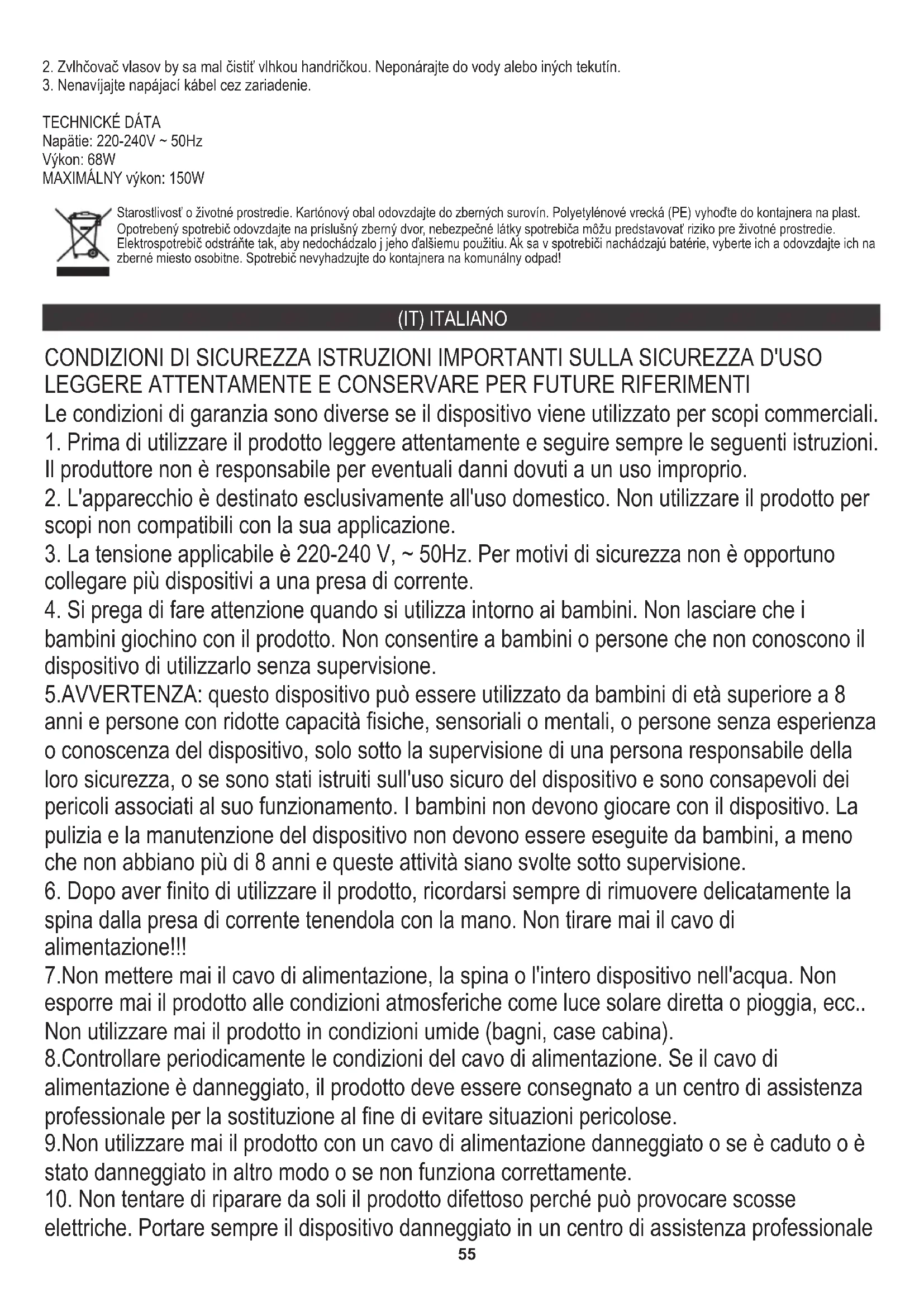 DATI TECNICI Potenza: 68W Potenza MASSIMA: 150W PULIZIA BLOCCO TEMPERATURA Tensione: 220-240 V~ 50Hz Non gettare l'apparecchio nei contenitori dei rifiuti urbani! Gli imballi di cartone devono essere smaltiti nel contenitore per la carta. I sacchetti di polietilene (PE) vanno gettati nel contenitore per la plastica. L'apparecchio usato deve essere rottamato presso un centro di raccolta autorizzato, poiché contiene elementi pericolosi che potrebbero costituire una minaccia per l'ambiente. I dispositivi elettrici devono essere resi al fine di evitare il loro riutilizzo. Se il dispositivo contiene una batteria, deve essere rimossa e smaltita separatamente in un punto di raccolta. Prendersi cura dell'ambiente (SR) СРПСКИ БЕЗБЕДНОСНИ УСЛОВИ ВАЖНА УПУТСТВА О БЕЗБЕДНОСТИ УПОТРЕБЕ МОЛИМ ВАС ПРОЧИТАЈТЕ ПАЖЉИВО И ЗАЧУВАЈТЕ ЗА БУДУЋУ РЕФЕРЕНЦУ Услови гаранције су другачији, ако се уређај користи у комерцијалне сврхе.