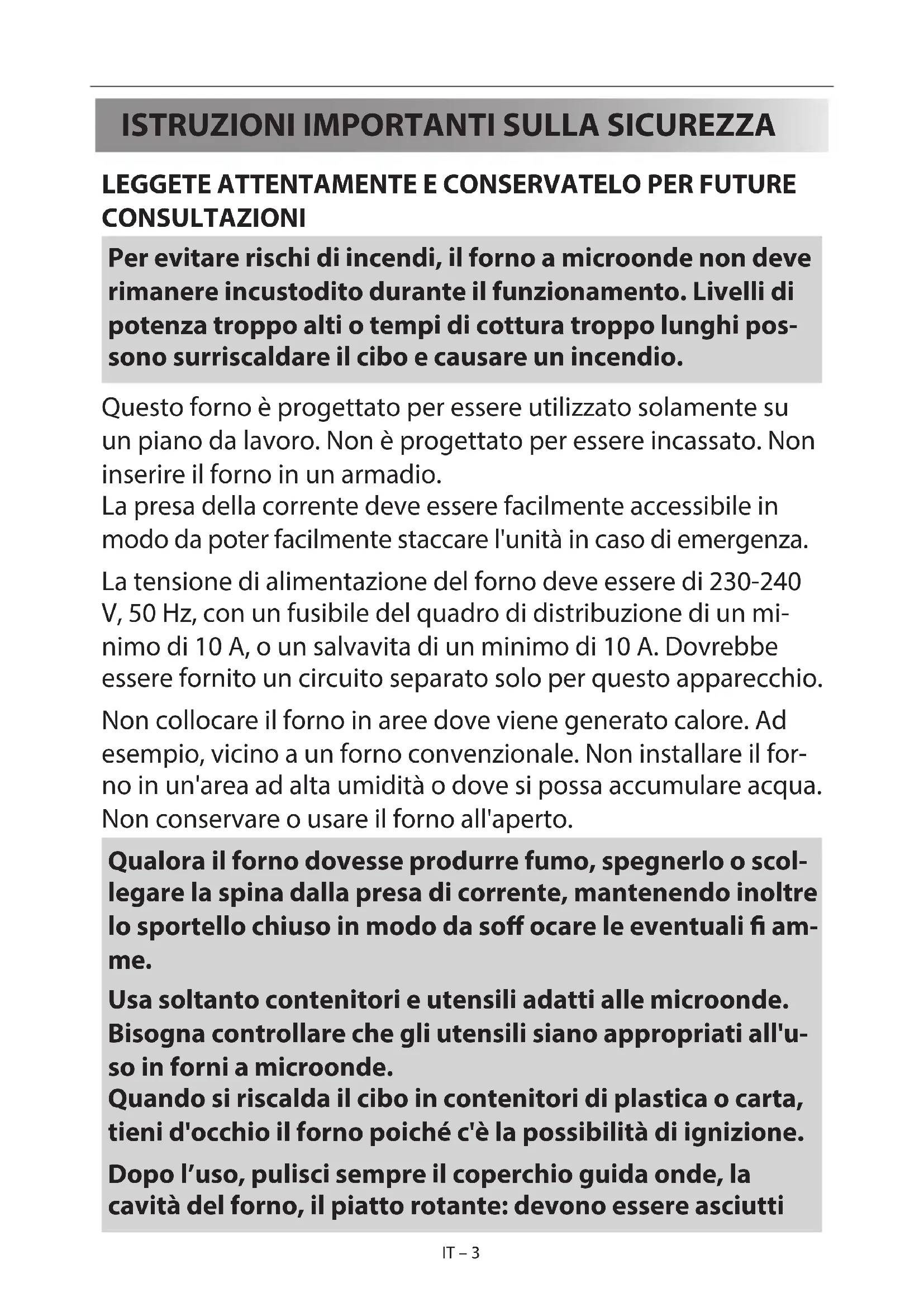CONSULTAZIONI Per evitare rischi di incendi, il forno a microonde non deve rimanere incustodito durante il funzionamento. Livelli di potenza troppo alti o tempi di cottura troppo lunghi pos- sono surriscaldare il cibo e causare un incendio. Questo forno è progettato per essere utilizzato solamente su un piano da lavoro. Non è progettato per essere incassato. Non inserire il forno in un armadio. La presa della corrente deve essere facilmente accessibile in modo da poter facilmente staccare l'unità in caso di emergenza. La tensione di alimentazione del forno deve essere di 230-240 V, 50 Hz, con un fusibile del quadro di distribuzione di un mi- nimo di 10 A, o un salvavita di un minimo di 10 A. Dovrebbe essere fornito un circuito separato solo per questo apparecchio. Non collocare il forno in aree dove viene generato calore. Ad esempio, vicino a un forno convenzionale. Non installare il for- no in un'area ad alta umidità o dove si possa accumulare acqua. Non conservare o usare il forno all'aperto. Qualora il forno dovesse produrre fumo, spegnerlo o scol- legare la spina dalla presa di corrente, mantenendo inoltre lo sportello chiuso in modo da soff ocare le eventuali am- me. Usa soltanto contenitori e utensili adatti alle microonde. Bisogna controllare che gli utensili siano appropriati all'u- so in forni a microonde. Quando si riscalda il cibo in contenitori di plastica o carta, tieni d'occhio il forno poiché c'è la possibilità di ignizione. Dopo l’uso, pulisci sempre il coperchio guida onde, la cavità del forno, il piatto rotante: devono essere asciutti IT – 4IT – 4 e senza tracce di grasso. Gli accumuli di grasso possono surriscaldarsi, fumare o in ammarsi. Non mettere materiali in ammabili vicino al forno o alle aper- ture di ventilazione. Non ostruire le aperture di ventilazione. Togliere dal cibo e dal suo involucro i sigilli e li di chiusura me- tallici. La formazione di archi elettrici sulle super ci metalliche può causare un incendio. Non usare il forno a microonde per friggere o riscaldare l’olio di frittura. La temperatura in tal caso non può essere controllata e può prendere fuoco. Per fare i pop corn, usate esclusivamente quelli prodotti per i microonde. Non conservare cibo od oggetti all’interno del forno. Controllare le impostazioni dopo aver avviato il forno, per ac- certarsi che esso funzioni nel modo desiderato. Non lasciare il forno senza supervisione mentre è in funzione. Per evitare surriscaldamento o incendio, prestare molta atten- zione alla cottura o al riscaldamento di cibi che contengono molto zucchero o sostanze grasse, quali ad esempio salsicce, pasticci di carne o dolci. Leggi i suggerimenti corrispondenti nel manuale d'uso. Per evitare il rischio di lesioni. ATTENZIONE: Non usare il forno se è danneggiato o non funziona normal- mente. Controllare quanto segue prima di continuare ad usarlo: a) Assicurarsi che lo sportello si chiuda correttamente e che non sia fuori sesto o deformato. b) Controllare per assicurarsi che i cardini e i blocchi di sicu- rezza dello sportello non siano rotti o allentati. c) Assicurarsi che le guarnizioni e le super ci di tenuta dello sportello non siano danneggiate.IT IT – 3IT – 3