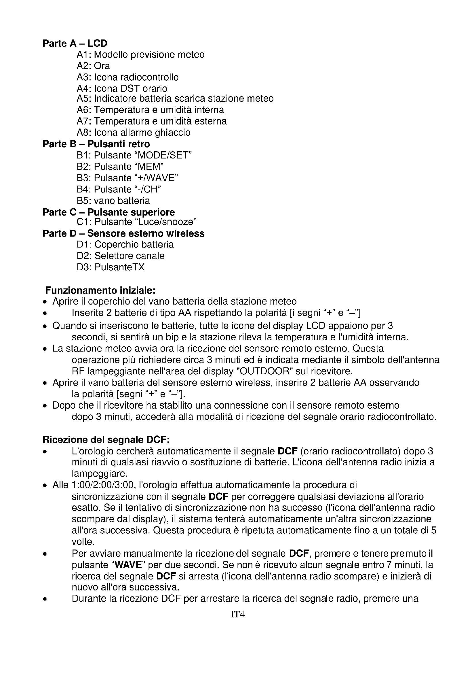 Dit symbooltje betekent dat u elektrische apparaten aan het einde van hun levensduur niet als algemeen, huishoudelijk afval mag afvoeren. Lever uw apparaat in bij een plaatselijk inzamelpunt voor afvalverwerking of bij een recyclingcentrum. Dit geldt voor alle landen in de Europese Unie, en voor andere Europese landen met inzamelsystemen voor gescheiden afval.IT1 Manuale WS9255-DCF Funzioni: Funzione orario radiocontrollato DCF formato 12/24 ore Funzione sveglia giornaliera Funzione Snooze (OFF o 1~60min) Indicatore di batteria quasi scarica Umidità: Campo di misurazione per ambienti interni ed esterni: 20% RH ~ 95% RH Temperatura o Intervalli misurazione temperatura interna: -9,9 °C (14,1 °F) ~ 50 °C (122 °F) o Intervalli misurazione temperatura esterna: -25 °C (-13 °F) ~ 50 °C (122 °F) o Temperatura commutabile in °C o °F. o Termometro esterno e allarme ghiaccio Indicazione valore massimo/minimo di temperatura e umidità Sensore da esterni wireless: o Montaggio a parete o supporto da tavolo o 3 canali selezionabili o Frequenza di trasmissione RF 433,92 MHz o Potenza massima di trasmissione: 13 dBm o Raggio di trasmissione di 30 metri in un’area senza ostacoli Funzione previsioni meteo Alimentazione: Stazione meteo: Batteria: 2 x LR6 AA Sensore da esterni wireless: Batteria: 2 x LR6 AAIT2 Stazione meteoIT3IT4 Parte A – LCD A1: Modello previsione meteo A2: Ora A3: Icona radiocontrollo A4: Icona DST orario A5: Indicatore batteria scarica stazione meteo A6: Temperatura e umidità interna A7: Temperatura e umidità esterna A8: Icona allarme ghiaccio Parte B – Pulsanti retro B1: Pulsante “MODE/SET” B2: Pulsante “MEM” B3: Pulsante “+/WAVE” B4: Pulsante “-/CH” B5: vano batteria Parte C – Pulsante superiore C1: Pulsante “Luce/snooze” Parte D – Sensore esterno wireless D1: Coperchio batteria D2: Selettore canale D3: PulsanteTX Funzionamento iniziale: Aprire il coperchio del vano batteria della stazione meteo Inserite 2 batterie di tipo AA rispettando la polarità [i segni “+” e “–”] Quando si inseriscono le batterie, tutte le icone del display LCD appaiono per 3 secondi, si sentirà un bip e la stazione rileva la temperatura e l'umidità interna. La stazione meteo avvia ora la ricezione del sensore remoto esterno. Questa operazione più richiedere circa 3 minuti ed è indicata mediante il simbolo dell'antenna RF lampeggiante nell'area del display "OUTDOOR" sul ricevitore. Aprire il vano batteria del sensore esterno wireless, inserire 2 batterie AA osservando la polarità [segni “+” e “–”]. Dopo che il ricevitore ha stabilito una connessione con il sensore remoto esterno dopo 3 minuti, accederà alla modalità di ricezione del segnale orario radiocontrollato. Ricezione del segnale DCF: L'orologio cercherà automaticamente il segnale DCF (orario radiocontrollato) dopo 3 minuti di qualsiasi riavvio o sostituzione di batterie. L'icona dell'antenna radio inizia a lampeggiare. Alle 1:00/2:00/3:00, l'orologio effettua automaticamente la procedura di sincronizzazione con il segnale DCF per correggere qualsiasi deviazione all'orario esatto. Se il tentativo di sincronizzazione non ha successo (l'icona dell'antenna radio scompare dal display), il sistema tenterà automaticamente un'altra sincronizzazione all'ora successiva. Questa procedura è ripetuta automaticamente fino a un totale di 5 volte. Per avviare manualmente la ricezione del segnale DCF, premere e tenere premuto il pulsante “WAVE” per due secondi. Se non è ricevuto alcun segnale entro 7 minuti, la ricerca del segnale DCF si arresta (l'icona dell'antenna radio scompare) e inizierà di nuovo all'ora successiva. Durante la ricezione DCF per arrestare la ricerca del segnale radio, premere unaIT5 volta il pulsante “WAVE”. Nota: Un'icona dell'antenna radio lampeggiante indica che la ricezione del segnale DCF è iniziata Un'icona dell'antenna radio fissa indica che il segnale DCF è stato ricevuto con successo Raccomandiamo una distanza minima di 2,5 m da tutte le fonti di interferenza, come televisioni o monitor di computer La ricezione radio è più debole in ambienti con mura in cemento (ad es. in cantine) e in uffici. In tali circostanze estreme, porre il sistema vicino alla finestra. Durante la modalità di ricezione DCF, solo "SNOOZE/LUCE" e il pulsante “WAVE” funzionano, altri pulsanti non hanno funzione. Se si vogliono usare altre funzioni, premere il pulsante “WAVE” per uscire dalla modalità di ricezione DCF.