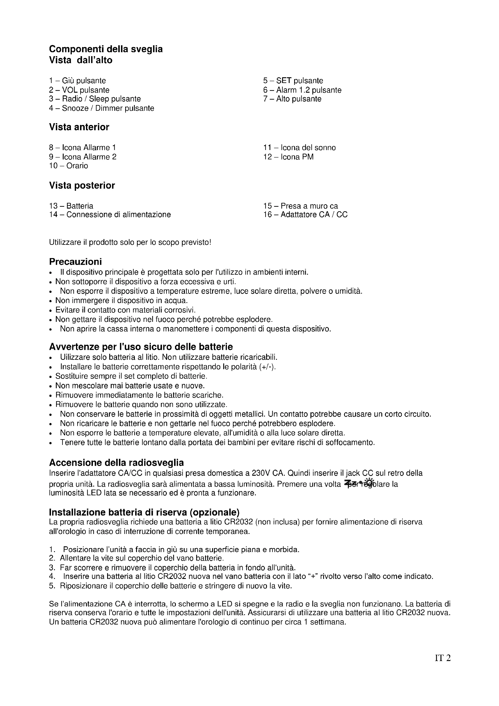 Utilizzare il prodotto solo per lo scopo previsto! Precauzioni Il dispositivo principale è progettata solo per l'utilizzo in ambienti interni. Non sottoporre il dispositivo a forza eccessiva e urti. Non esporre il dispositivo a temperature estreme, luce solare diretta, polvere o umidità. Non immergere il dispositivo in acqua. Evitare il contatto con materiali corrosivi. Non gettare il dispositivo nel fuoco perché potrebbe esplodere. Non aprire la cassa interna o manomettere i componenti di questa dispositivo. Avvertenze per l'uso sicuro delle batterie Uilizzare solo batteria al litio. Non utilizzare batterie ricaricabili. Installare le batterie correttamente rispettando le polarità (+/-). Sostituire sempre il set completo di batterie. Non mescolare mai batterie usate e nuove. Rimuovere immediatamente le batterie scariche. Rimuovere le batterie quando non sono utilizzate. Non conservare le batterie in prossimità di oggetti metallici. Un contatto potrebbe causare un corto circuito. Non ricaricare le batterie e non gettarle nel fuoco perché potrebbero esplodere. Non esporre le batterie a temperature elevate, all'umidità o alla luce solare diretta. Tenere tutte le batterie lontano dalla portata dei bambini per evitare rischi di soffocamento. Accensione della radiosveglia Inserire l'adattatore CA/CC in qualsiasi presa domestica a 230V CA. Quindi inserire il jack CC sul retro della propria unità. La radiosveglia sarà alimentata a bassa luminosità. Premere una volta per regolare la luminosità LED lata se necessario ed è pronta a funzionare. Installazione batteria di riserva (opzionale) La propria radiosveglia richiede una batteria a litio CR2032 (non inclusa) per fornire alimentazione di riserva all'orologio in caso di interruzione di corrente temporanea.