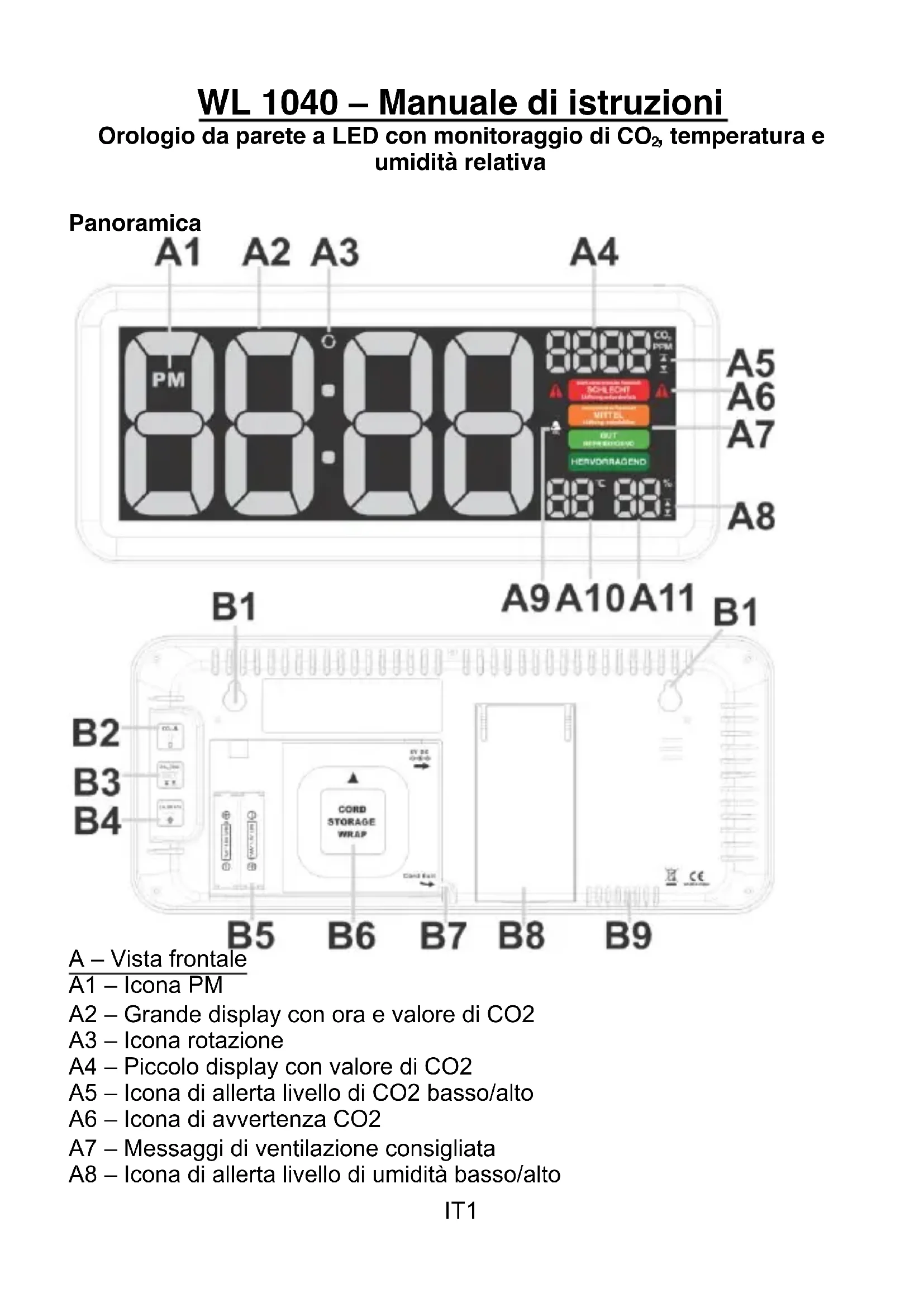 , temperatura e umidità relativa Panoramica A – Vista frontale A1 – Icona PM A2 – Grande display con ora e valore di CO2 A3 – Icona rotazione A4 – Piccolo display con valore di CO2 A5 – Icona di allerta livello di CO2 basso/alto A6 – Icona di avvertenza CO2 A7 – Messaggi di ventilazione consigliata A8 – Icona di allerta livello di umidità basso/altoIT2 A9 – Icona suono allerta CO2 A10 – Temperatura interna A11 – Umidità interna B – Vista posteriore B1 – Fori per appendere il dispositivo B2 – Pulsante +(più) B3 – Pulsante SET B4 – Pulsante -(meno) B5 – Vano batteria B6 – Involucro per riporre il cavo dell'alimentatore B7 – Uscita cavo dell'alimentatore B8 – Supporto B9 – Ventilazione sensore CO2 Caratteristiche principali