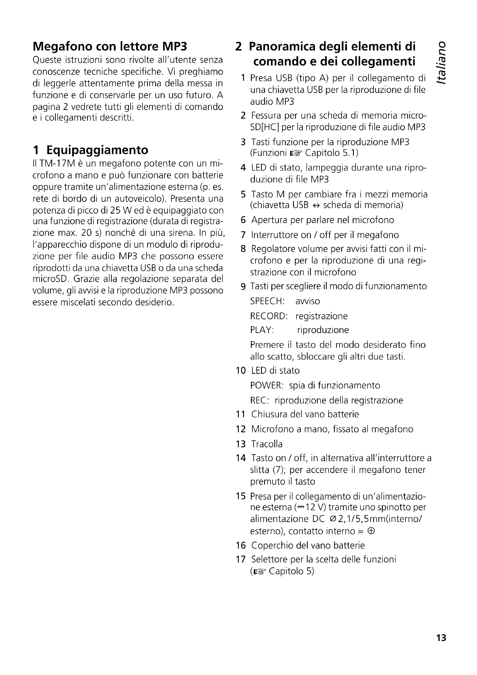 INTERNATIONAL GmbH & Co. KG. Toute repro- duction même partielle à des fins commerciales est interdite.13 Referenz für Sprachkennzeichnung der Seiten und Inhaltsverzeichnis Referenz für Sprachen-Inhaltsverzeichnis Italiano Italiano Pagina Megafono con lettore MP3 Queste istruzioni sono rivolte all’utente senza conoscenze tecniche specifiche. Vi preghiamo di leggerle attentamente prima della messa in funzione e di conservarle per un uso futuro. A pagina 2 vedrete tutti gli elementi di comando e i collegamenti descritti. 1 Equipaggiamento Il TM-17M è un megafono potente con un mi- crofono a mano e può funzionare con batterie oppure tramite un’alimentazione esterna (p. es. rete di bordo di un autoveicolo). Presenta una potenza di picco di 25 W ed è equipaggiato con una funzione di registrazione (durata di registra- zione max. 20 s) nonché di una sirena. In più, l’apparecchio dispone di un modulo di riprodu- zione per file audio MP3 che possono essere riprodotti da una chiavetta USB o da una scheda microSD. Grazie alla regolazione separata del volume, gli avvisi e la riproduzione MP3 possono essere miscelati secondo desiderio. 2 Panoramica degli elementi di comando e dei collegamenti