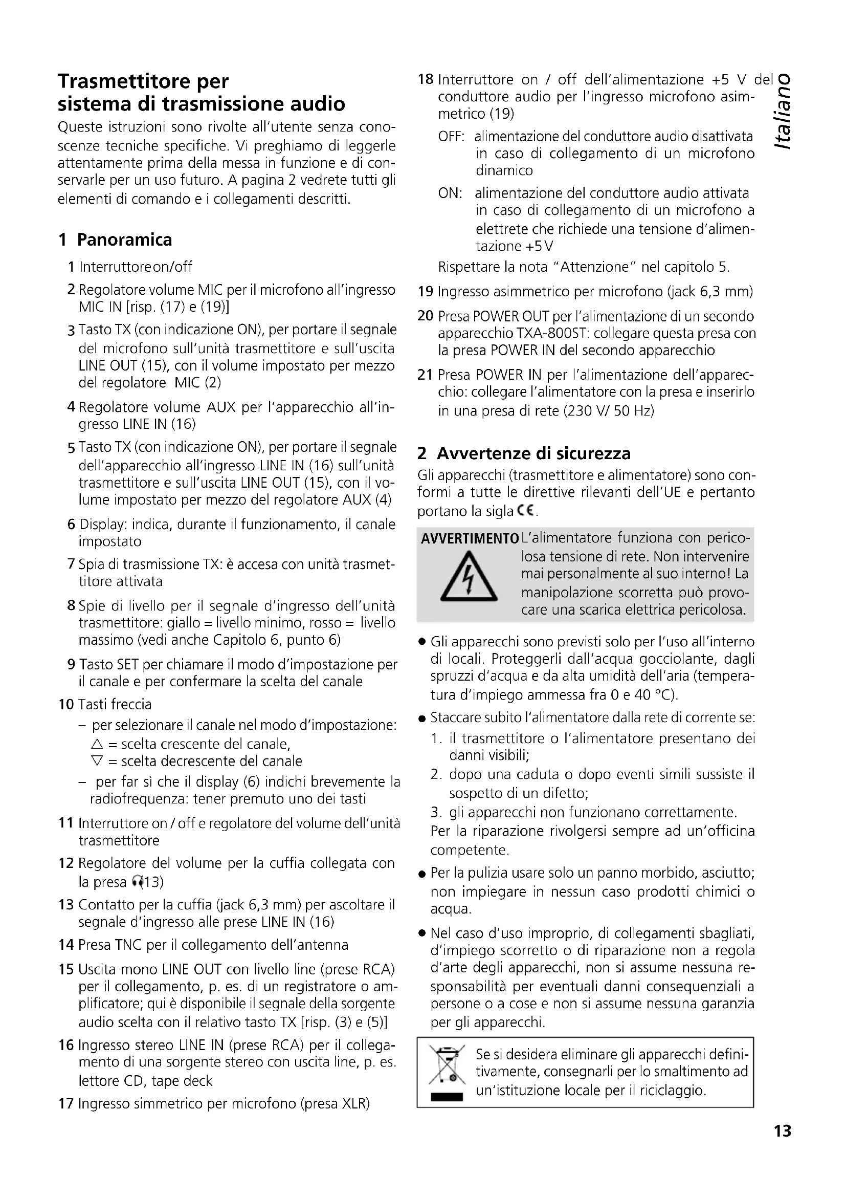 Questo trasmettitore PLL multiband, in collegamento con un ricevitore sintonizzato sulla stessa radiofrequency, costituisce un sistema wireless di trasmissione audio mono. Il segnale del trasmettitore può essere trasmesso ad un numero illimitato di ricevitori. Il systemà èindicato quando in modo particolare per le applicazioni dove il segnale di una sorgente devese essere trasmesso a più personne, come per esempio nel caso di visite guidate o di conferenze in più lingue. Per la trasmissione radio sono disponibili 16 canali nel settore UHF, da 863,1 MHz a 864,9 MHz.