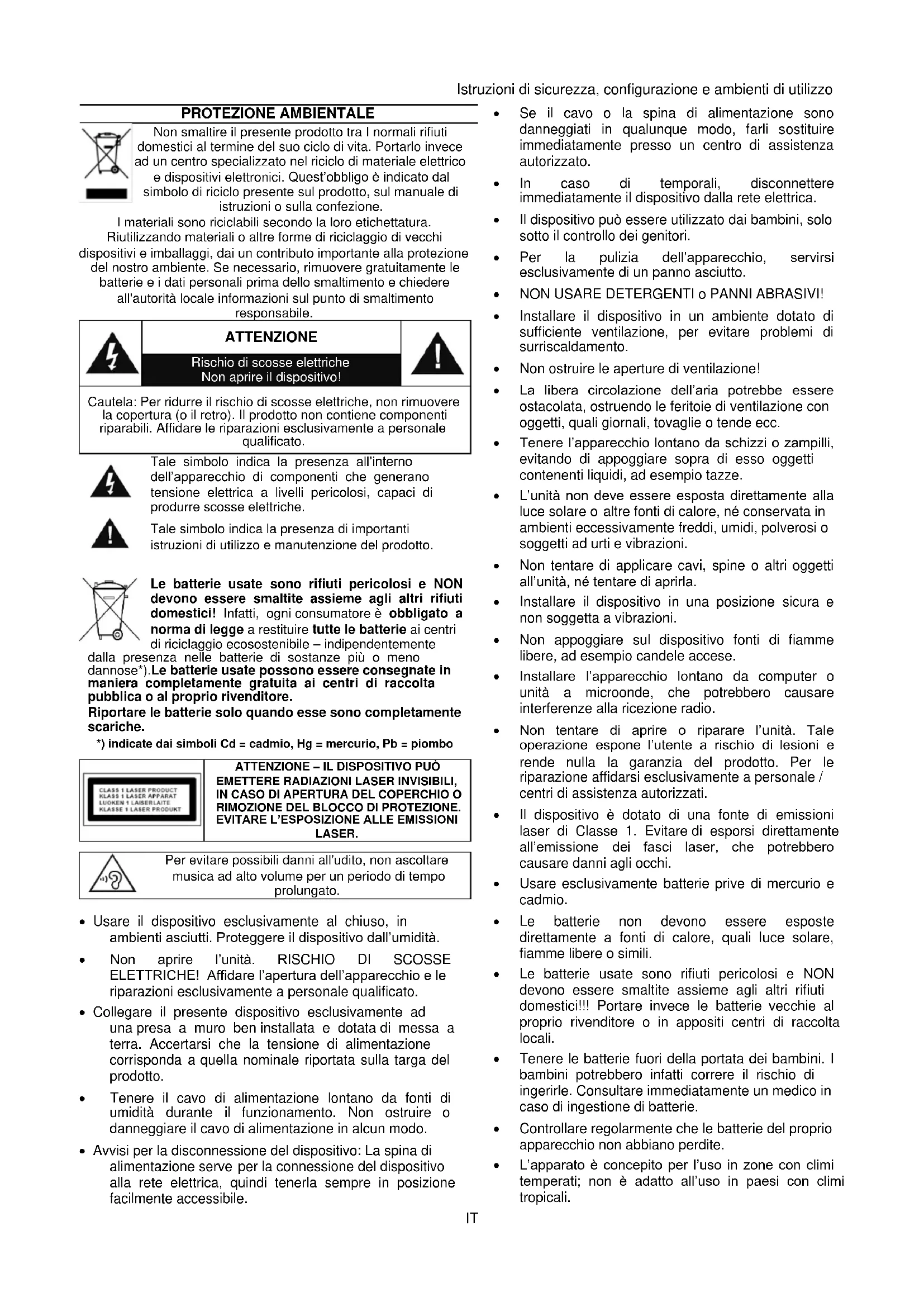 - Il dispositivo è dotato di una fonte di emissioni laser di Classe 1. Evitare di esporsi direttamente all’emissione dei fasci laser, che potrebbero causare danni agli occhi.