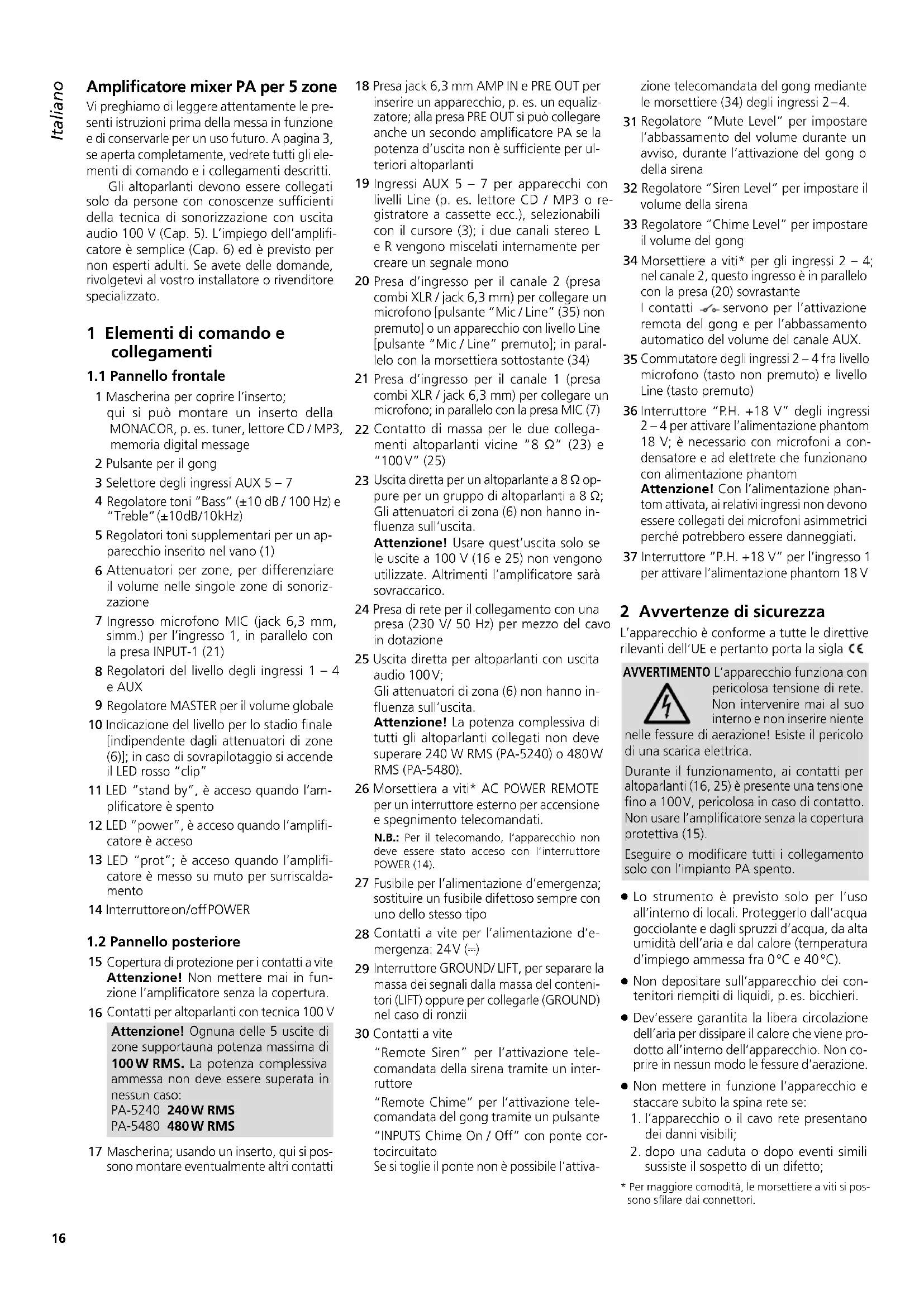 Nel caso d’uso improprio, di collegamenti sbagliati, d’impiego scorretto o di ripara- zione non a regola d’arte non si assume nessuna responsabilità per eventuali danni a persone o a cose. Se si desidera eliminare l’apparec- chio definitivamente, consegnarlo per lo smaltimento ad un’istituzione locale per il riciclaggio. 3 Possibilità d’impiego e accessori Gli amplificatori PA-5240 e PA-5480 sono pre- visti specialmente per l’impiego in impianti PA con uscita audio 100 V. Le uscite audio 100 V sono disponibili per un massimo di cinque zone di sonorizzazione il cui volume può essere regolato individualmente. Ai cin- que canali d’ingresso, miscelabili fra di loro, si possono collegare microfoni (canali 1 – 4) o apparecchi con livello Line (canali 2 – 5). Nel vano per l’inserto (1) si può inserire uno dei seguenti inserti della MONACOR: PA-1120DMT memoria digital-message con timer PA-1140RCD tuner / lettore CD PA-1200C timer PA-1200RDS radio AM / FM Il microfono da tavolo PA / PTT, PA-5000PTT della MONACOR, è previsto specialmente per questi amplificatori come accessorio separato e può essere collegato con le morsettiere (34) dei canali 2 – 4. 4 Collocare l’amplificatore L’amplificatore è previsto per il montaggio in un rack (482 mm / 19”), ma può essere usato anche su un tavolo. In ogni caso è neces- sario che l’aria possa circolare liberamente attraverso tutte le fessure di aerazione per garantire un raffreddamento sufficiente dello stadio finale.