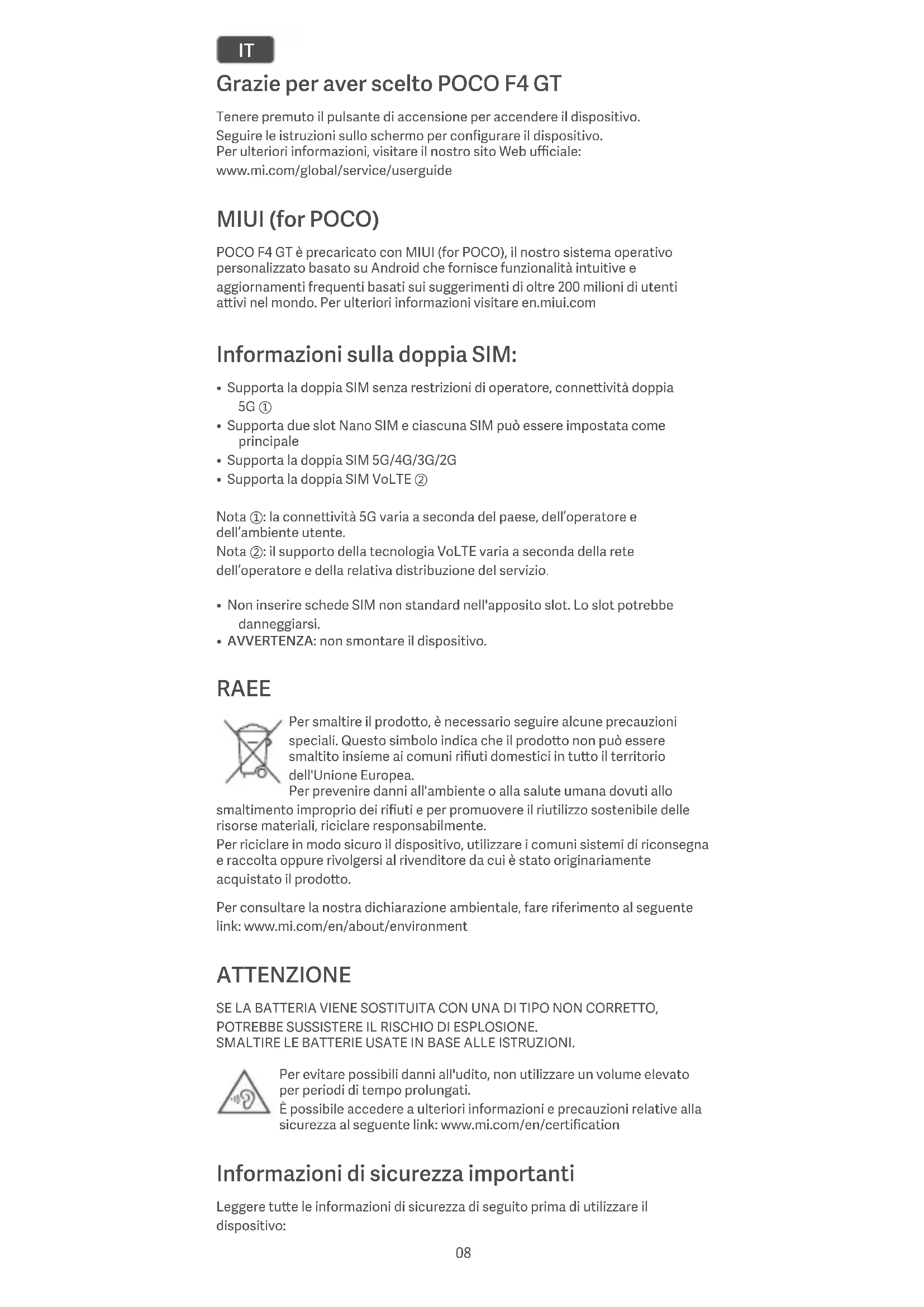 - Non utilizzare il telefono in luoghi caraerizzati da umidità elevata, ad esempio sale da bagno. In caso contrario si potrebbero verificare scosse eleriche, lesioni, incendi e danni al caricabaeria. Informativa sulla sicurezza Aggiornare il sistema operativo del telefono utilizzando la funzionalità di aggiornamento soware integrata o recarsi presso uno dei nostri centri di assistenza autorizzati. L'aggiornamento del soware araverso altri mezzi può danneggiare il dispositivo o comportare la perdita di dati, problemi di sicurezza e altri rischi. Informazioni legali Il dispositivo può essere utilizzato in tui gli stati membri dell'UE. Osservare le normative locali e nazionali del luogo in cui il dispositivo viene utilizzato. Questo dispositivo è destinato all'utilizzo solo in ambienti interni quando utilizzato nell'intervallo di frequenza 5150 - 5350 MHz, 5925 - 6425 MHz nei seguenti paesi: AT BE BG HR CY CZ DK EE FI FR DE EL HU IE IT LV LT LU MT NL PL PT RO SK SI ES SE UK(NI) IS LI NO CH TR La conneività Wi-Fi 6E può variare in base alla disponibilità regionale e al supporto della rete locale. La funzione può essere aggiunta tramite OTA quando e dove applicabile. Restrizioni nella banda 2,4 GHz: Norvegia: questa soosezione non si applica all'area geografica nel raggio di 20 km dal centro di Ny-Ålesund. Accertarsi che l'alimentatore utilizzato soddisfi i requisiti della clausola 6.4.5 della norma IEC/EN 62368-1 e sia stato testato e approvato in conformità con le norme nazionali o locali. Dichiarazione di non responsabilità La presente guida per l'utente è pubblicata da Xiaomi o dalla propria società affiliata locale. Miglioramenti e modifiche a questa guida per l'utente, resi necessari da errori tipografici, imprecisioni relative alle informazioni correnti o miglioramenti a programmi e/o apparecchiature, possono essere apportati da Xiaomi in qualsiasi momento e senza preavviso. Tali modifiche saranno tuavia integrate nelle nuove edizioni online della presente guida per l'utente (consultare i deagli alla pagina Web www.mi.com/global/service/userguide). Tue le illustrazioni sono fornite esclusivamente a scopo indicativo e potrebbero non rappresentare in modo accurato il dispositivo reale. PAP 21 PAP 22 PP 5 Carta Carta Plastica RACCOLTA DIFFERENZIATA Verifica le disposizioni del tuo Comune. Separa le componenti e conferiscile in modo correo. 10ES Gracias por elegir POCO F4 GT Mantenga pulsado el botón de encendido para encender el dispositivo. Siga las instrucciones que aparecen en pantalla para configurar el dispositivo. Para obtener más información, visite nuestro sitio web oficial: www.mi.com/global/service/userguide MIUI (para POCO) POCO F4 GT trae preinstalado MIUI (para POCO), nuestro sistema operativo personalizado basado en Android, con actualizaciones frecuentes y funciones fáciles de usar derivadas de las sugerencias de más de 200 millones de usuarios activos en todo el mundo. Para obtener más información, visite en.miui.com Acerca de la SIM dual: