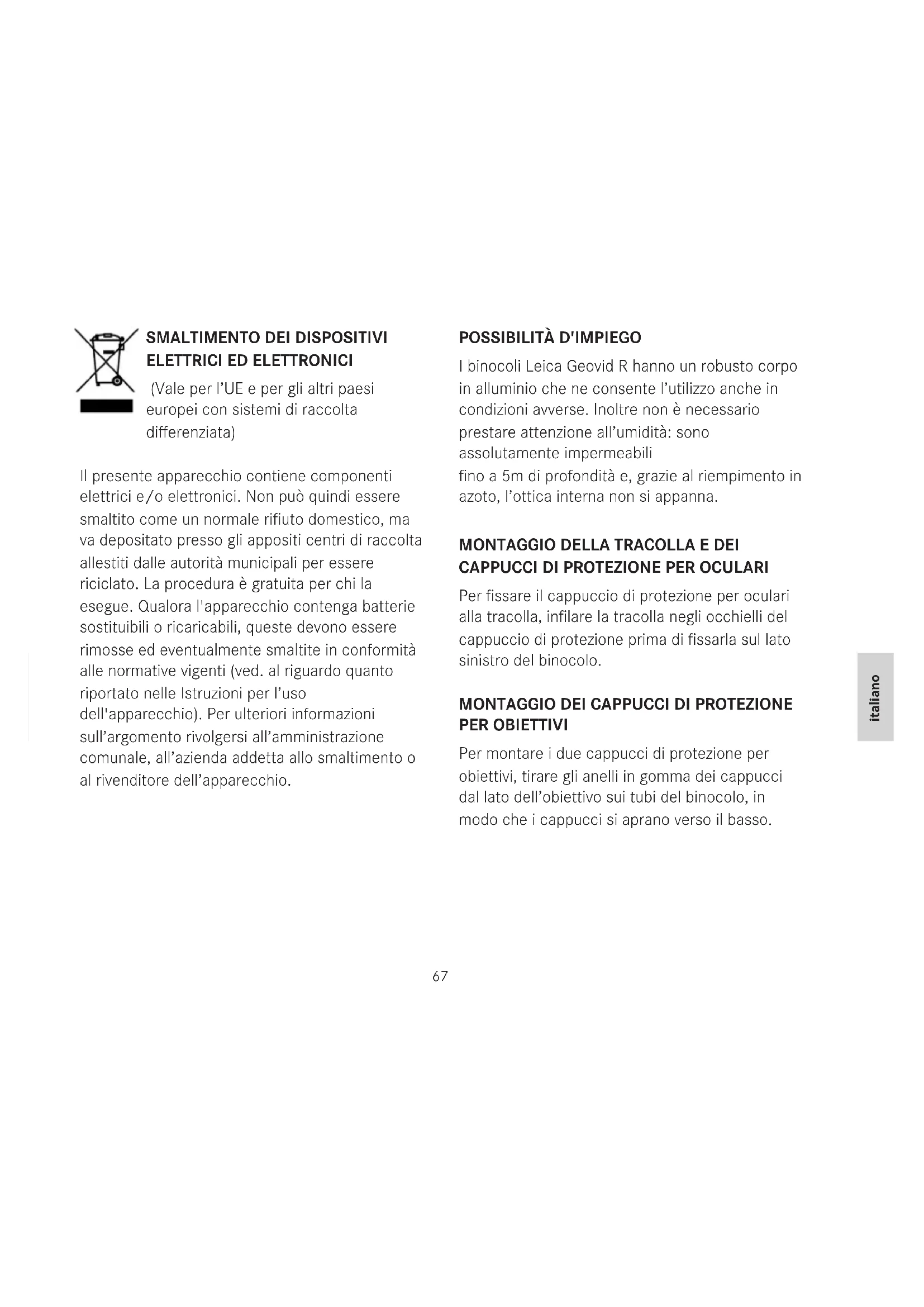 (Vale per l’UE e per gli altri paesi europei con sistemi di raccolta differenziata) Il presente apparecchio contiene componenti elettrici e/o elettronici. Non può quindi essere smaltito come un normale rifiuto domestico, ma va depositato presso gli appositi centri di raccolta allestiti dalle autorità municipali per essere riciclato. La procedura è gratuita per chi la esegue. Qualora l'apparecchio contenga batterie sostituibili o ricaricabili, queste devono essere rimosse ed eventualmente smaltite in conformità alle normative vigenti (ved. al riguardo quanto riportato nelle Istruzioni per l’uso dell'apparecchio). Per ulteriori informazioni sull’argomento rivolgersi all’amministrazione comunale, all’azienda addetta allo smaltimento o al rivenditore dell’apparecchio. POSSIBILITÀ D'IMPIEGO I binocoli Leica Geovid R hanno un robusto corpo in alluminio che ne consente l’utilizzo anche in condizioni avverse. Inoltre non è necessario prestare attenzione all’umidità: sono assolutamente impermeabili fino a 5m di profondità e, grazie al riempimento in azoto, l’ottica interna non si appanna.