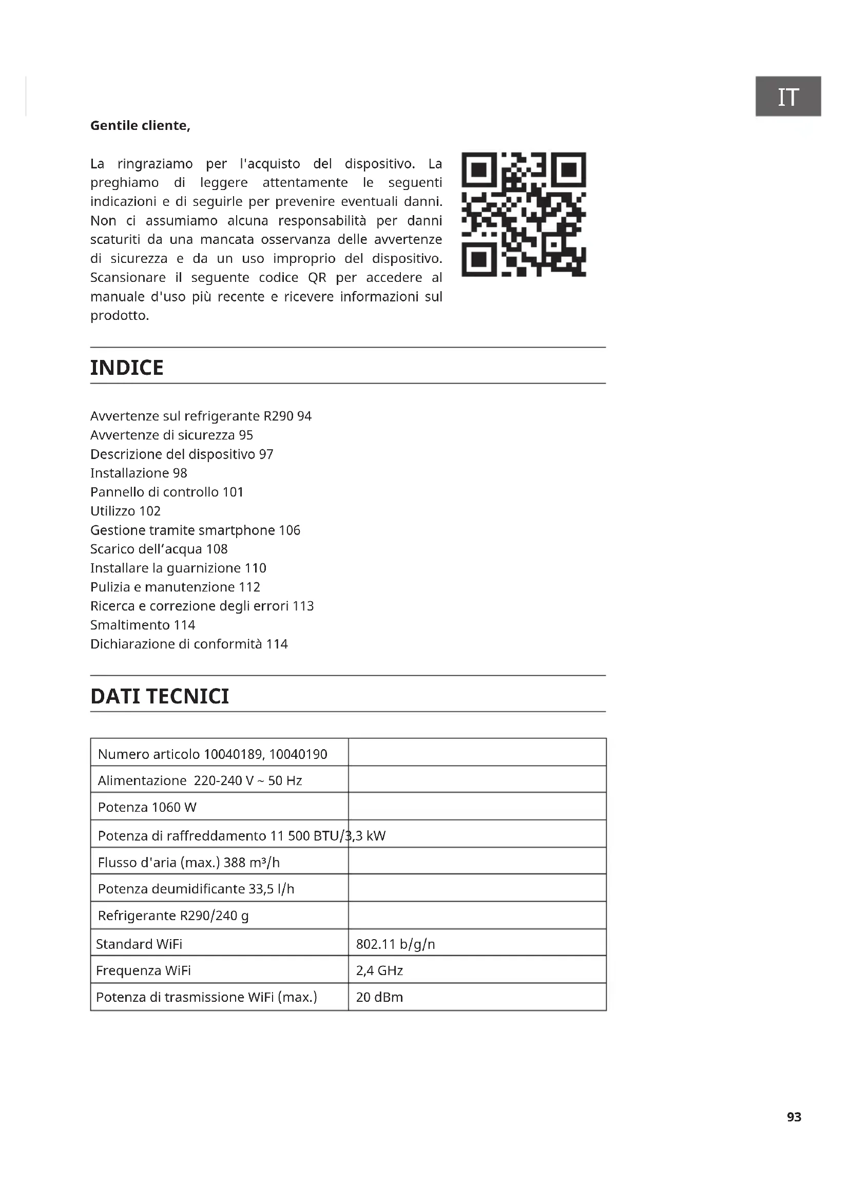 Gentile cliente, La ringraziamo per l'acquisto del dispositivo. La preghiamo di leggere attentamente le seguenti indicazioni e di seguirle per prevenire eventuali danni. Non ci assumiamo alcuna responsabilità per danni scaturiti da una mancata osservanza delle avvertenze di sicurezza e da un uso improprio del dispositivo. Scansionare il seguente codice QR per accedere al manuale d'uso più recente e ricevere informazioni sul prodotto. INDICE Avvertenze sul refrigerante R290 94 Avvertenze di sicurezza 95 Descrizione del dispositivo 97 Installazione 98 Pannello di controllo 101 Utilizzo 102 Gestione tramite smartphone 106 Scarico dell’acqua 108 Installare la guarnizione 110 Pulizia e manutenzione 112 Ricerca e correzione degli errori 113 Smaltimento 114 Dichiarazione di conformità 114 DATI TECNICI Numero articolo 10040189, 10040190 Alimentazione 220-240 V ~ 50 Hz Potenza 1060 W Potenza di raffreddamento 11 500 BTU/3,3 kW Flusso d'aria (max.) 388 m³/h Potenza deumidicante 33,5 l/h Refrigerante R290/240 g Standard WiFi
