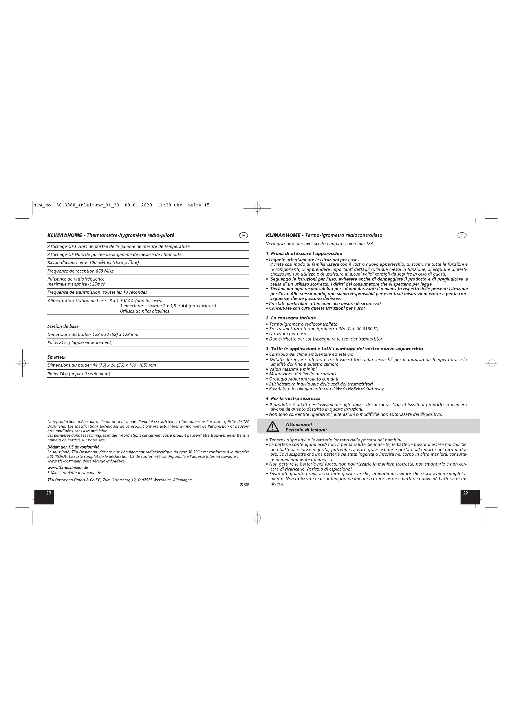 - Zwakke batterijen moeten zo snel mogelijk worden vervangen om lekkage van de batterijen te voorkomen. Gebruik nooit tegelijkertijd oude en nieuwe batterijen of batterijen van een verschil- lend type. Frequenza di ricezione 868 MHz Massima potenza a radiofrequenza trasmessa < 25mW Tempo di trasmissione ogni 10 secondi Alimentazione Stazione base : 3 batterie AA da 1,5 V (non fornite) 3 Trasmettitori: ciascuno 2 batterie AA da 1,5 V (non fornite) Utilizzare batterie alcaline Stazione base Dimensioni esterne 128 x 32 (58) x 128 mm Peso: 217 g (solo apparecchio) Trasmettitore Dimensioni esterne 44 (76) x 24 (56) x 160 (165) mm Peso 74 g (solo apparecchio) È vietata la pubblicazione delle presenti istruzioni o di parti di esse senza una precedente autorizzazione della TFA Dostmann. I dati tecnici corrispondono allo stato del prodotto al momento della stampa e possono cambiare senza preavviso. È possibile trovare dati tecnici e informazioni aggiornate sul prodotto inserendo il numero di articolo sul nostro sito. Dichiarazione di conformità UE Il fabbricante, TFA Dostmann, dichiara che il tipo di apparecchiatura radio 30.3060 è conforme alla direttiva 2014/53/UE. Il testo completo della dichiarazione di conformità UE è disponibile al seguente indirizzo Internet: www.tfa-dostmann.de/service/downloads/ce www.tfa-dostmann.de E-Mail: info@tfa-dostmann.de TFA Dostmann GmbH & Co.KG, Zum Ottersberg 12, D-97877 Wertheim, Germania 01/20 TFA_No. 30.3060_Anleitung_01_20 09.01.2020 11:28 Uhr Seite 193938 KLIMA@HOME - Draadloze thermo-hygrometer