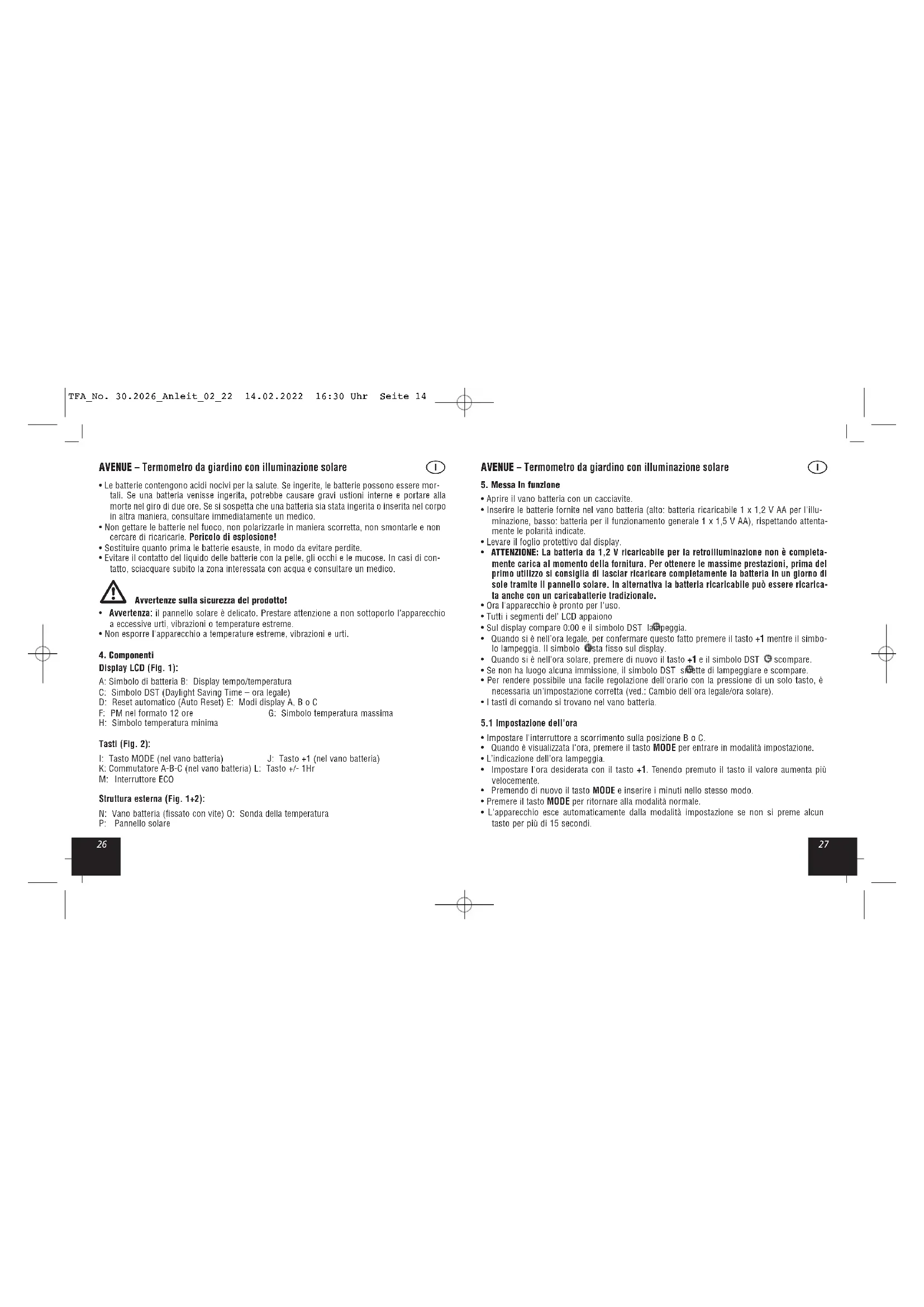 Display LCD (Fig. 1): A: Simbolo di batteria B: Display tempo/temperatura C: Simbolo DST (Daylight Saving Time – ora legale) D: Reset automatico (Auto Reset) E: Modi display A, B o C F: PM nel formato 12 ore G: Simbolo temperatura massima H: Simbolo temperatura minima Tasti (Fig. 2): I: Tasto MODE (nel vano batteria) J: Tasto +1 (nel vano batteria) K: Commutatore A-B-C (nel vano batteria) L: Tasto +/- 1Hr M: Interruttore ECO Struttura esterna (Fig. 1+2): N: Vano batteria (fissato con vite) O: Sonda della temperatura P: Pannello solare TFA_No. 30.2026_Anleit_02_22 14.02.2022 16:30 Uhr Seite 14A VENUE – Termometro da giardino con illuminazione solare