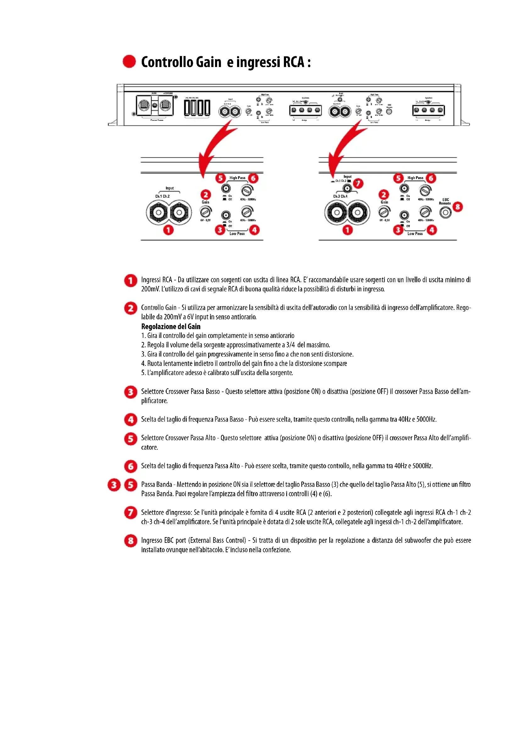 Selettore Crossover Passa Basso - Questo selettore attiva (posizione ON) o disattiva (posizione OFF) il crossover Passa Basso dell’am- plificatore. Scelta del taglio di frequenza Passa Basso - Può essere scelta, tramite questo controllo, nella gamma tra 40Hz e 5000Hz. Selettore Crossover Passa Alto - Questo selettore attiva (posizione ON) o disattiva (posizione OFF) il crossover Passa Alto dell’amplifi- catore. Scelta del taglio di frequenza Passa Alto - Può essere scelta, tramite questo controllo, nella gamma tra 40Hz e 5000Hz. Passa Banda - Mettendo in posizione ON sia il selettore del taglio Passa Basso (3) che quello del taglio Passa Alto (5), si ottiene un filtro Passa Banda. Puoi regolare l’ampiezza del filtro attraverso i controlli (4) e (6). Selettore d’ingresso: Se l’unità principale è fornita di 4 uscite RCA (2 anteriori e 2 posteriori) collegatele agli ingressi RCA ch-1 ch-2 ch-3 ch-4 dell’amplificatore. Se l’unità principale è dotata di 2 sole uscite RCA, collegatele agli ingessi ch-1 ch-2 dell’amplificatore. Ingresso EBC port (External Bass Control) - Si tratta di un dispositivo per la regolazione a distanza del subwoofer che può essere installato ovunque nell’abitacolo. E’ incluso nella confezione. Controllo Gain e ingressi RCA :25A 25A 25A 25A+12VGNDPower Fuses REM InputCh.1 Ch.2 Gain 6V - 0,2VCh.1 Ch.2SpeakersBridge