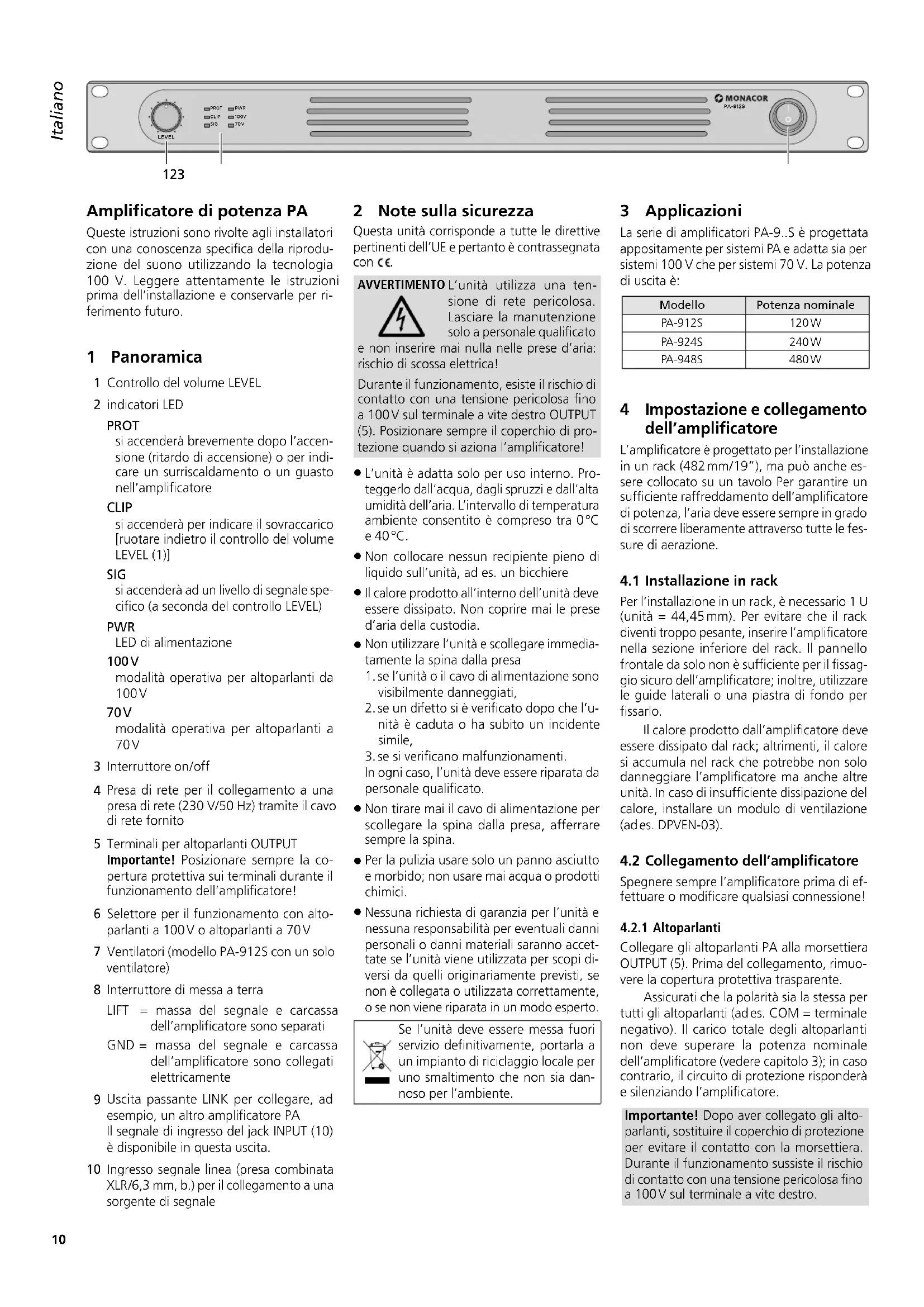 Nessuna richiesta di garanzia per l’unità e nessuna responsabilità per eventuali danni personali o danni materiali saranno accet- tate se l’unità viene utilizzata per scopi di- versi da quelli originariamente previsti, se non è collegata o utilizzata correttamente, o se non viene riparata in un modo esperto. Se l’unità deve essere messa fuori servizio definitivamente, portarla a un impianto di riciclaggio locale per uno smaltimento che non sia dan- noso per l’ambiente. 3 Applicazioni La serie di amplificatori PA-9..S è progettata appositamente per sistemi PA e adatta sia per sistemi 100 V che per sistemi 70 V. La potenza di uscita è: Modello Potenza nominale PA-912S 120 W PA-924S 240 W PA-948S 480 W 4 Impostazione e collegamento dell’amplificatore L’amplificatore è progettato per l’installazione in un rack (482 mm / 19”), ma può anche es- sere collocato su un tavolo Per garantire un sufficiente raffreddamento dell’amplificatore di potenza, l’aria deve essere sempre in grado di scorrere liberamente attraverso tutte le fes- sure di aerazione.