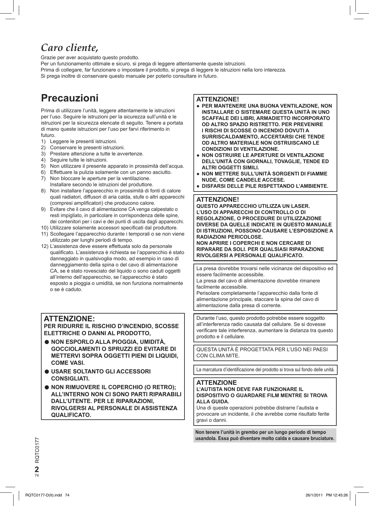 RQTC0177-D.indd 73 1/26/2011 15:00:35 Caro cliente, Grazie per aver acquistato questo prodotto. Per un funzionamento ottimale e sicuro, si prega di leggere attentamente queste istruzioni. Prima di collegare, far funzionare o impostare il prodotto, si prega di leggere le istruzioni nella loro interezza. Si prega inoltre di conservare questo manuale per poterlo consultare in futuro. Precauzioni ATTENZIONE! Prima di utilizzare l’unità, leggere attentamente le istruzioni per l’uso. Seguire le istruzioni per la sicurezza sull’unità e le istruzioni per la sicurezza elencate di seguito. Tenere a portata di mano queste istruzioni per l’uso per farvi riferimento in futuro.