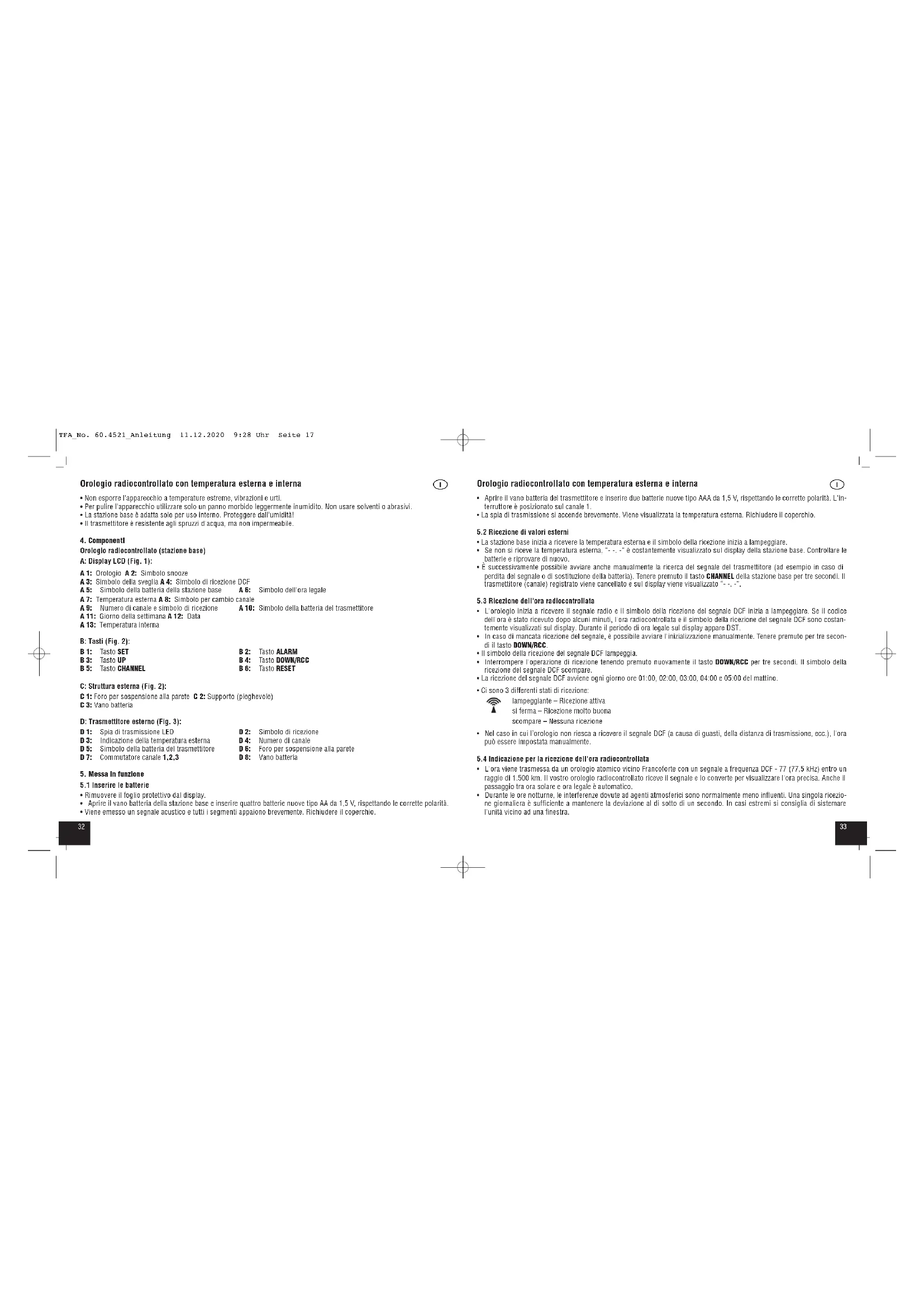 - Non sono consentite riparazioni, alterazioni o modifiche non autorizzate del dispositivo. TFA_No. 60.4521_Anleitung 11.12.2020 9:28 Uhr Seite 163332 Orologio radiocontrollato con temperatura esterna e interna